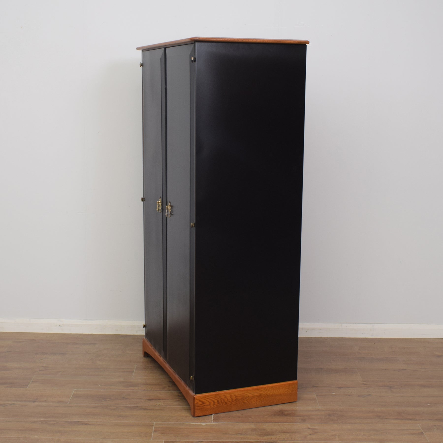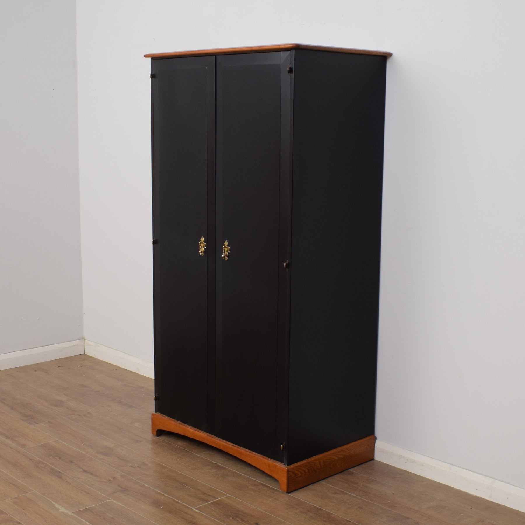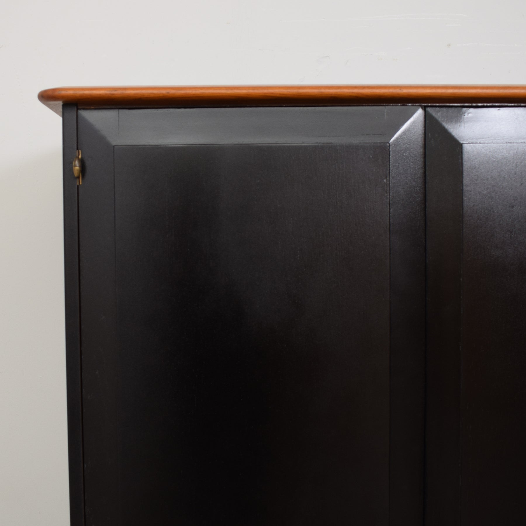 Our dedicated restoration team has revived this wardrobe by removing the original finish before applying a clear lacquer to the crown and the plinth to provide protection. The rest has been painted black to provide a striking contrast with the wood and give an appealing finish. We have also changed the handles during the restoration process. This wardrobe is constructed predominantly from cherry wood. The back panel is plywood.