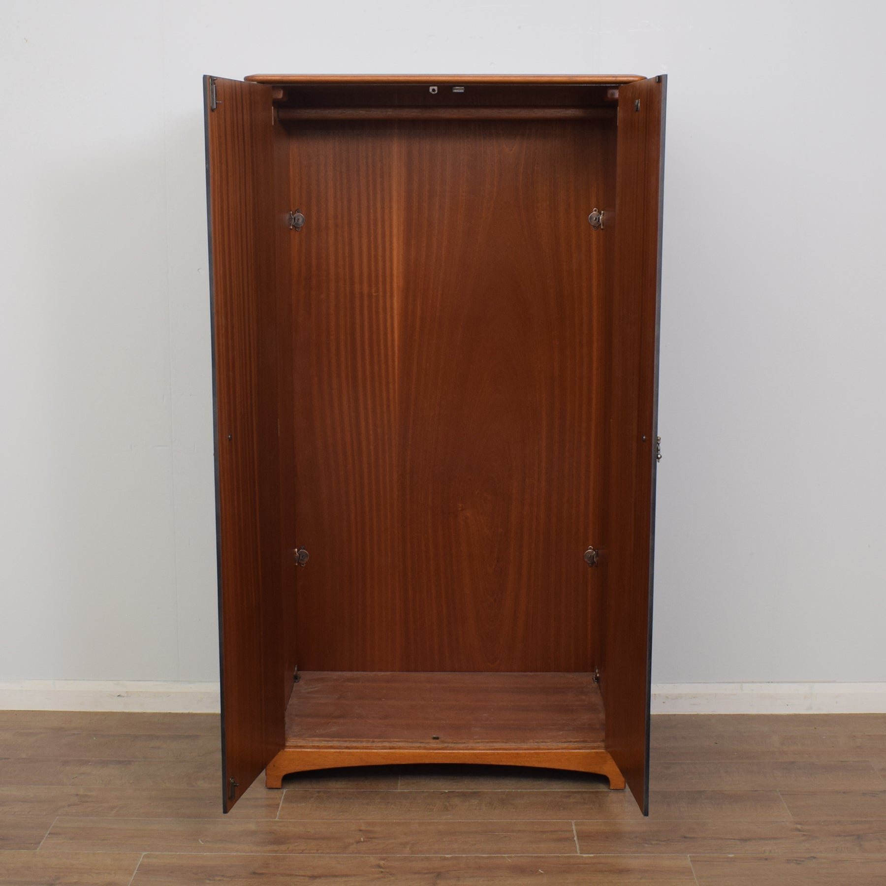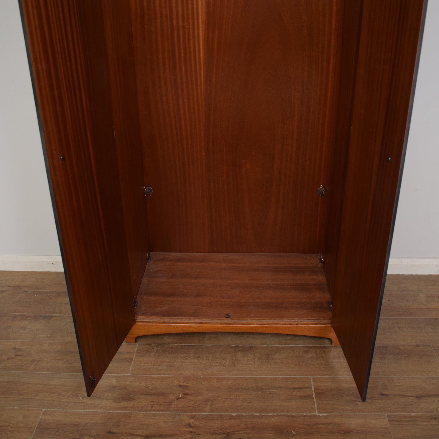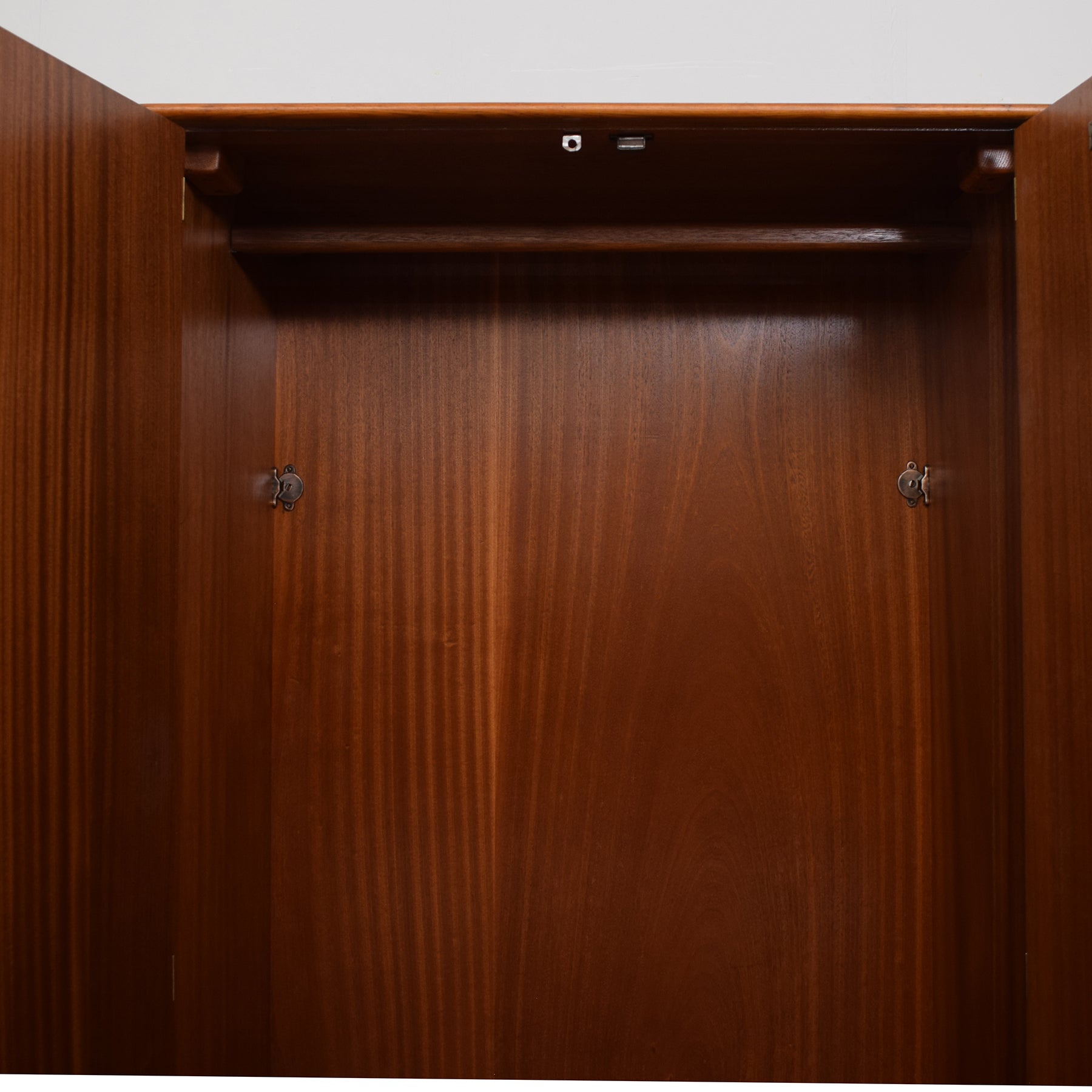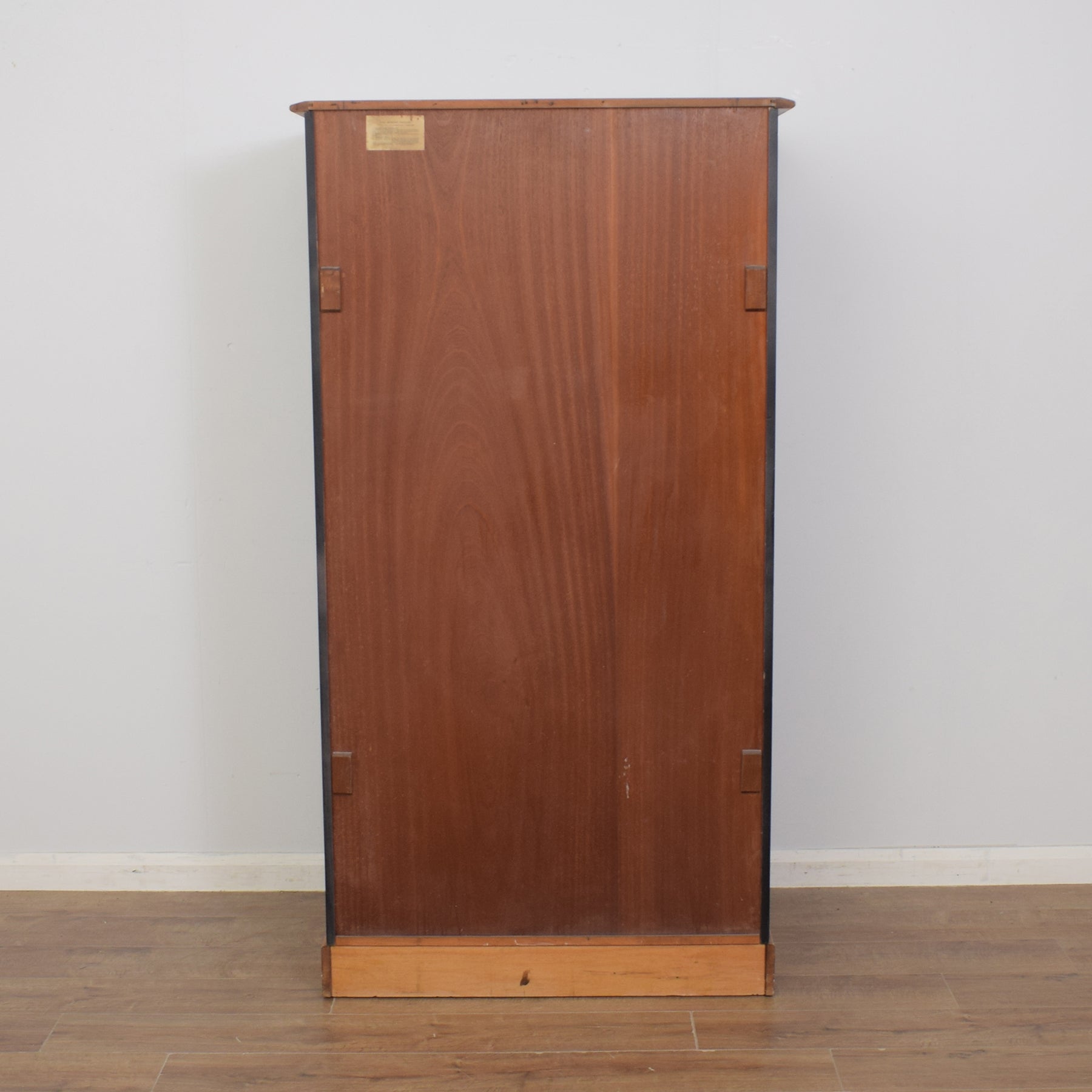 Our dedicated restoration team has revived this wardrobe by removing the original finish before applying a clear lacquer to the crown and the plinth to provide protection. The rest has been painted black to provide a striking contrast with the wood and give an appealing finish. We have also changed the handles during the restoration process. This wardrobe is constructed predominantly from cherry wood. The back panel is plywood.