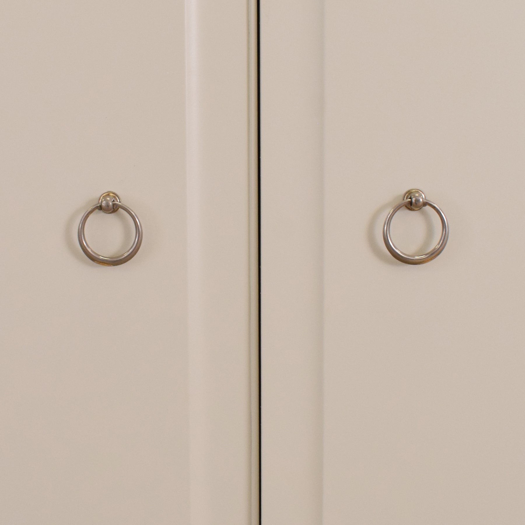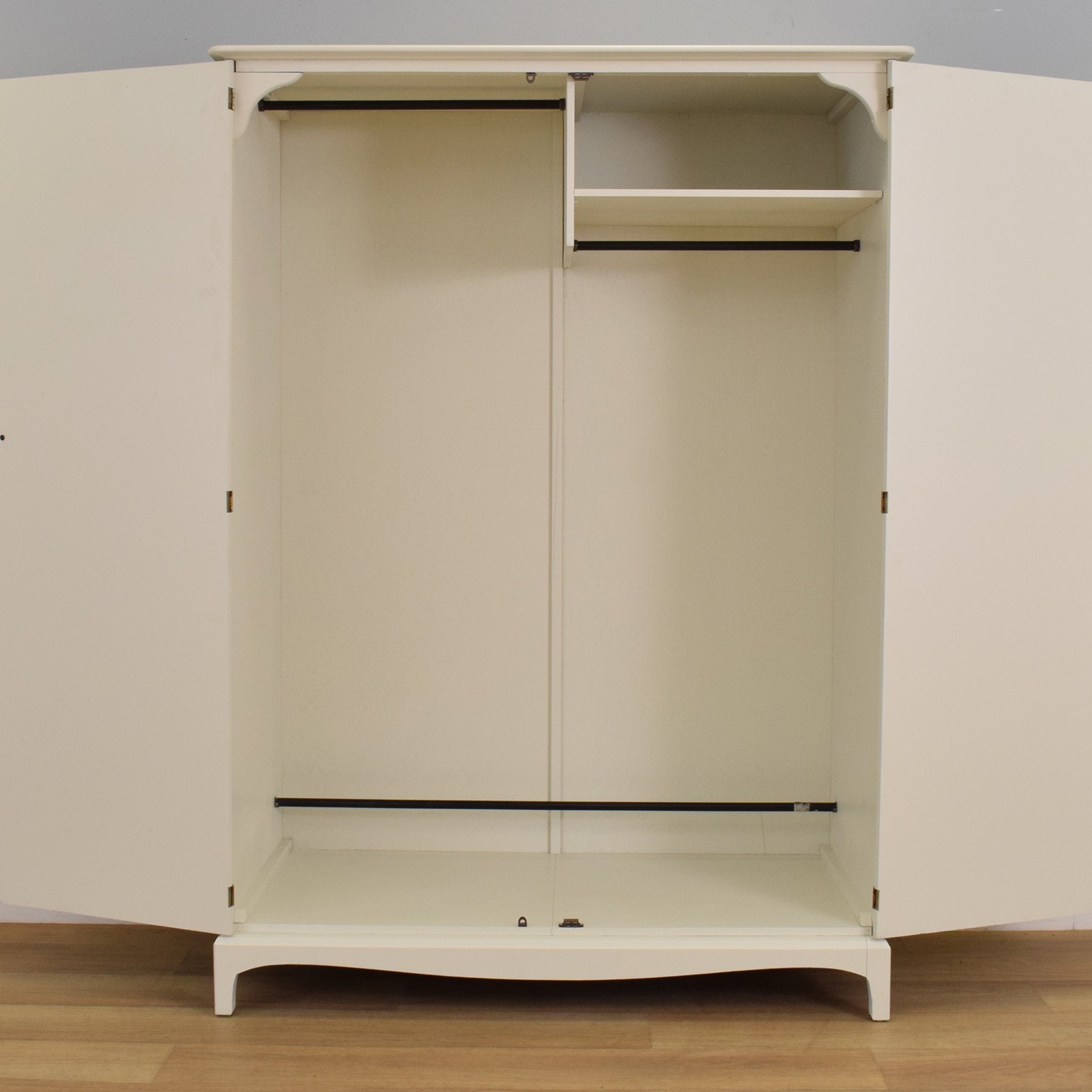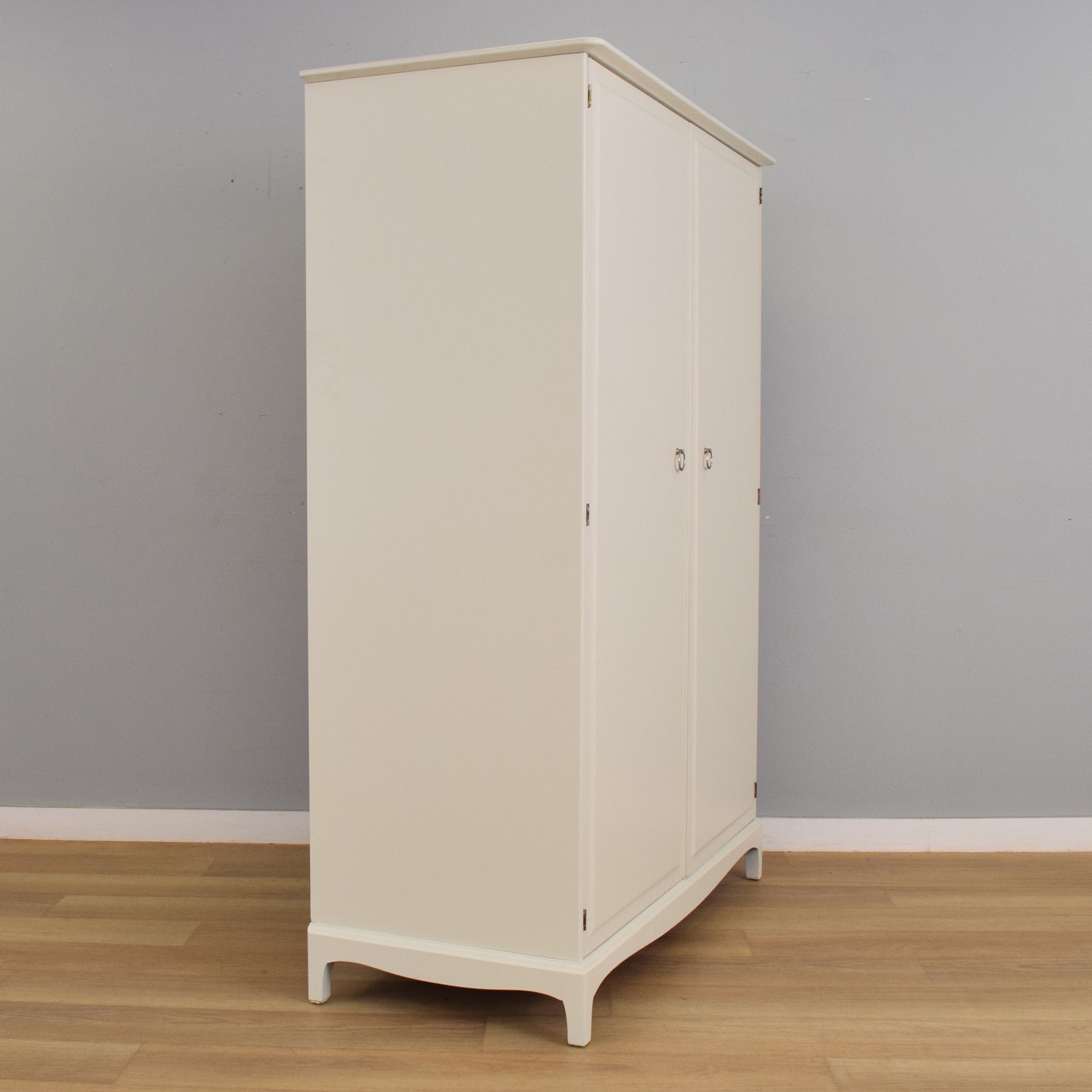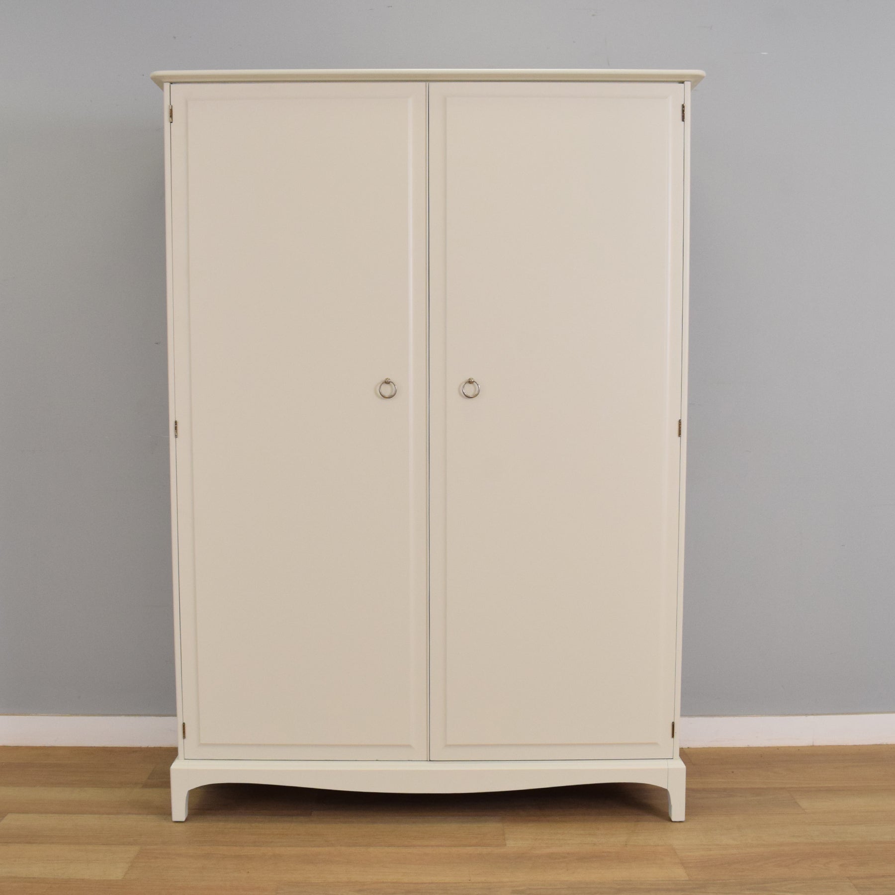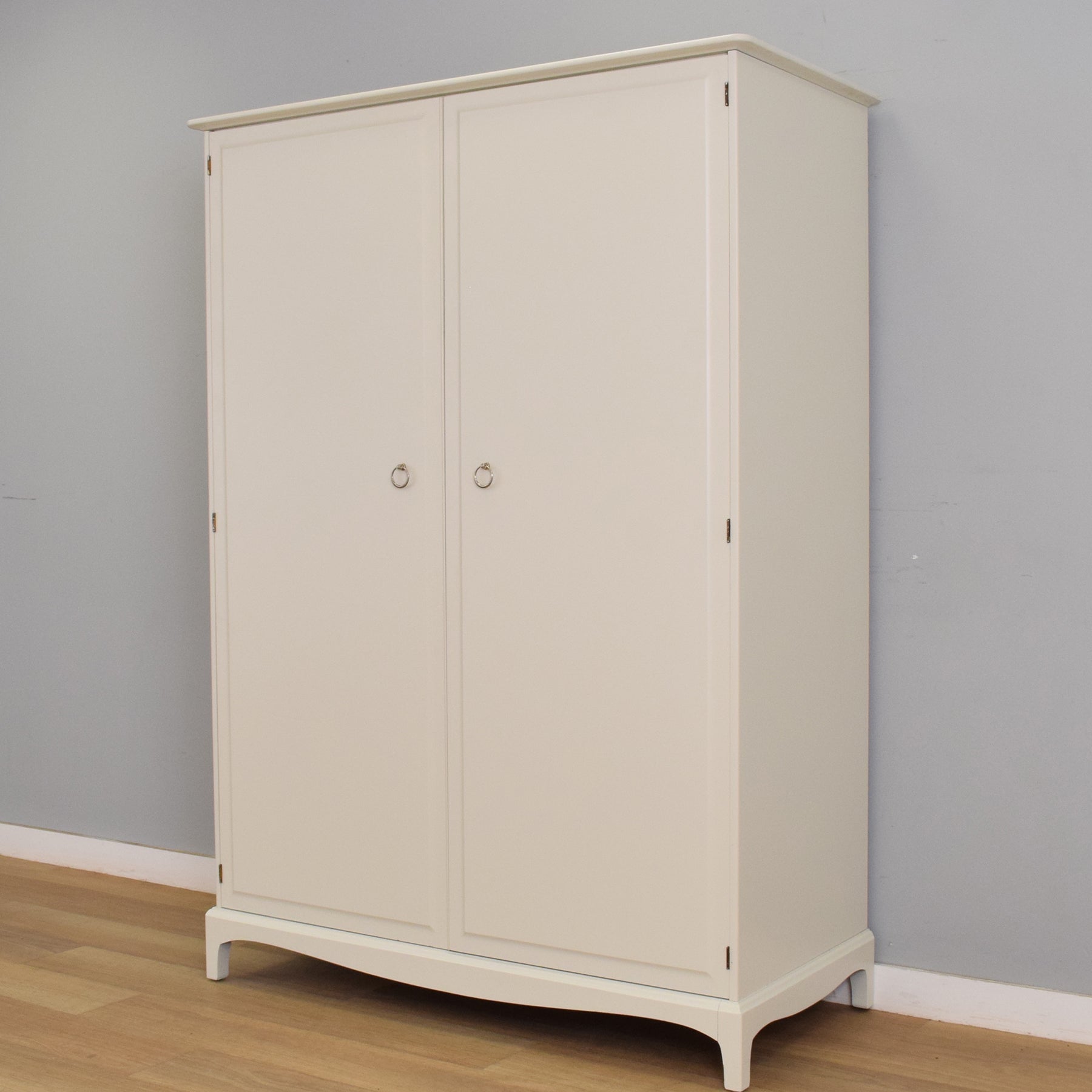 This beautifully updated double wardrobe from the iconic Stag range features clean lines, soft curves, and a timeless silhouette. Finished in a smooth, neutral-toned paint, it brings an elegant and understated charm to both modern and classic interiors. The two full-height doors open to reveal a generously sized interior, with a hanging rail on one side and a shorter rail with a shelf above on the other, offering flexible storage for longer garments, folded items, or accessories. Neat ring-pull handles in a brushed finish add a refined touch to the simple design.