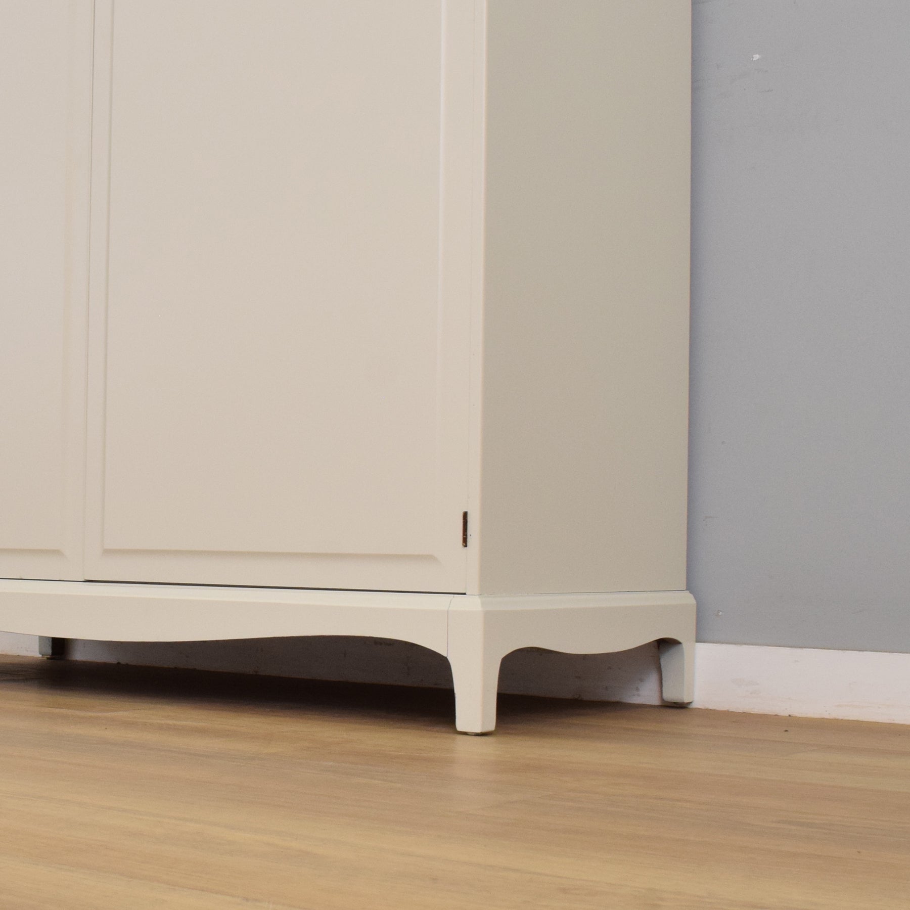 The item has been hand-sanded, cleaned, and multiple spray coats of a soft, off-white paint have been applied, creating a fresh and contemporary look while highlighting the curved base and inset panel details. This wardrobe is made from cherry wood, known for its fine grain and durability. The back and base of the item are constructed from plywood.