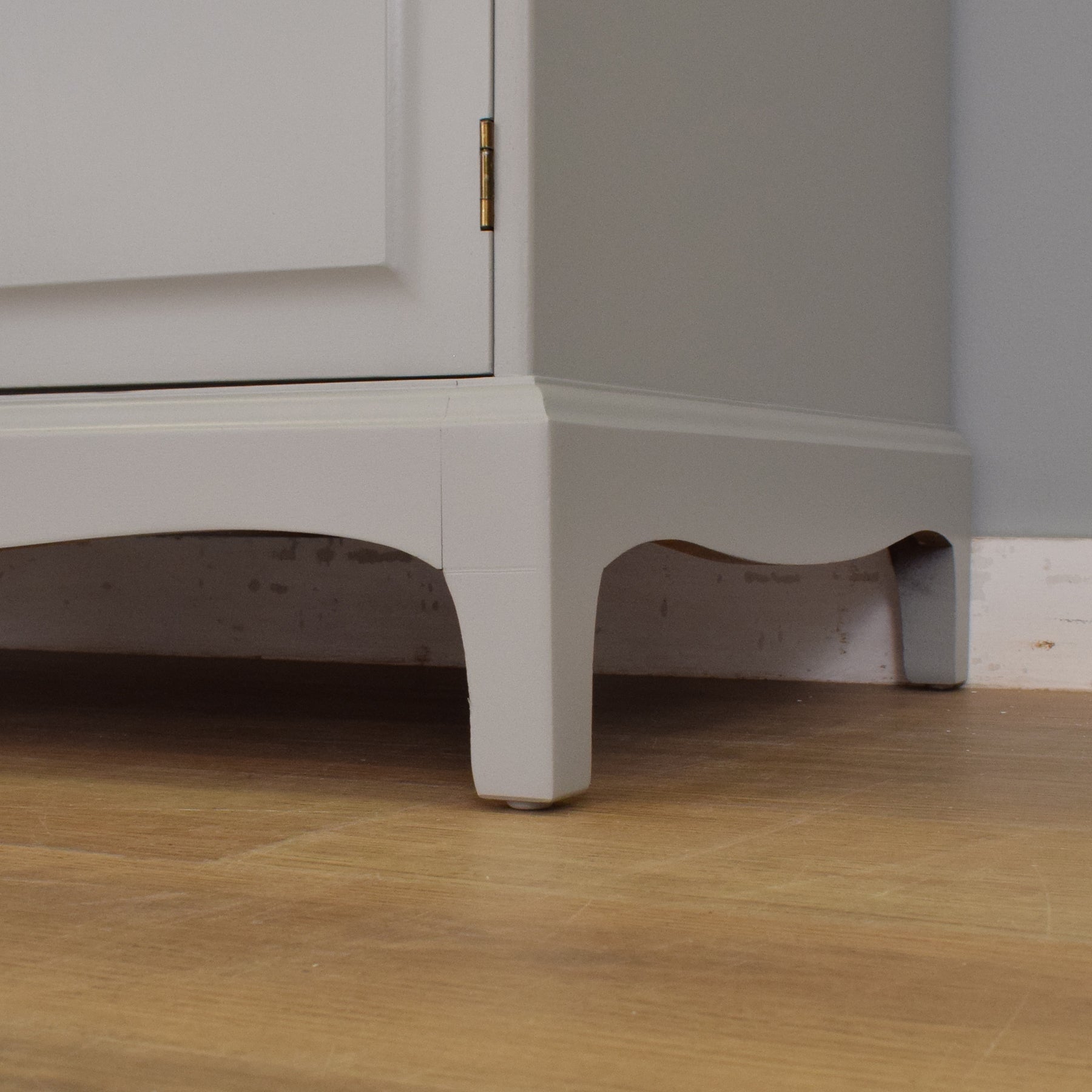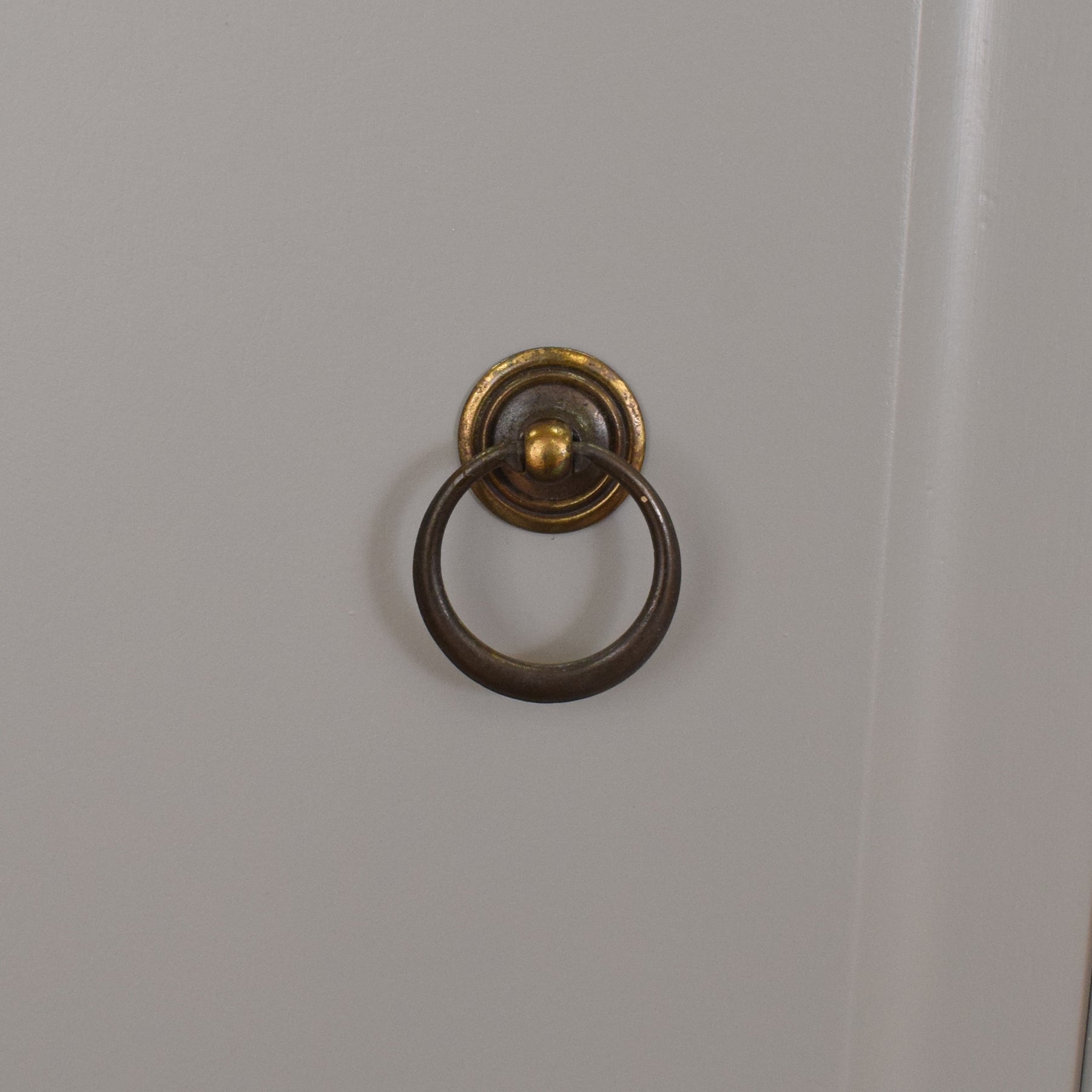 The item has been hand-sanded, cleaned, and multiple spray coats of soft grey paint have been applied, creating a smooth, consistent finish. This not only enhances the classic lines but also provides a fresh contrast to the traditional design. This item is made from cherry wood, with plywood used for the back and base.