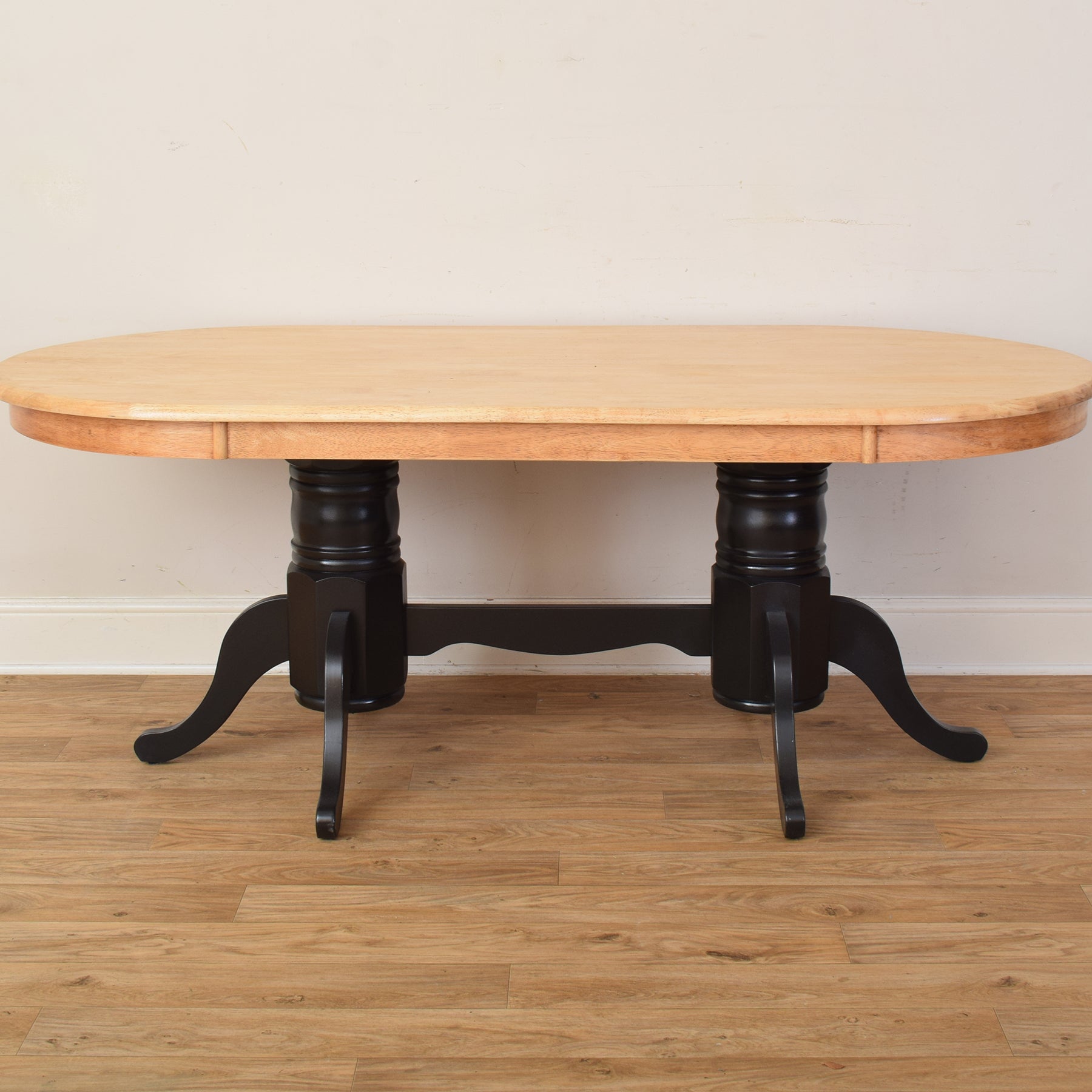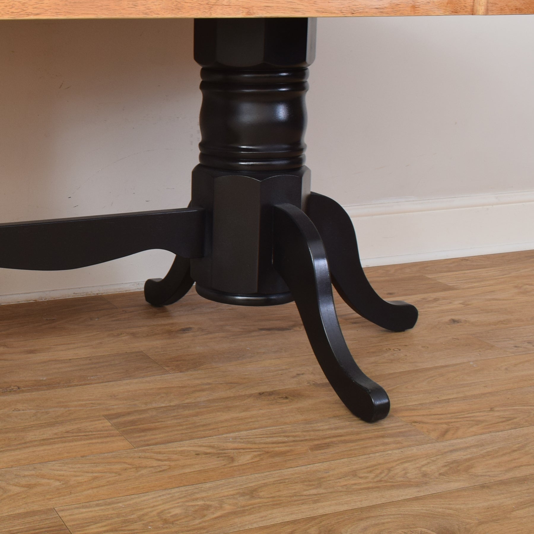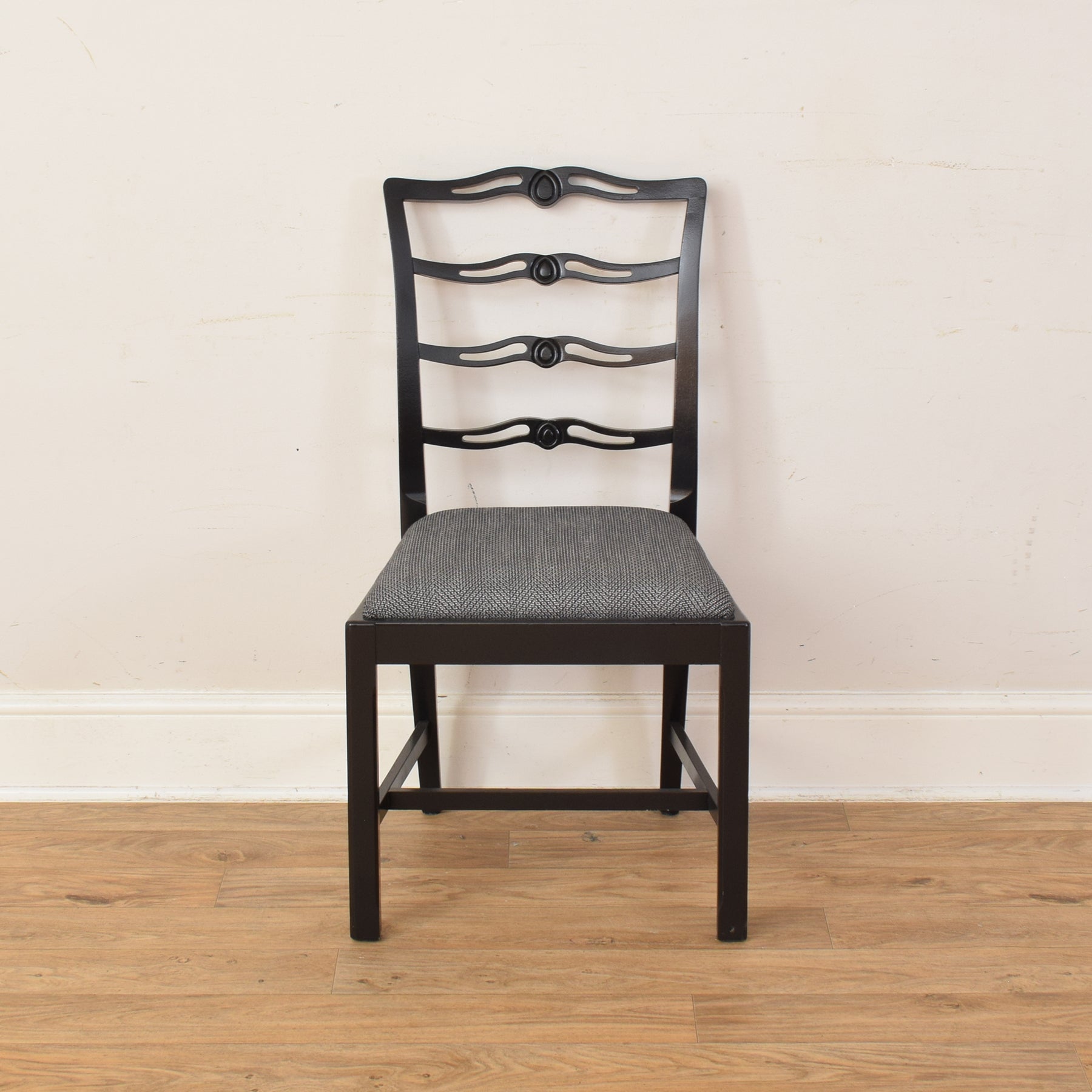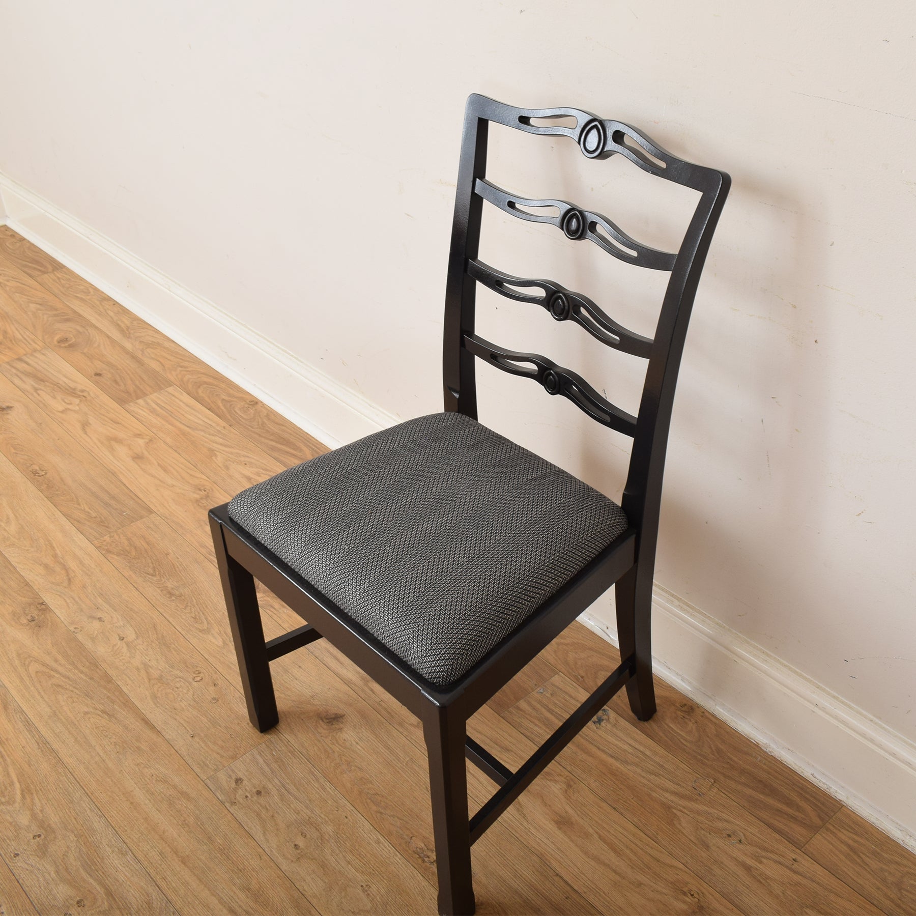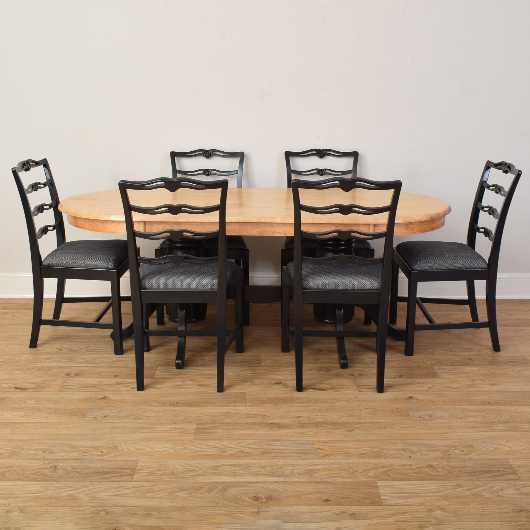 The set consists of an oval dining table and six matching chairs. The tabletop’s soft honey tone contrasts beautifully with the rich dark finish of the chair frames, painted in the shade ‘Sinner’. Each chair features a gently curved ladder back and freshly upholstered seat pads in a refined grey fabric, providing both comfort and visual appeal. Together, the combination of light wood and dark painted accents adds depth and character to the dining room.