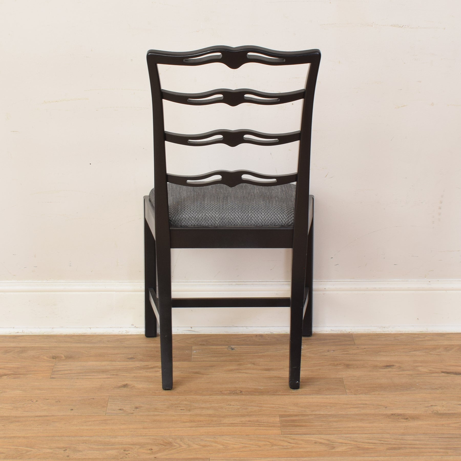 The table has been carefully restored, with the previous darker stain fully stripped away. Multiple coats of hard-wearing matte lacquer have been applied to the tabletop, enhancing the grain and ensuring lasting protection. The chair frames have been hand-prepared and spray-painted in ‘Sinner’, followed by a protective lacquer coat for a smooth, durable finish. The seats have been re-upholstered in a high-quality grey fabric to complement the darker tones. This set is made entirely from solid beech.