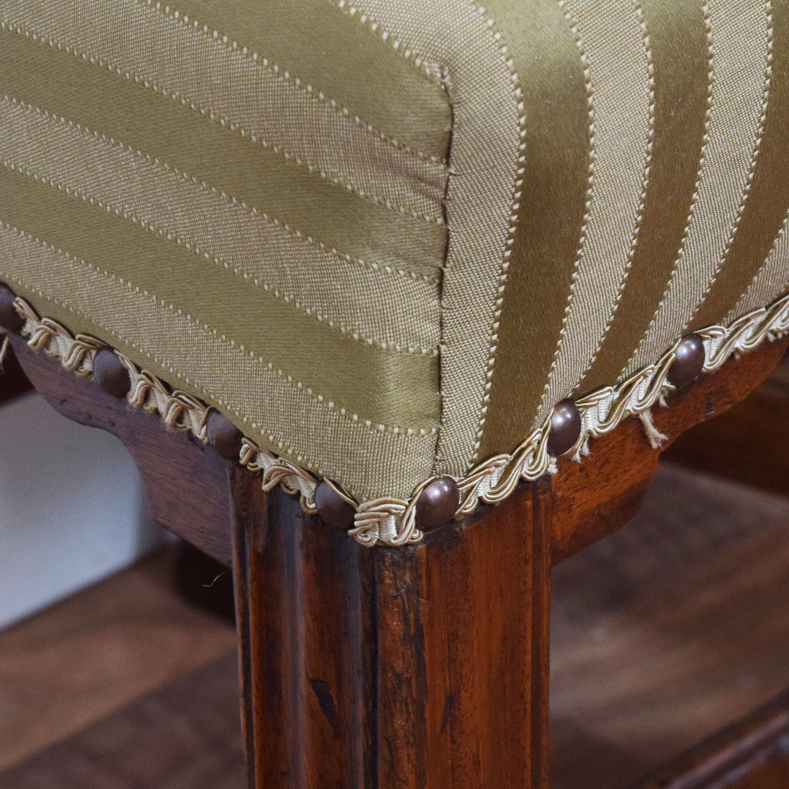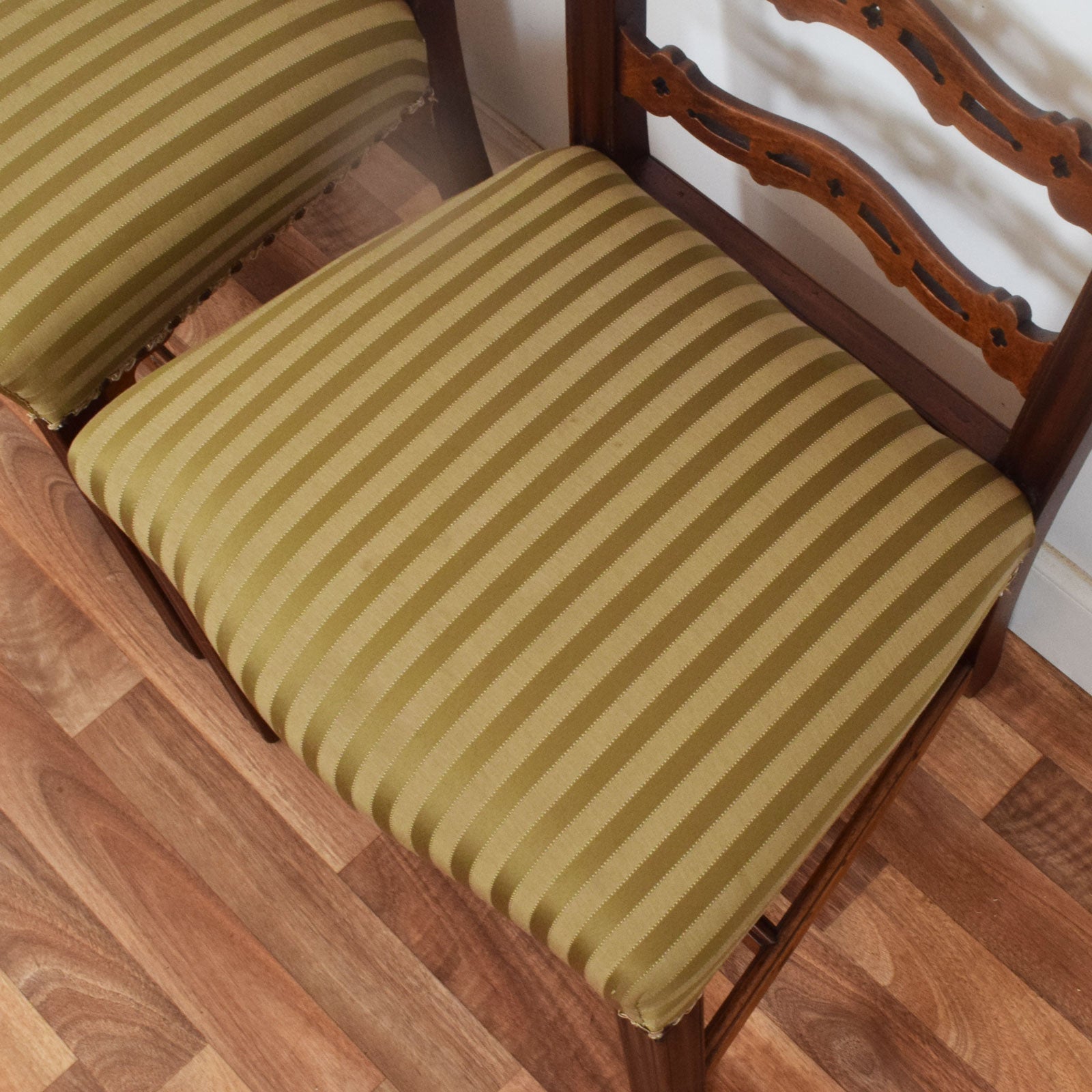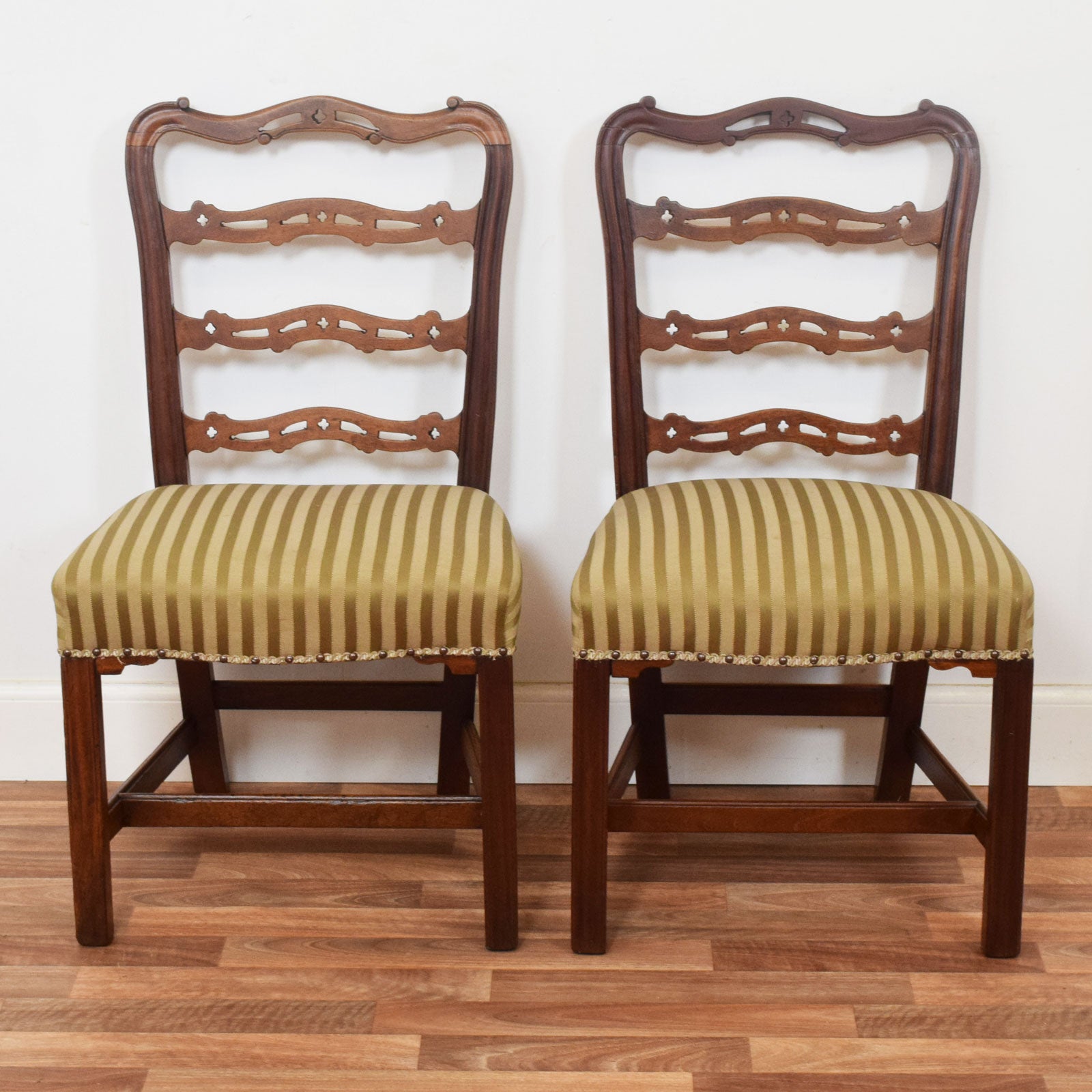 Each chair features three shaped and pierced horizontal splats framed by a softly curved top rail with scroll-end detailing. The square legs are connected with a box stretcher for added stability, and the seat bases are traditionally upholstered in the original striped olive-green fabric, finished with braid and brass studs for a period touch. The seats are well-padded and generously sized for comfort.
