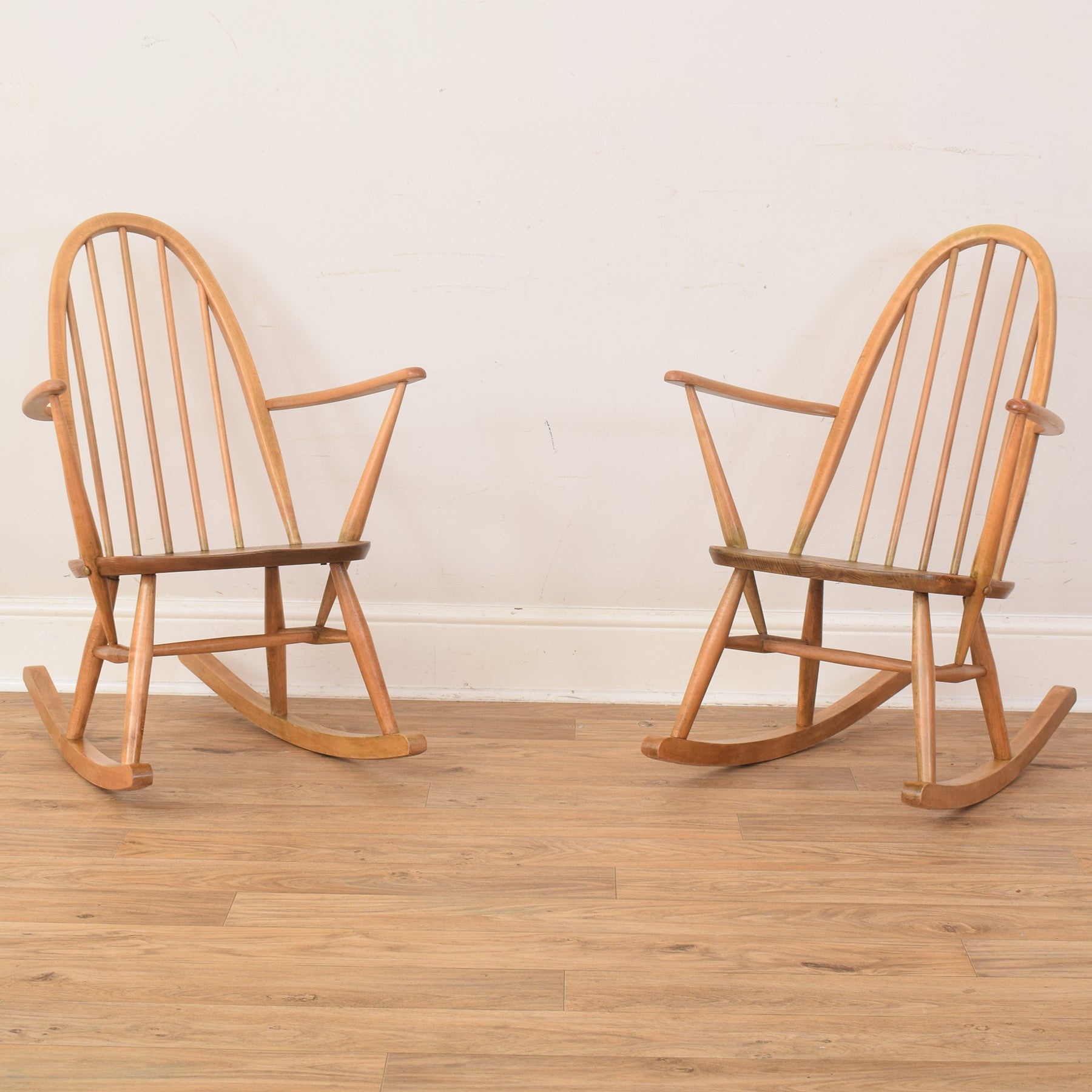 Combining craftsmanship, comfort, and understated elegance, this pair of Ercol rocking chairs would make a delightful addition to any stylish and relaxing interior.