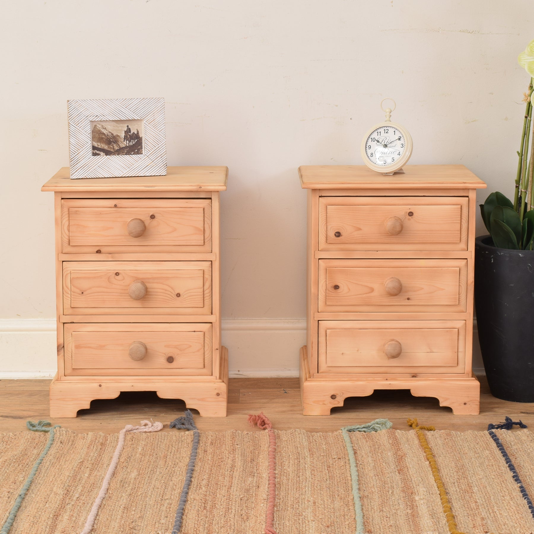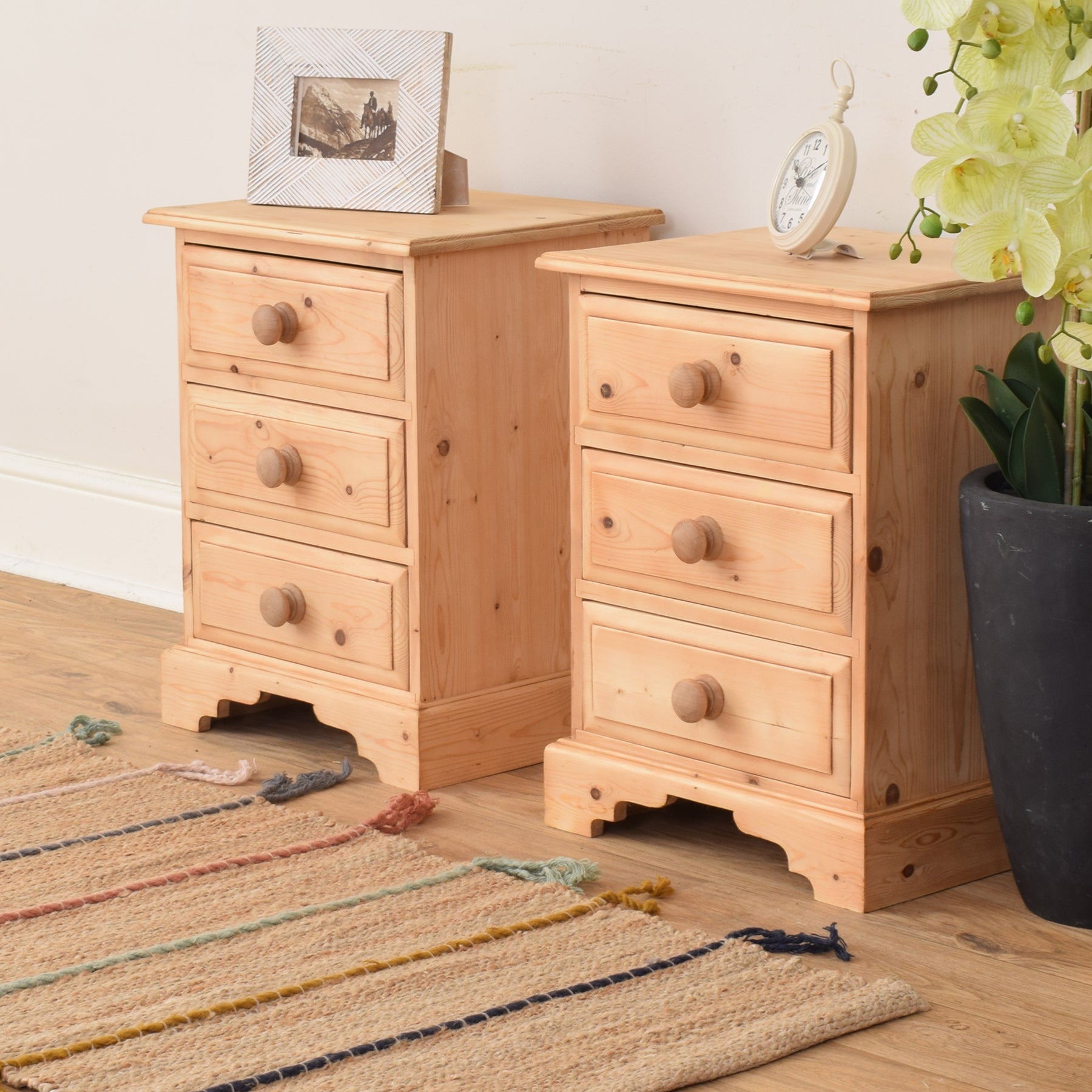 A thoughtfully furnished bedroom benefits from well-matched pieces that offer both practicality and charm. This pair of pine bedside cabinets brings warmth and character to any sleeping space, ideal for traditional or country-style interiors. Their compact size and classic styling make them a versatile addition beside any bed.
