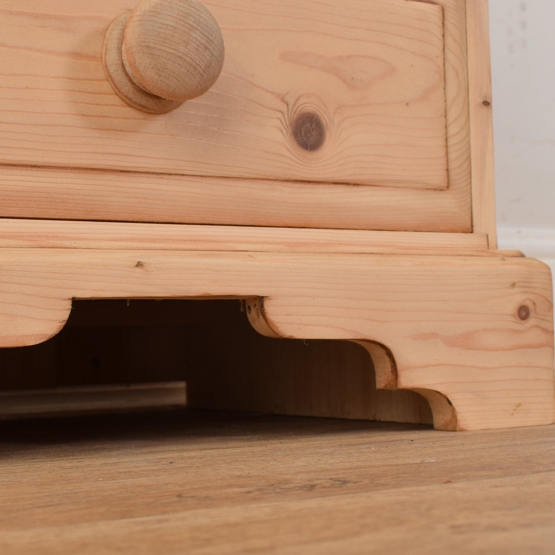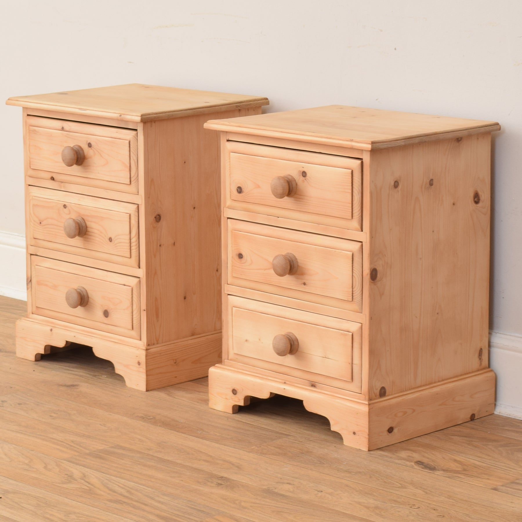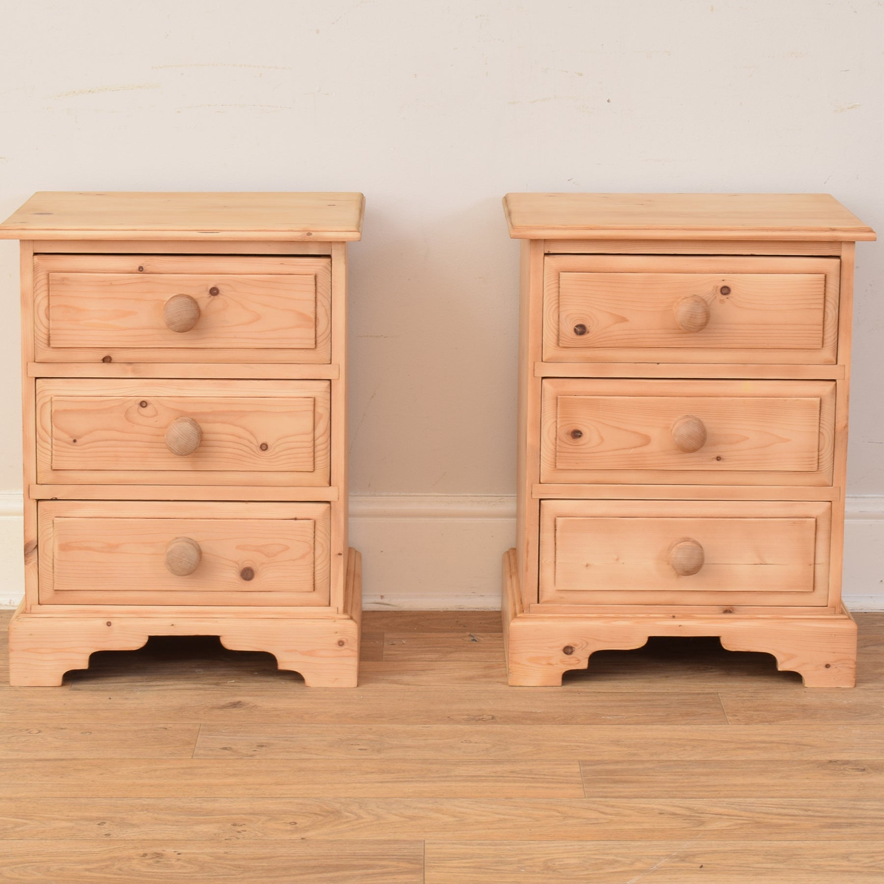 Each cabinet features three drawers with wooden knob handles, providing convenient storage for nighttime essentials. The cabinets stand on gently shaped bracket feet, adding a touch of decorative detail while maintaining a sturdy profile. The natural grain patterns and subtle knots in the pine lend a rustic authenticity to the overall look.