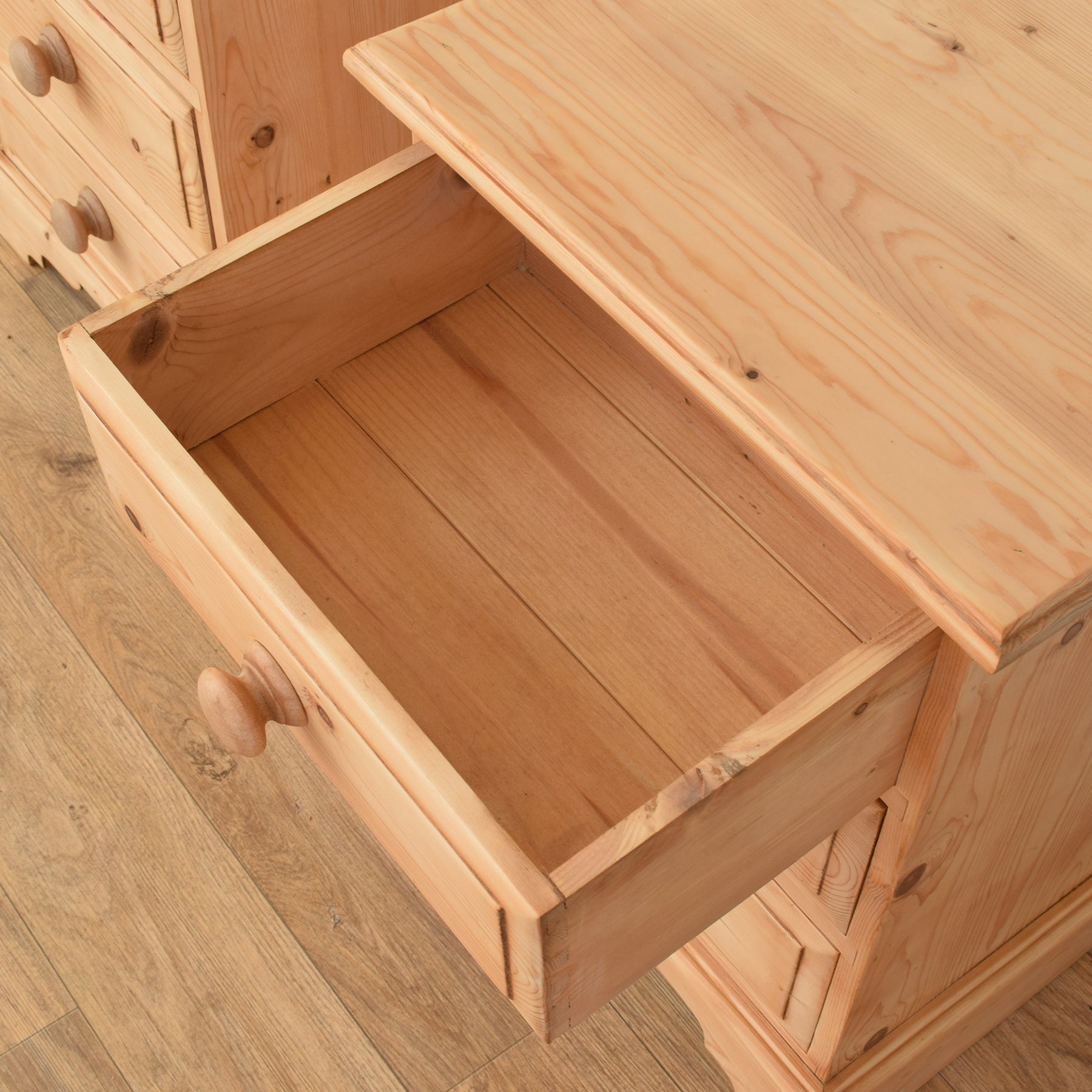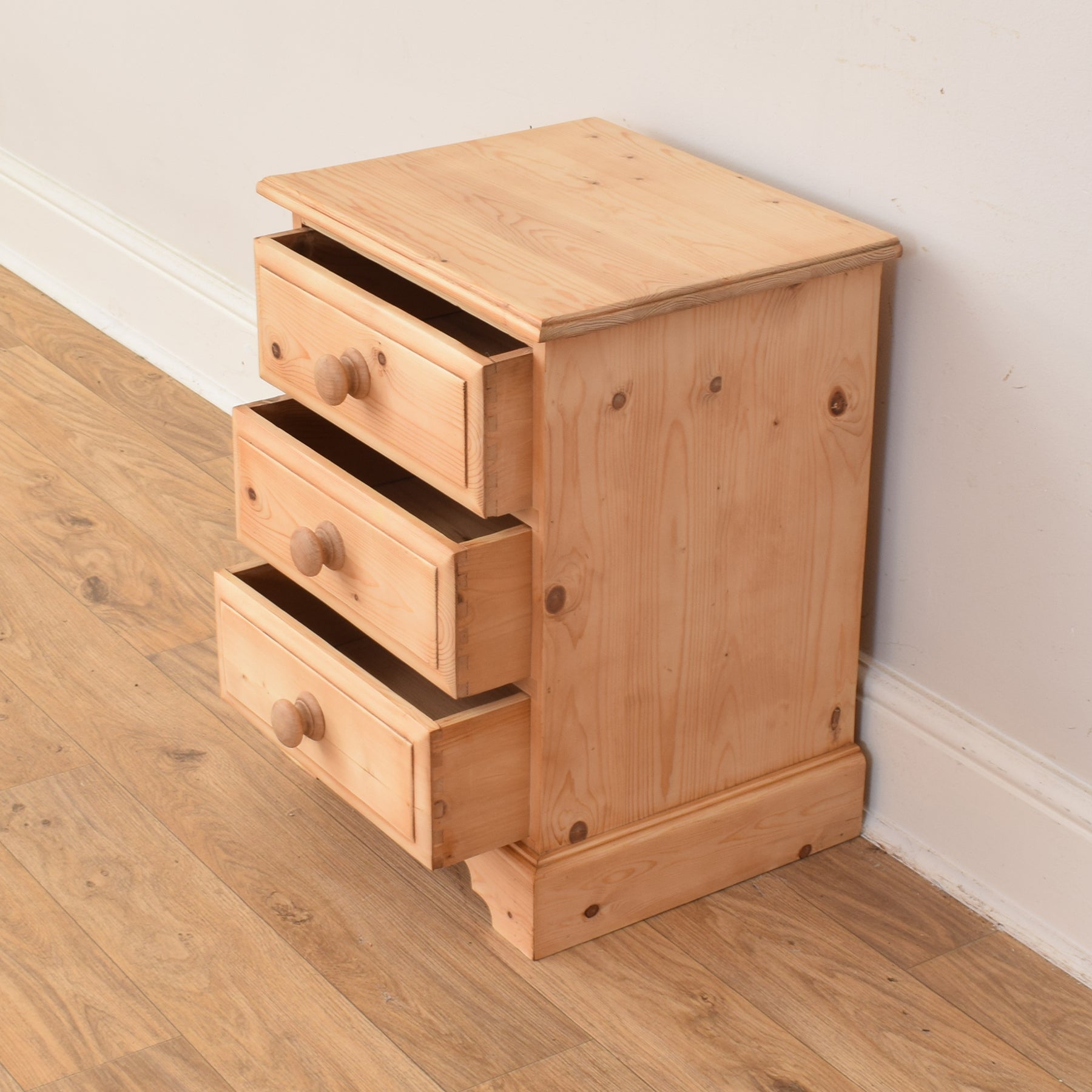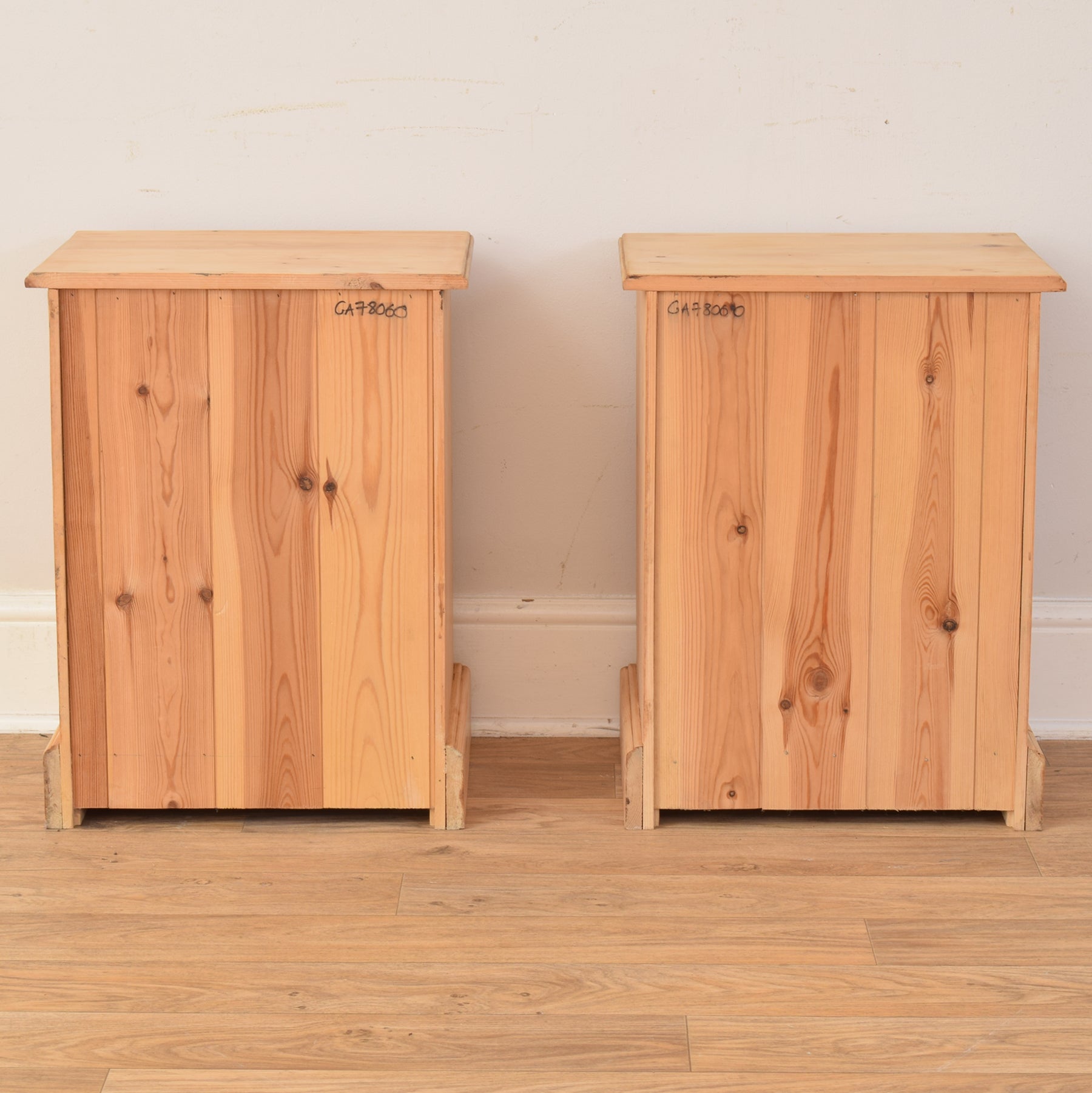 The pair has been carefully cleaned and waxed, enhancing the natural finish and protecting the wood surface. This process brings out the variation in tone and grain, while ensuring a smooth and well-maintained appearance. These items are made entirely from solid pine.