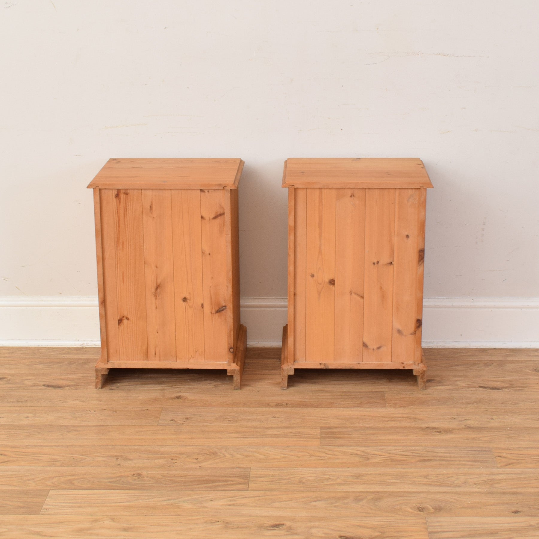 The previous finish has been stripped back to the bare wood, and the pair has been carefully sanded before being waxed, resulting in a smooth, natural finish that enhances the character of the pine grain. The waxed surface offers gentle protection while maintaining an authentic, soft sheen. This pair is made entirely from solid pine.