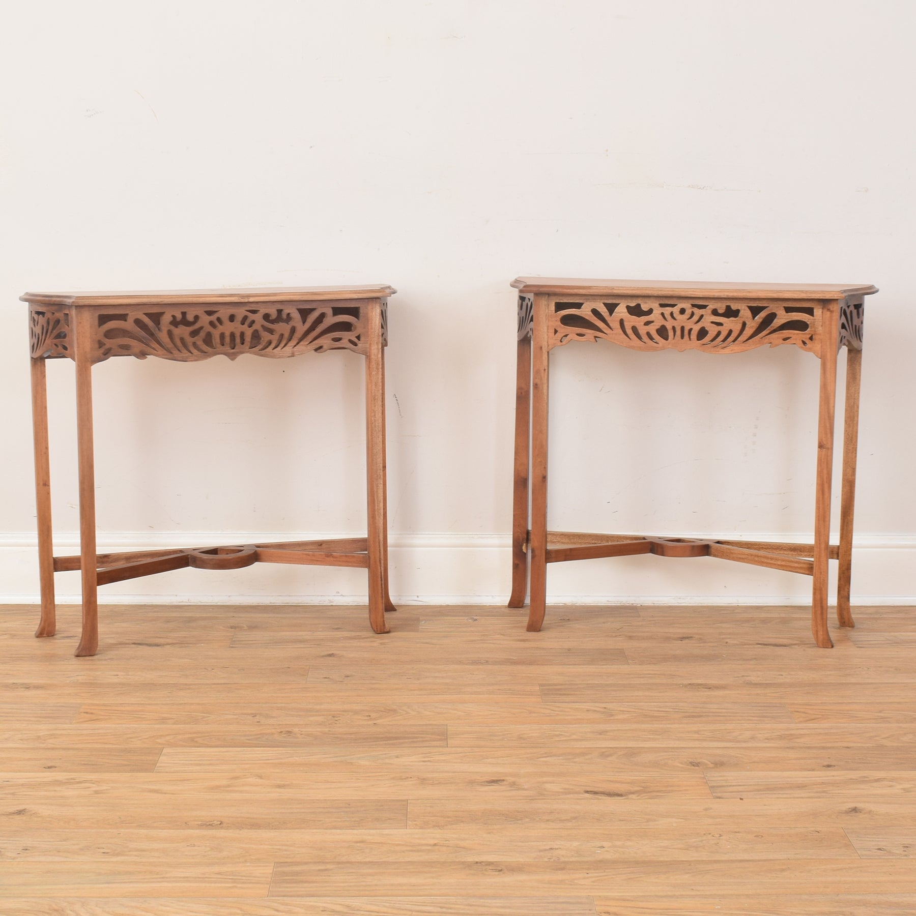 Each table features a delicately curved front and beautifully detailed open fretwork to the apron, adding a light and decorative touch to the design. The slender, tapering legs are joined by a low stretcher for added stability, enhancing the graceful profile of the pair. The grain pattern on the sapele tops is particularly striking, with flowing variations and natural contrast that give each table its own unique character.