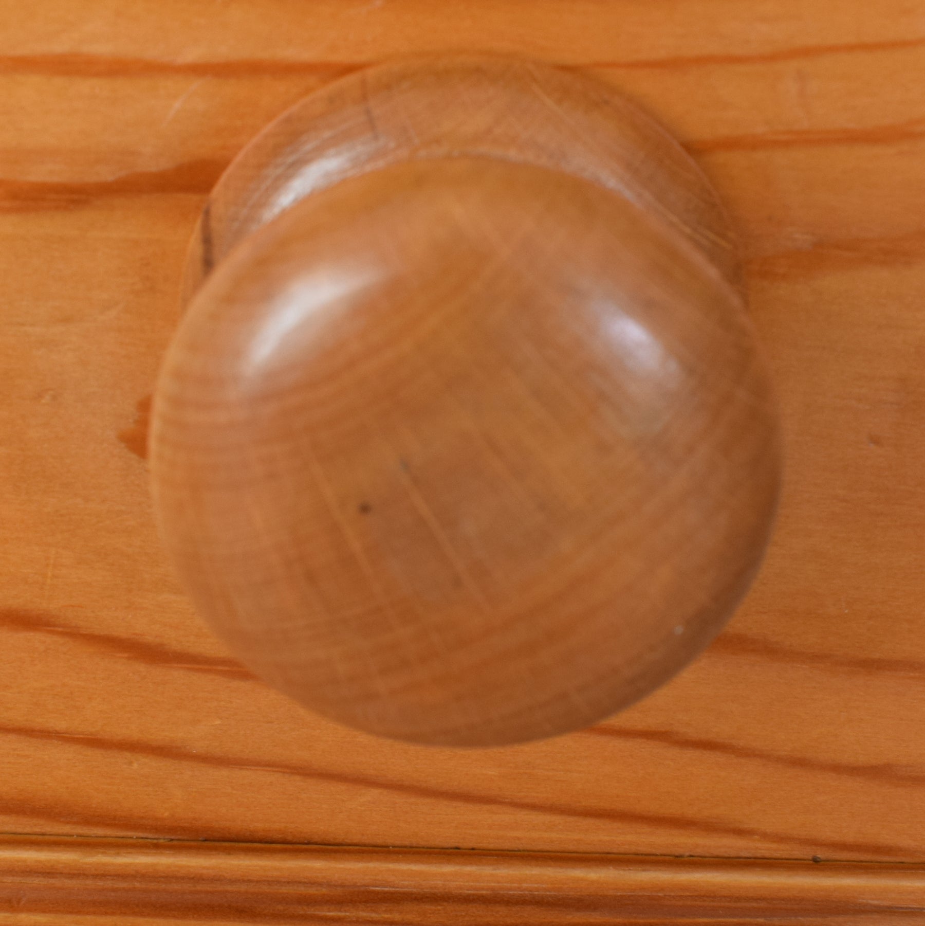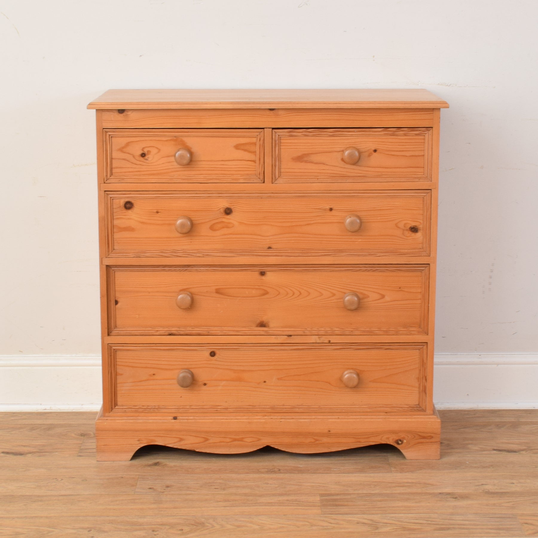 This pine chest of drawers offers a neat, traditional design with five drawers arranged in a practical layout: two smaller drawers at the top and three wider drawers beneath. Its rounded wooden knobs and gentle curves along the lower edge contribute to a classic look, while the visible grain pattern and small natural knots give it a warm, rustic charm. The compact proportions make it suitable for both larger rooms and smaller spaces where reliable storage is still needed.