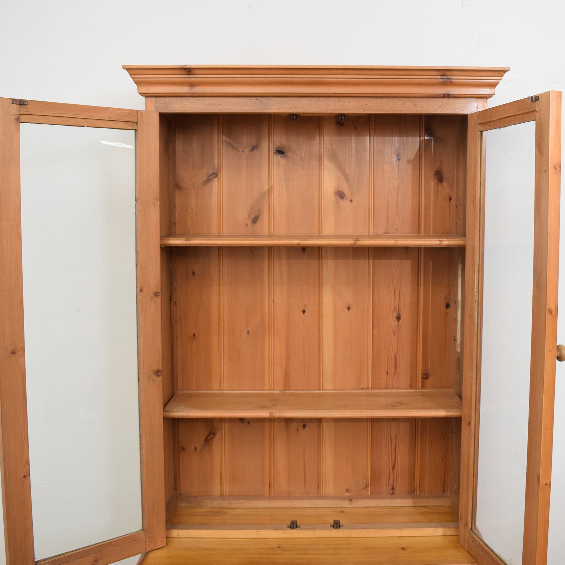 This cabinet features a lower cupboard section, for items that are best kept out of sight, topped by a glazed display cabinet, with two adjustable shelves, for showcasing favourite ornaments and collectables. This combination provides a good balance of concealed storage and display space, ideal for crockery, books, or decorative items. The simple lines and visible knots in the pine give the piece a straightforward, country-style character.