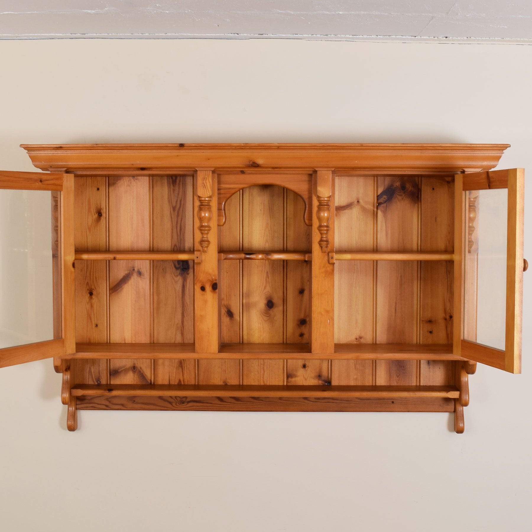 This Pine wall cupboard features two glazed doors, with a central section in between. Each section is equipped with a shelf in the middle, providing ideal storage for family photographs or various household ornaments. Additionally, there is a small lower shelf that can be utilised for keys or other personal items.