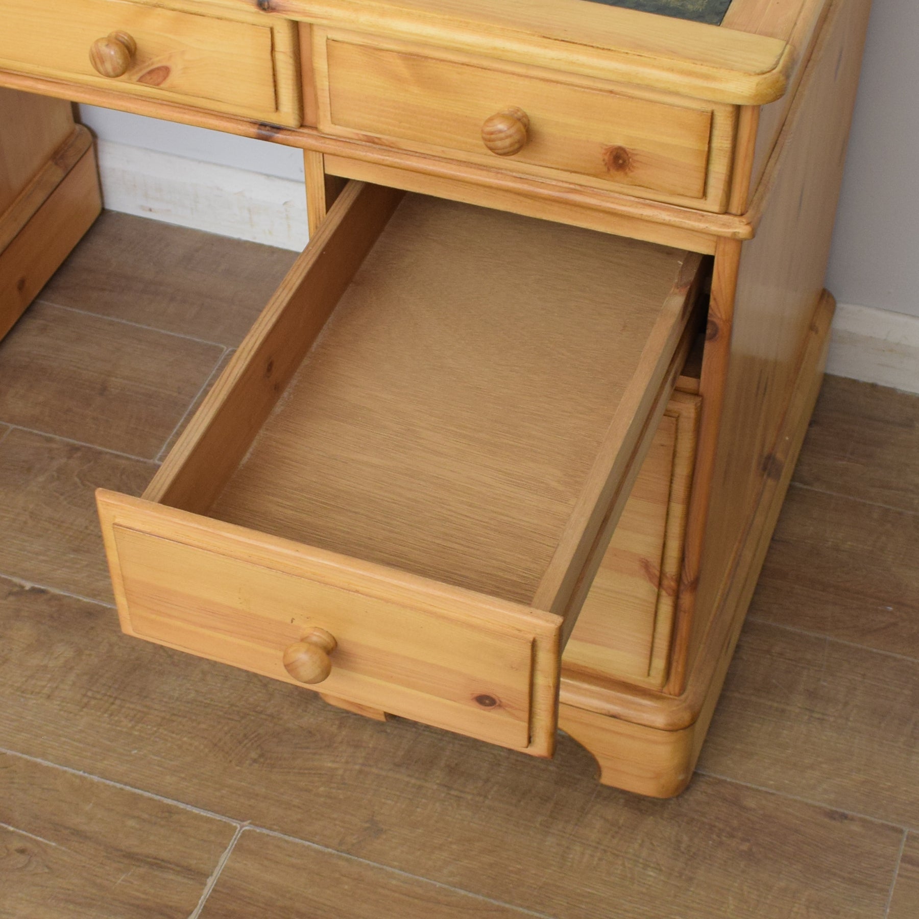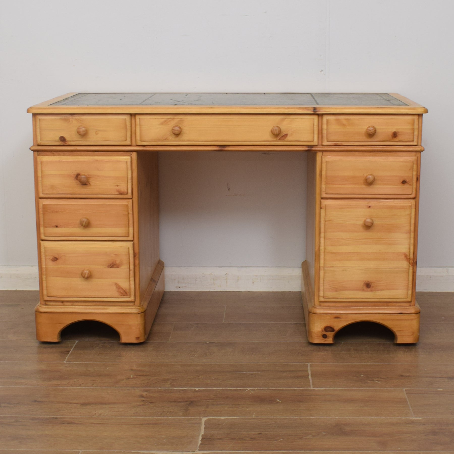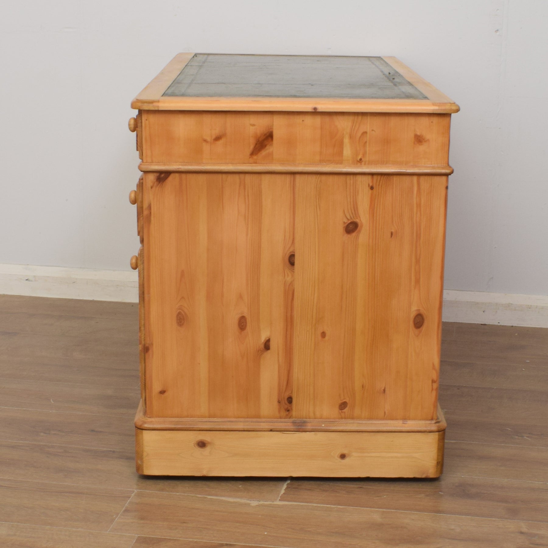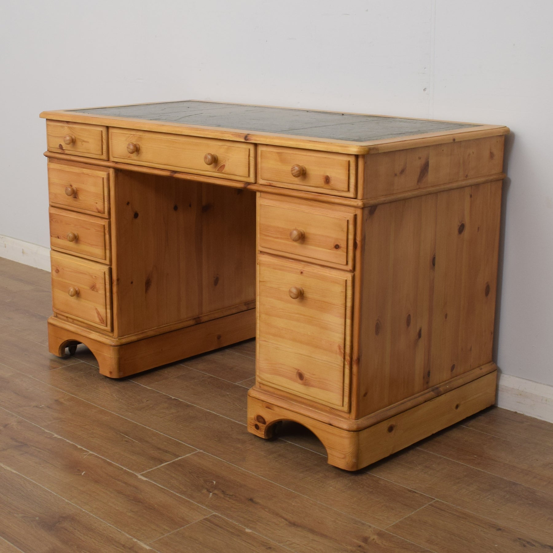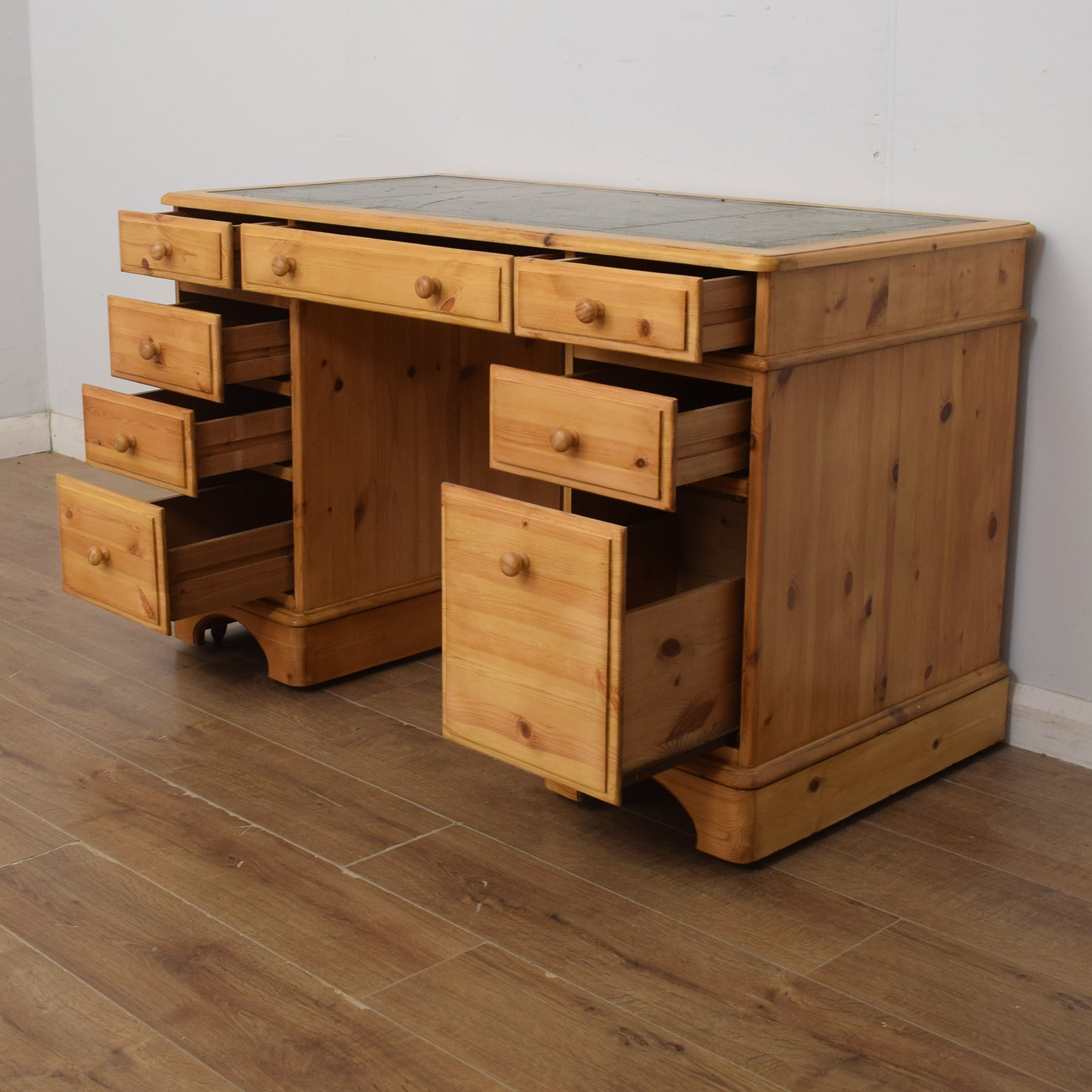 The spacious desktop has ample room for a computer keyboard and screen, or a laptop, along with a desk lamp, books and other items. There are a couple of marks on the leather writing pad, that you can see in the photos; however, it is generally in good condition. This top section then has a wide central drawer with a smaller drawer on each side. This is supported by a three-drawer pedestal on the left and a two drawer pedestal on the right which has a deep bottom drawer, providing ample storage for various items. This practical desk is made of solid pine with plywood used for the drawer bases.