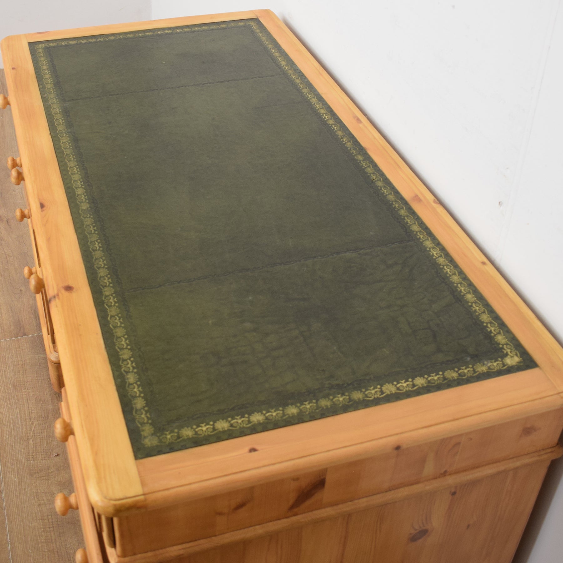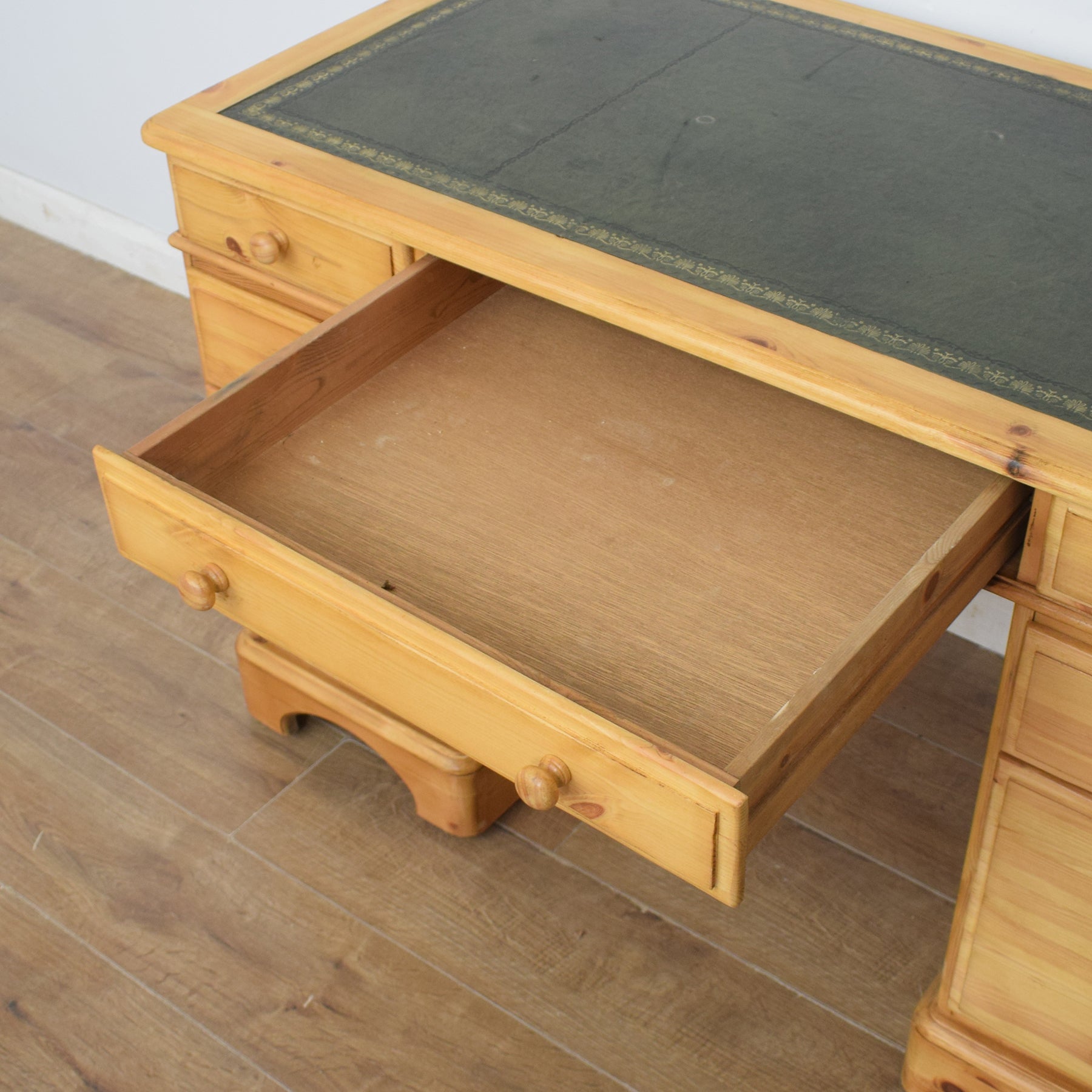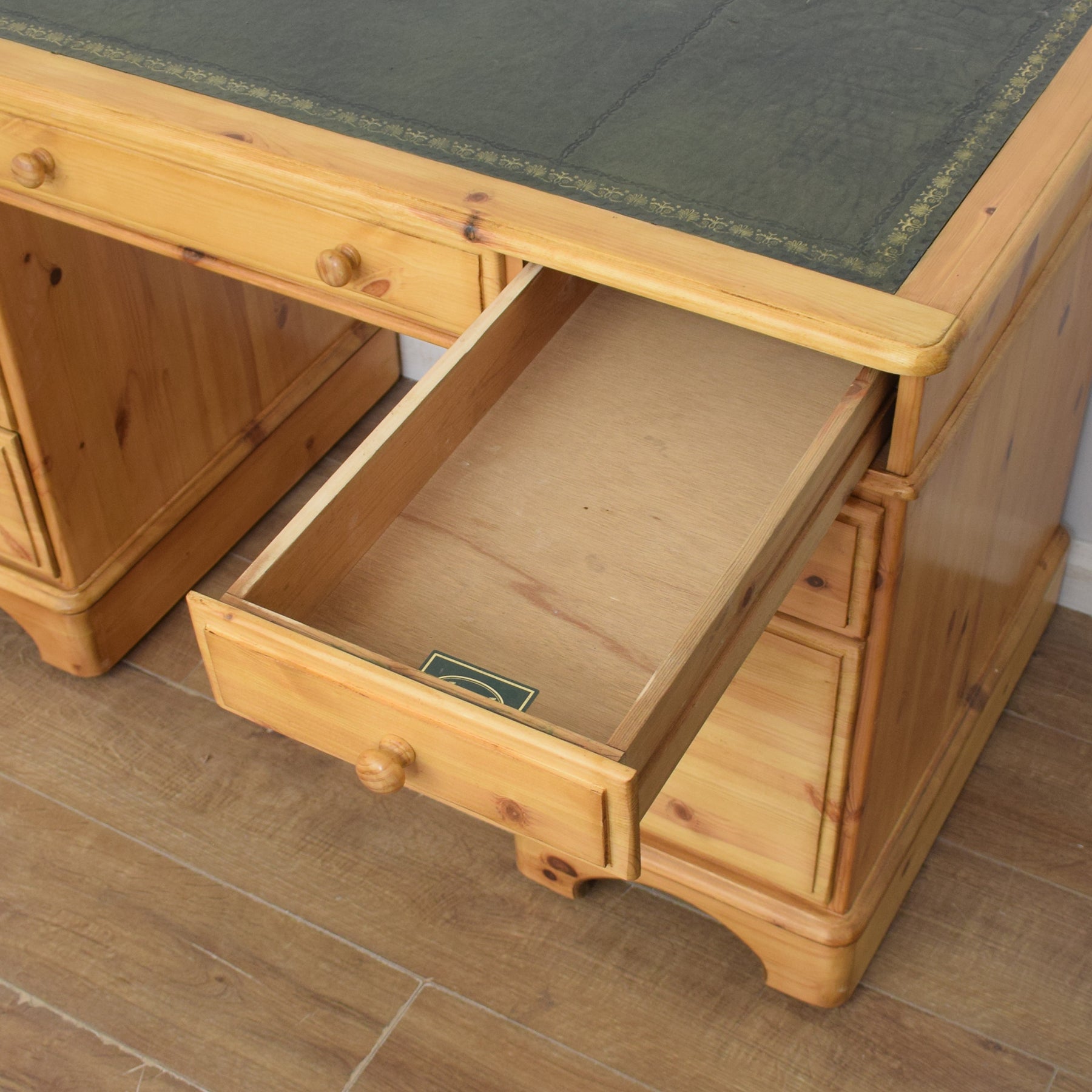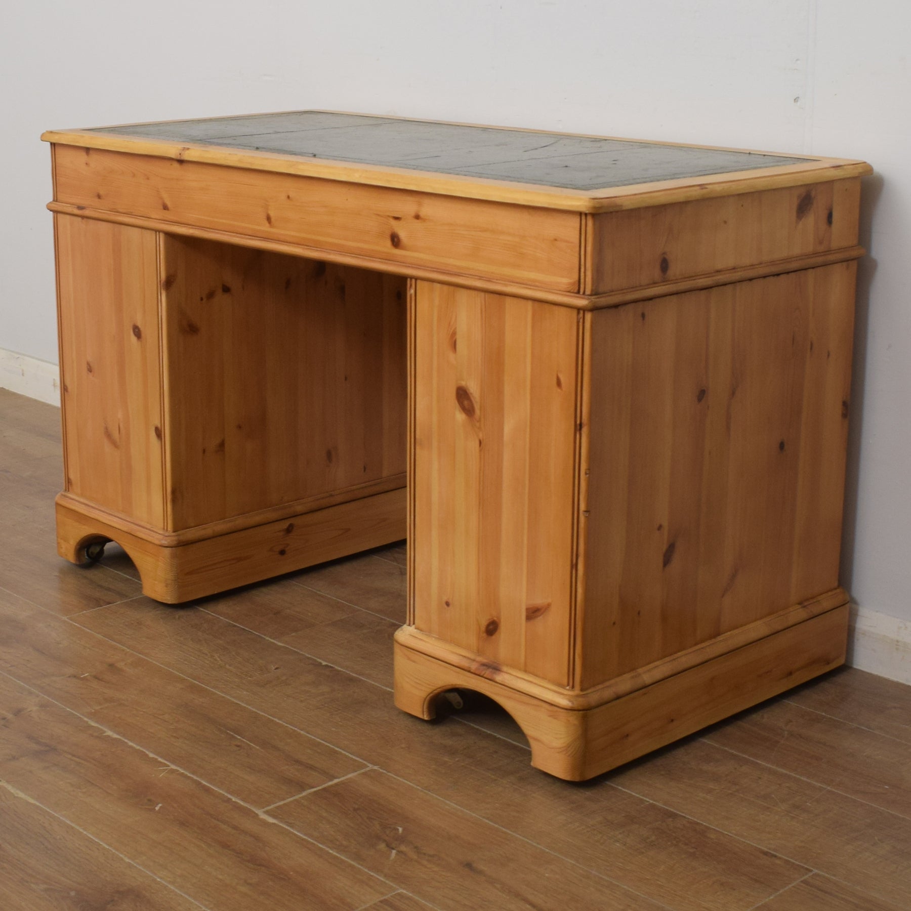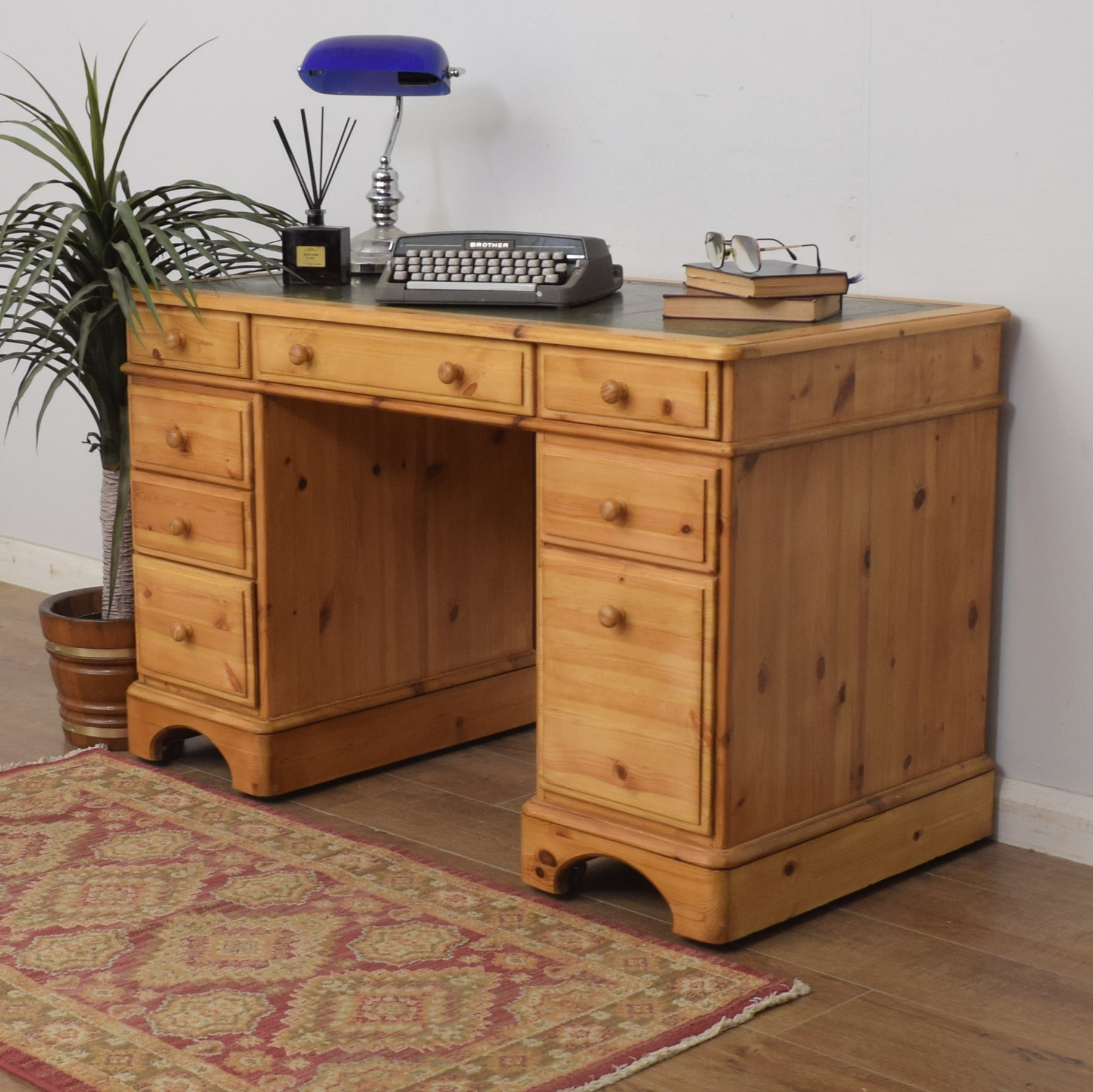 The spacious desktop has ample room for a computer keyboard and screen, or a laptop, along with a desk lamp, books and other items. There are a couple of marks on the leather writing pad, that you can see in the photos; however, it is generally in good condition. This top section then has a wide central drawer with a smaller drawer on each side. This is supported by a three-drawer pedestal on the left and a two drawer pedestal on the right which has a deep bottom drawer, providing ample storage for various items. This practical desk is made of solid pine with plywood used for the drawer bases.