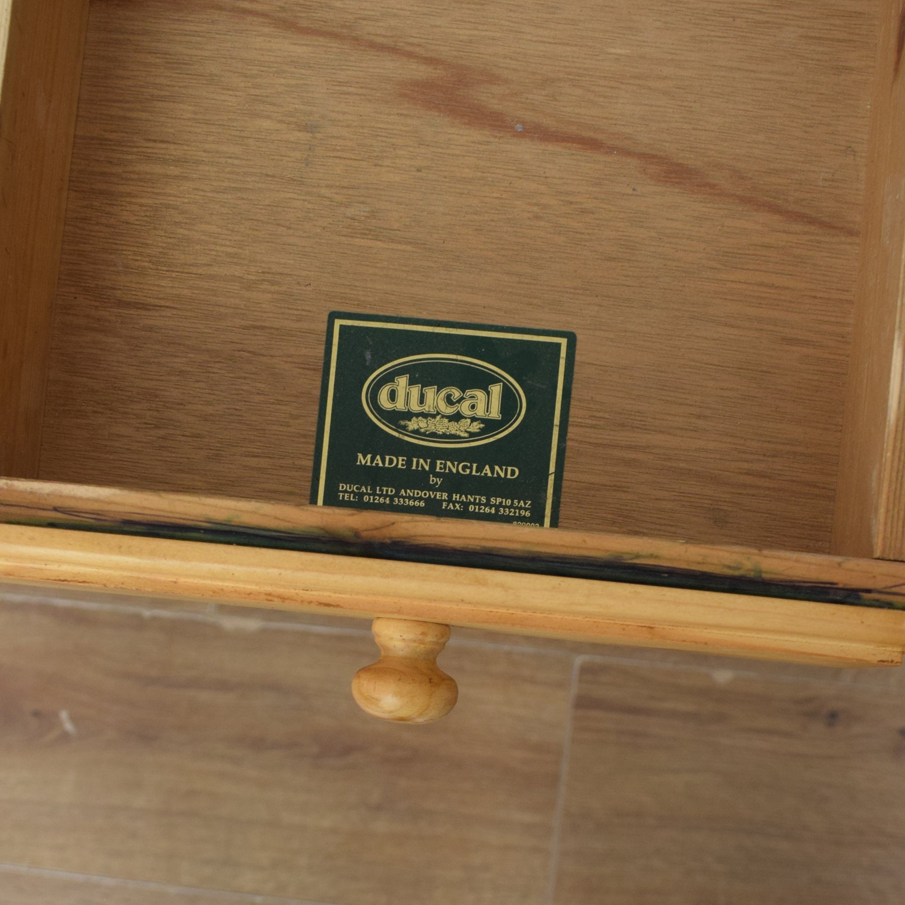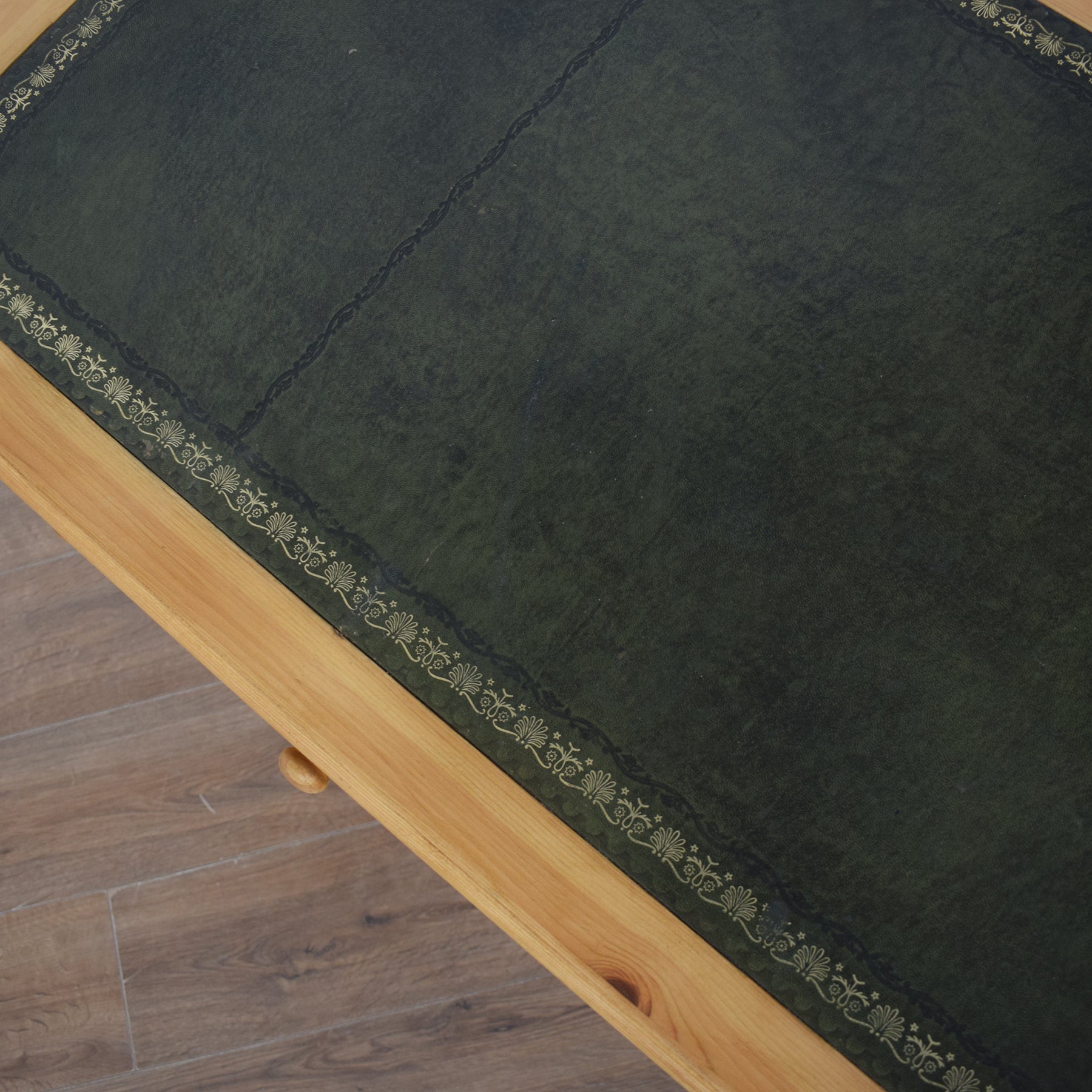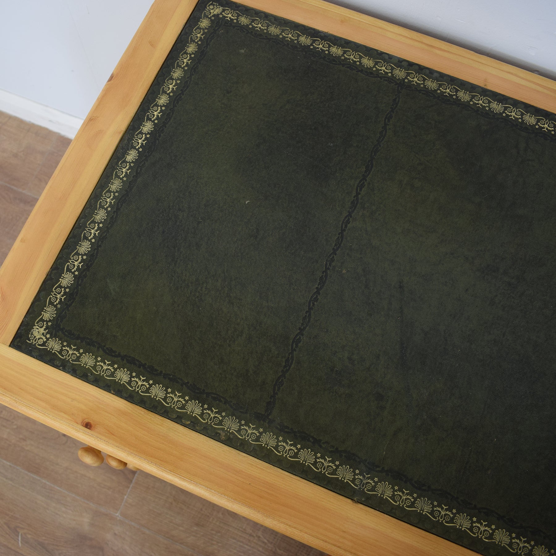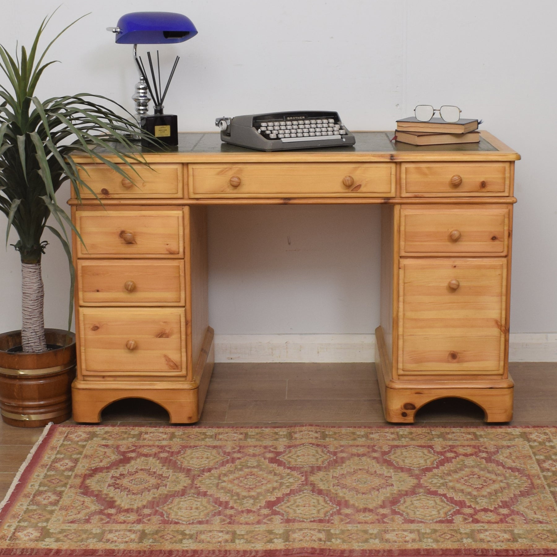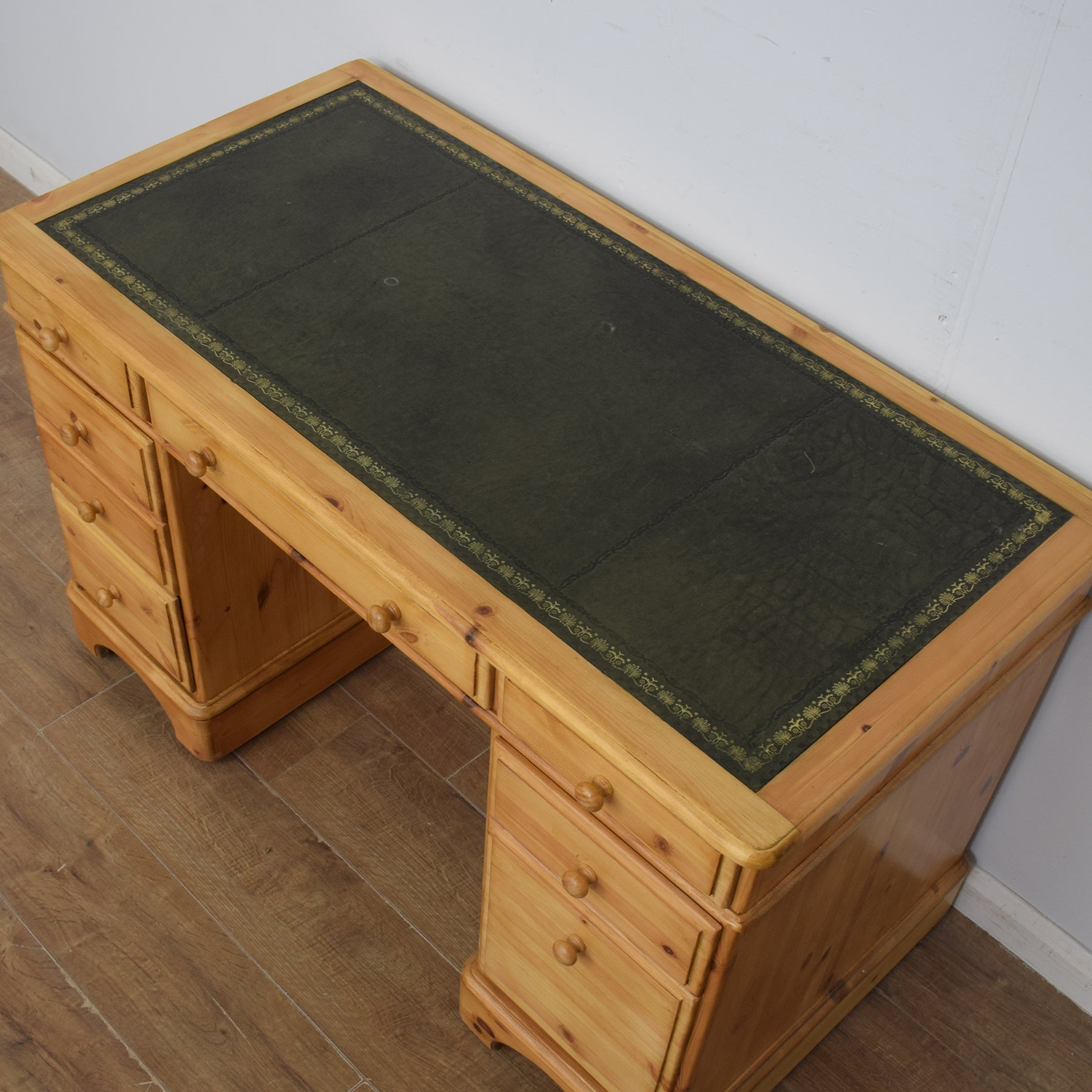 The spacious desktop has ample room for a computer keyboard and screen, or a laptop, along with a desk lamp, books and other items. There are a couple of marks on the leather writing pad, that you can see in the photos; however, it is generally in good condition. This top section then has a wide central drawer with a smaller drawer on each side. This is supported by a three-drawer pedestal on the left and a two drawer pedestal on the right which has a deep bottom drawer, providing ample storage for various items. This practical desk is made of solid pine with plywood used for the drawer bases.