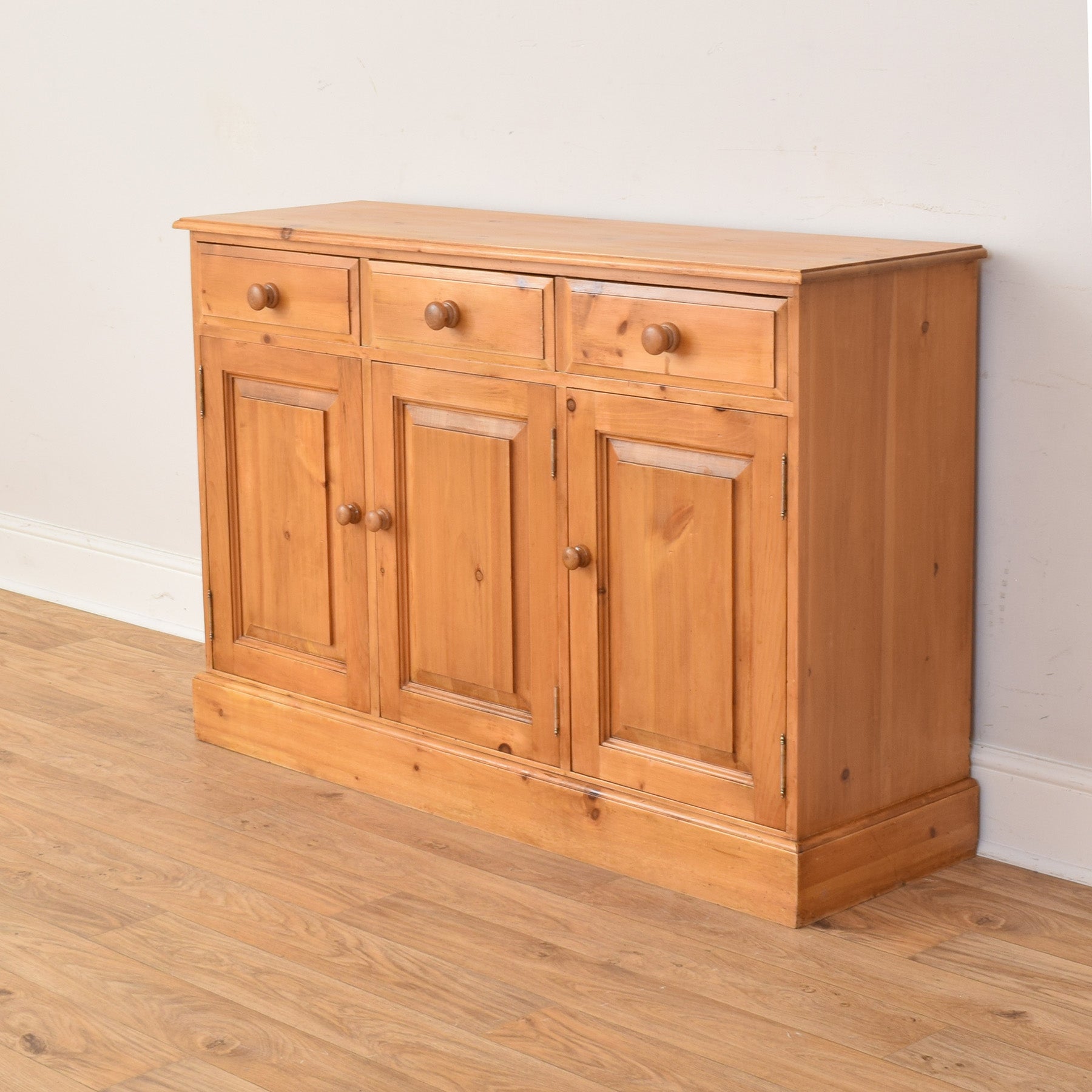 This pine sideboard features three upper drawers and three cupboard doors below, providing a good balance of concealed storage for household items, tableware, or everyday essentials. The simple wooden knobs and panelled doors give it a classic appearance, while the natural tone of the pine highlights the character of the wood grain and knots.