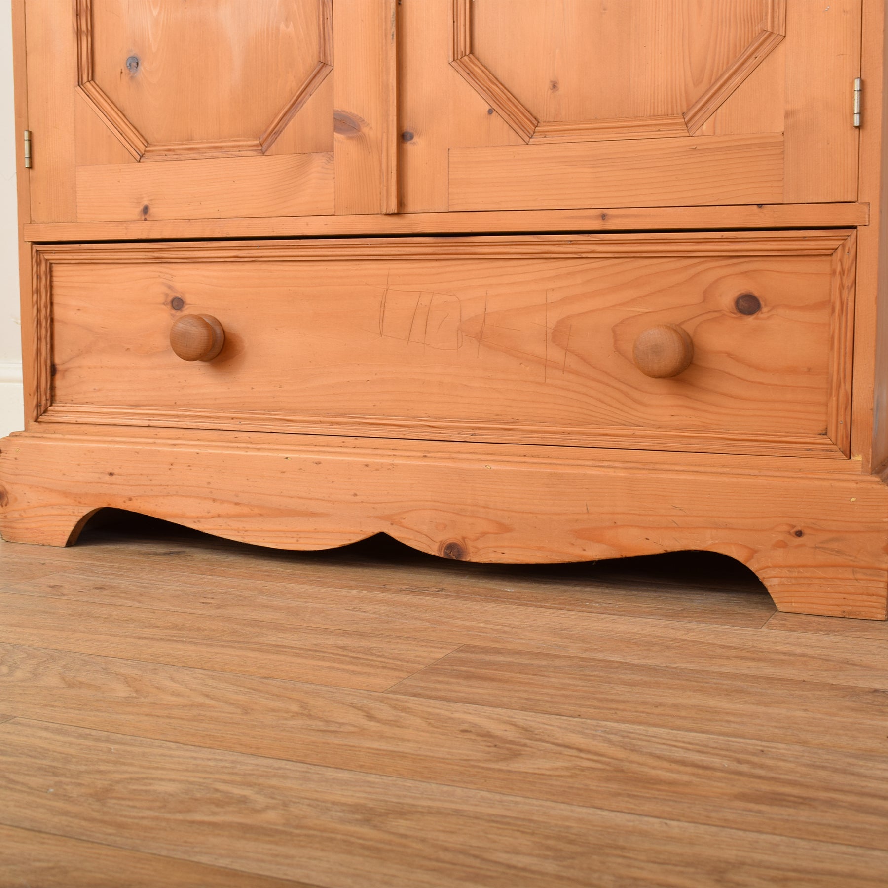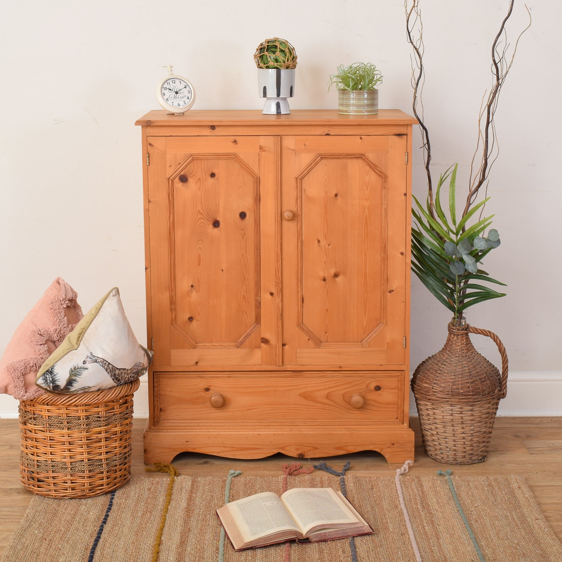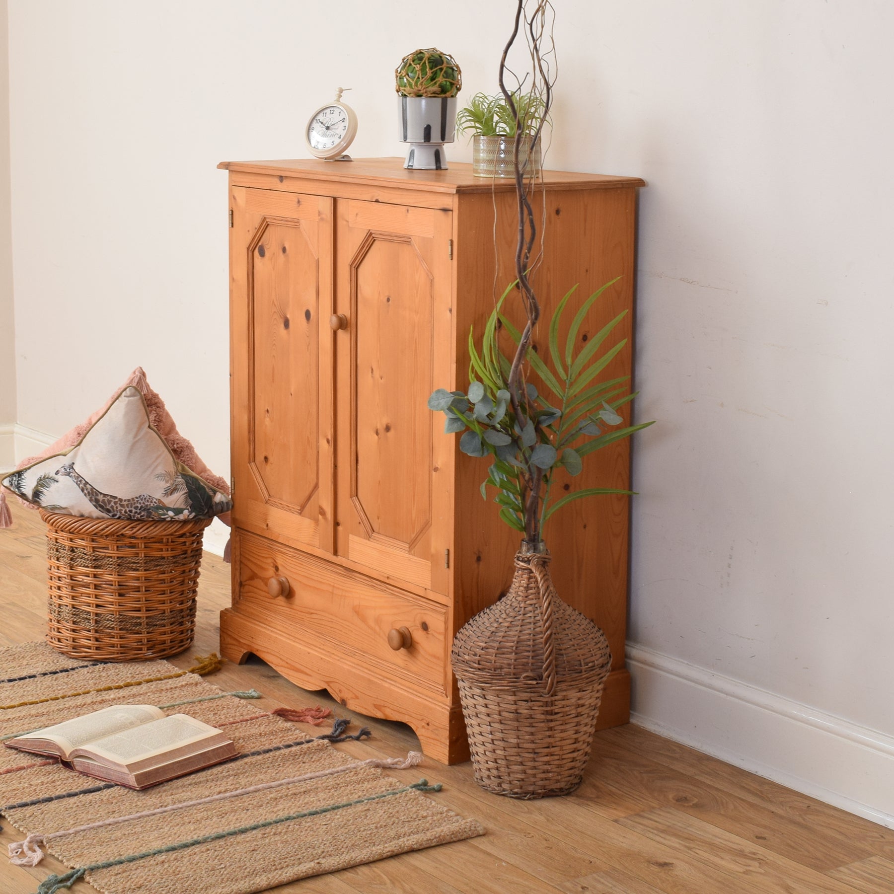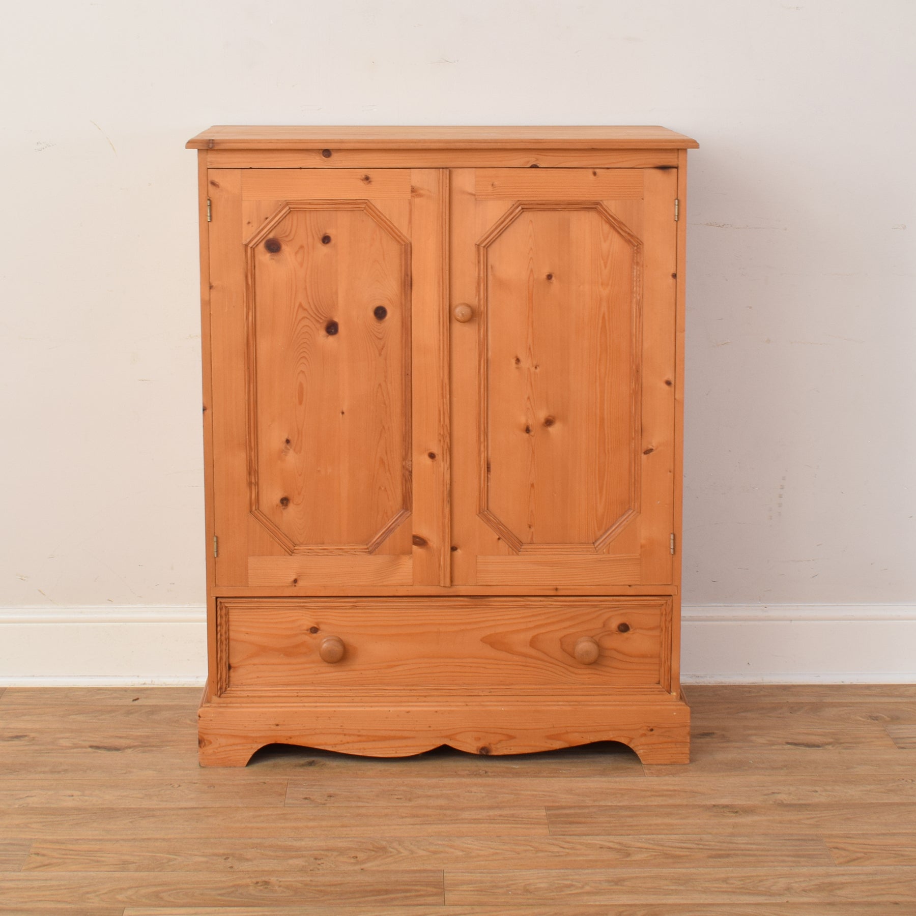 The tallboy features a pair of paneled doors above a single deep drawer, each fitted with turned wooden knobs that enhance its timeless appeal. The subtle curves along the lower edge and the visible knots in the pine grain add a touch of rustic charm, giving it a well-balanced look that suits many decorative styles.