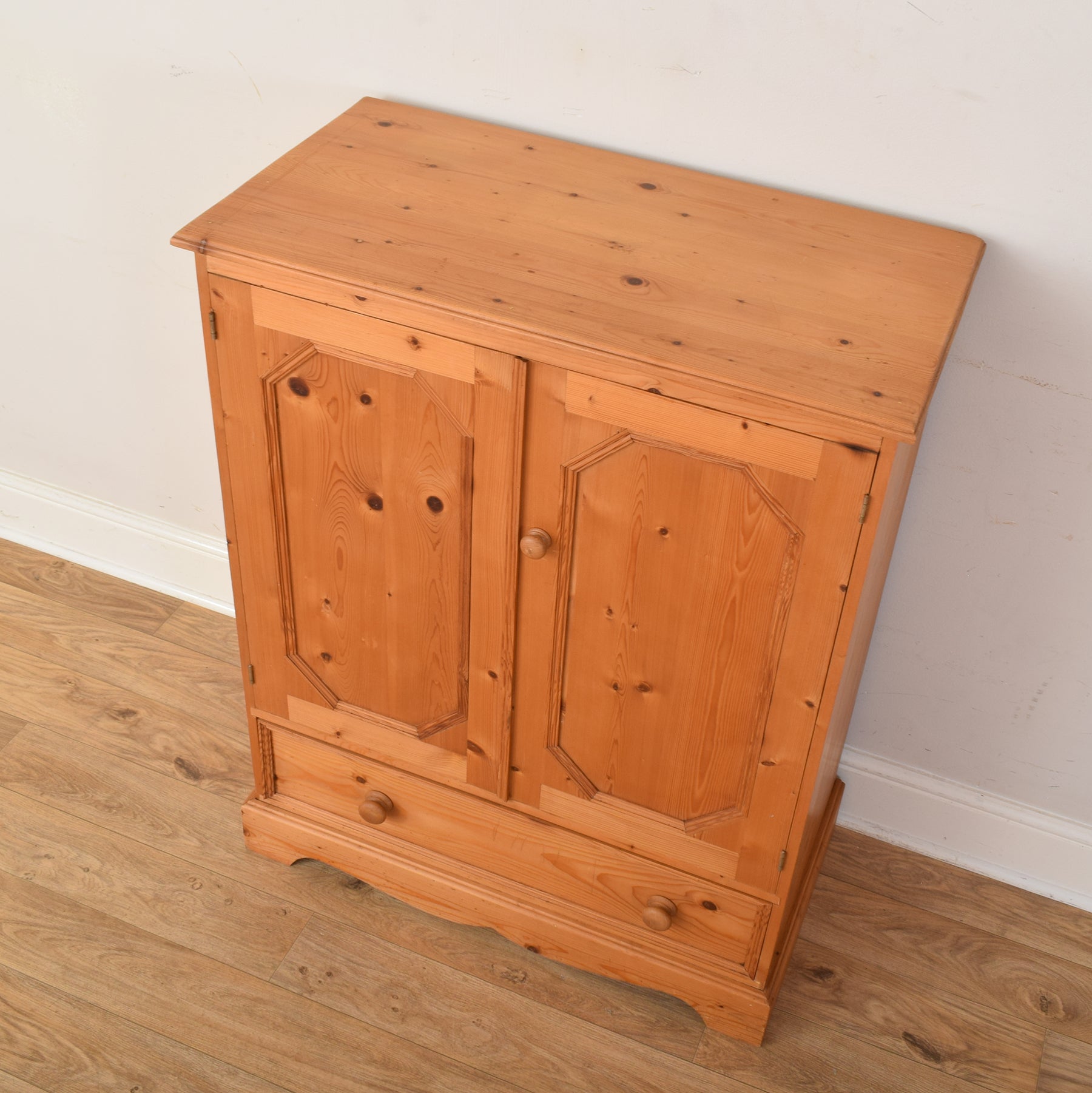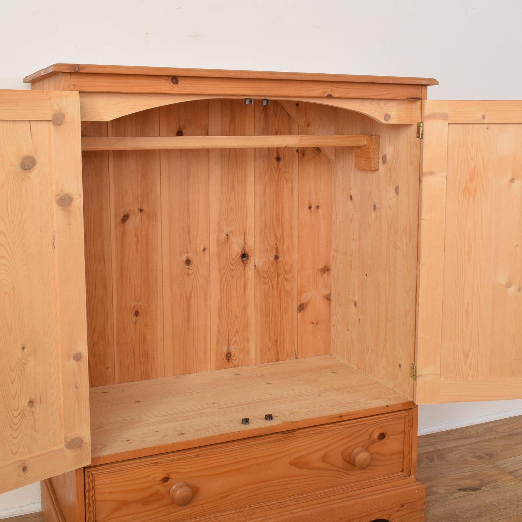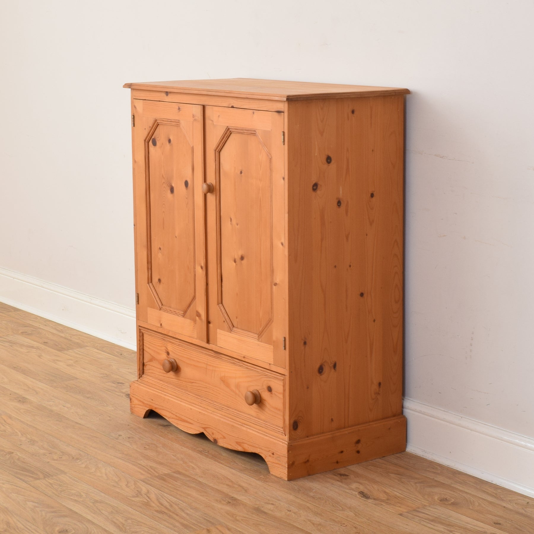 The tallboy features a pair of paneled doors above a single deep drawer, each fitted with turned wooden knobs that enhance its timeless appeal. The subtle curves along the lower edge and the visible knots in the pine grain add a touch of rustic charm, giving it a well-balanced look that suits many decorative styles.