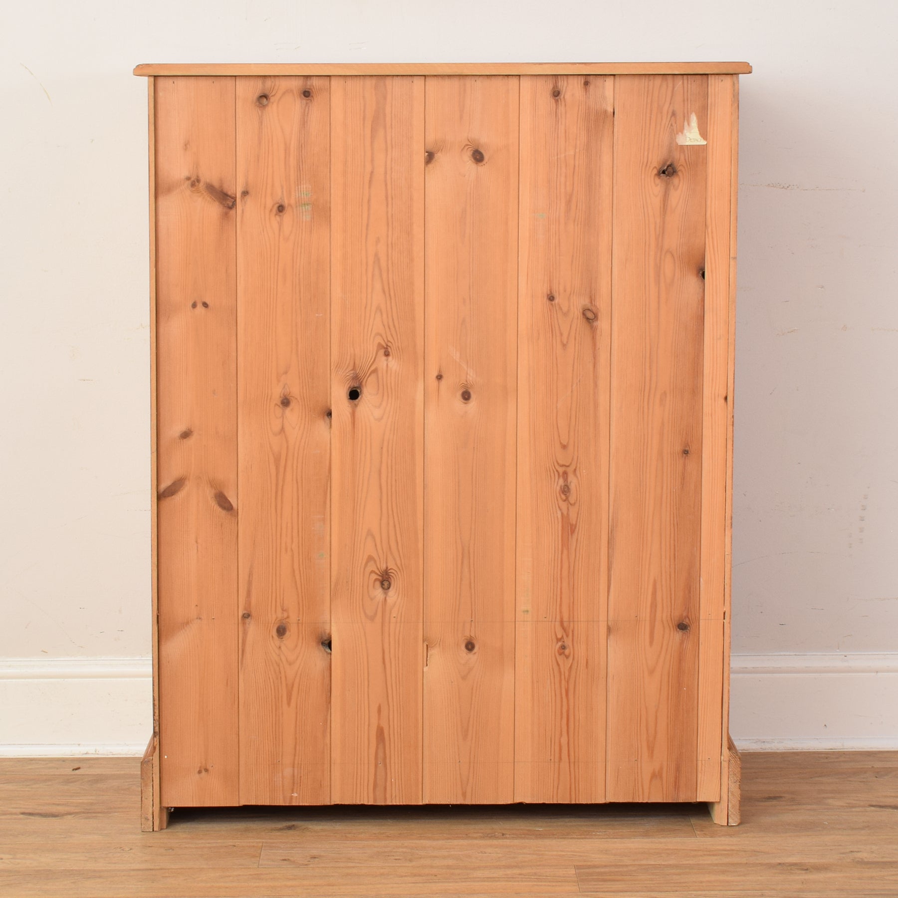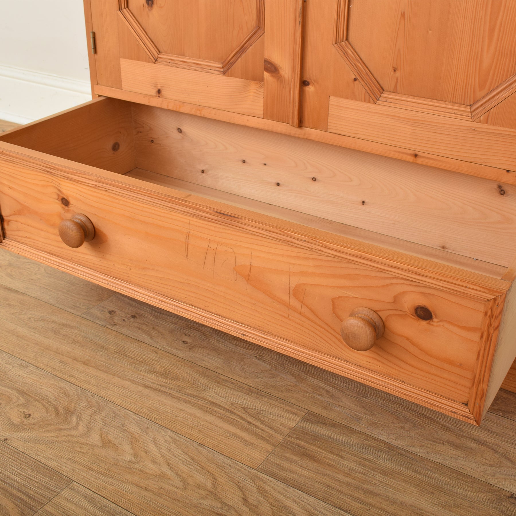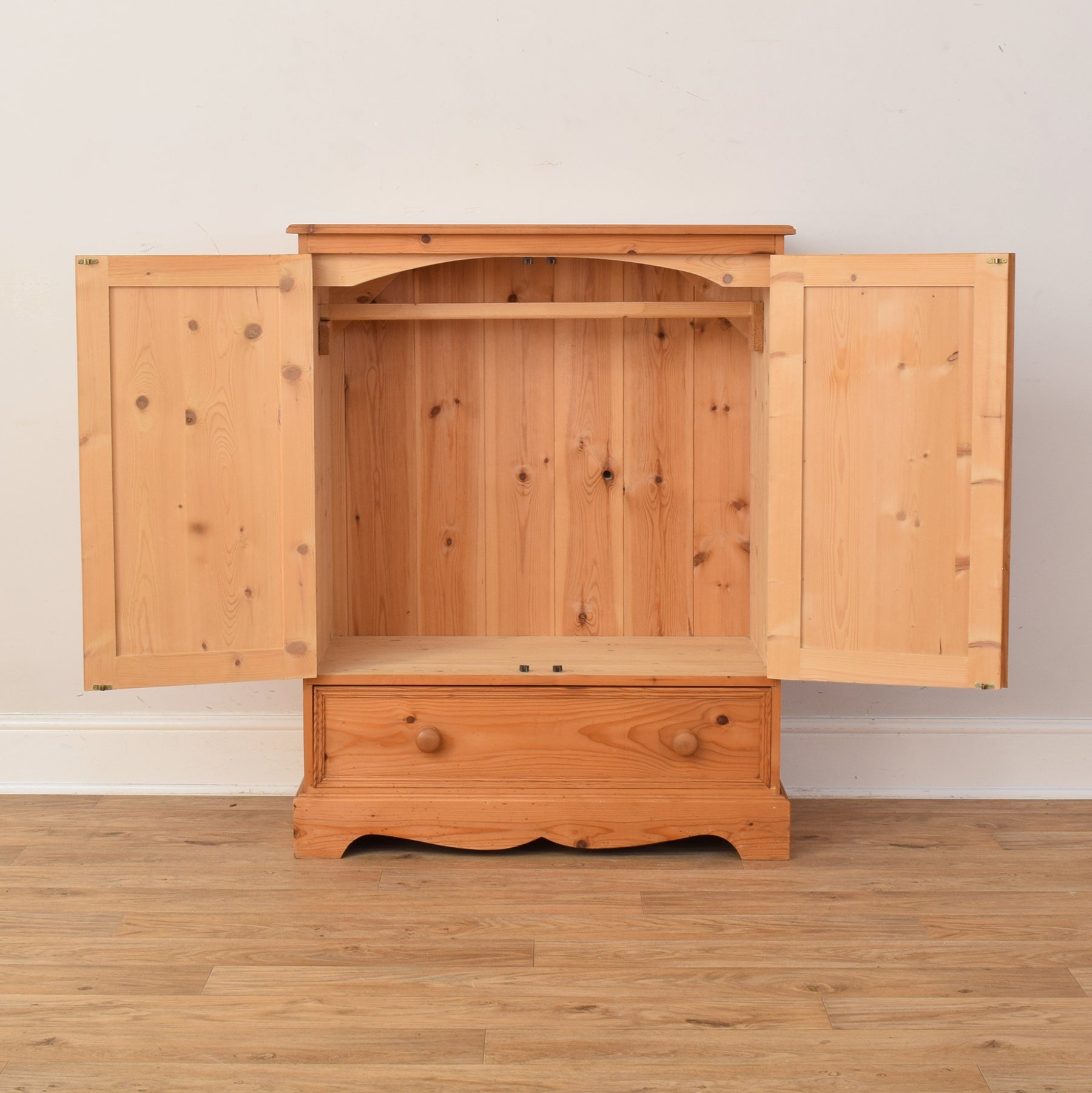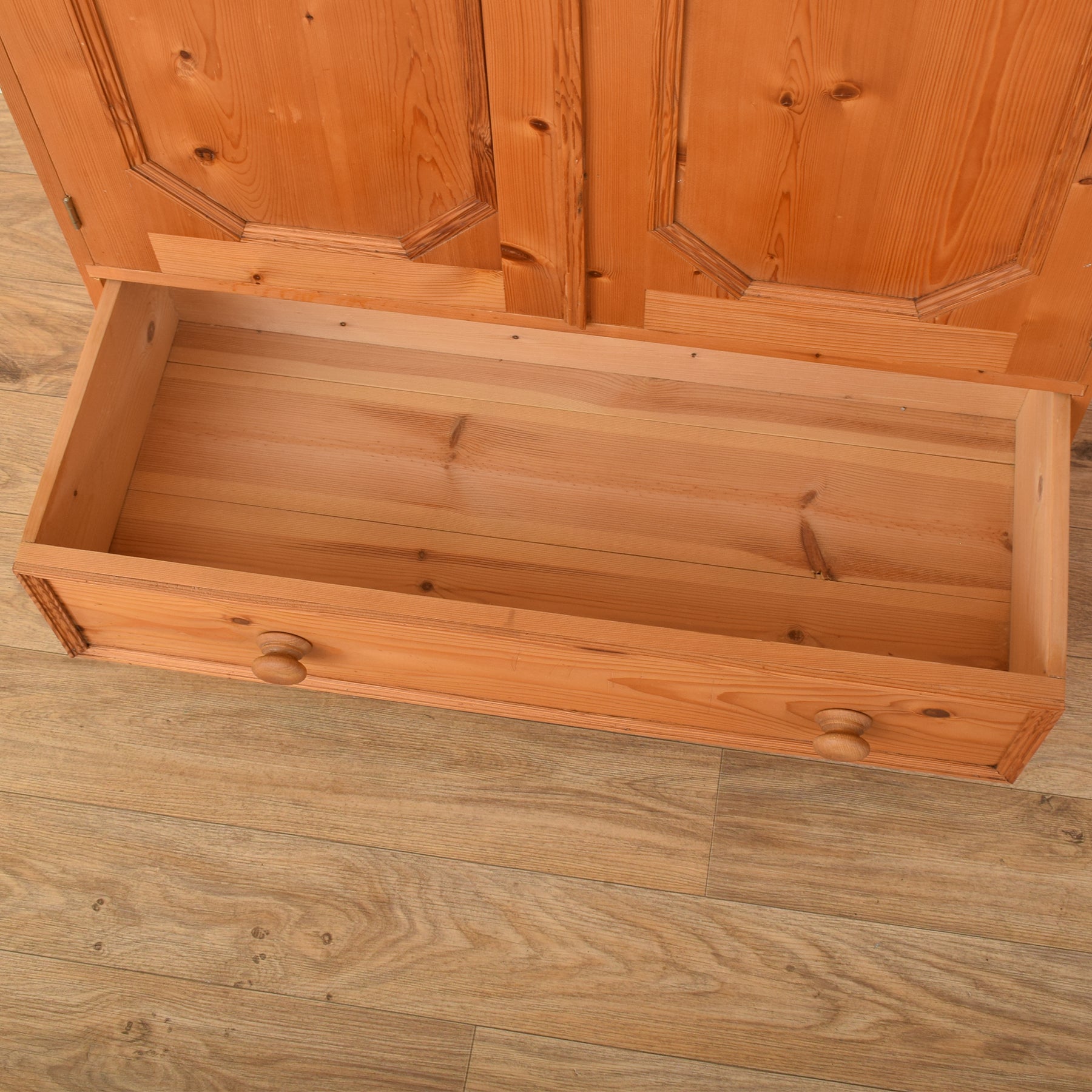 The tallboy features a pair of paneled doors above a single deep drawer, each fitted with turned wooden knobs that enhance its timeless appeal. The subtle curves along the lower edge and the visible knots in the pine grain add a touch of rustic charm, giving it a well-balanced look that suits many decorative styles.