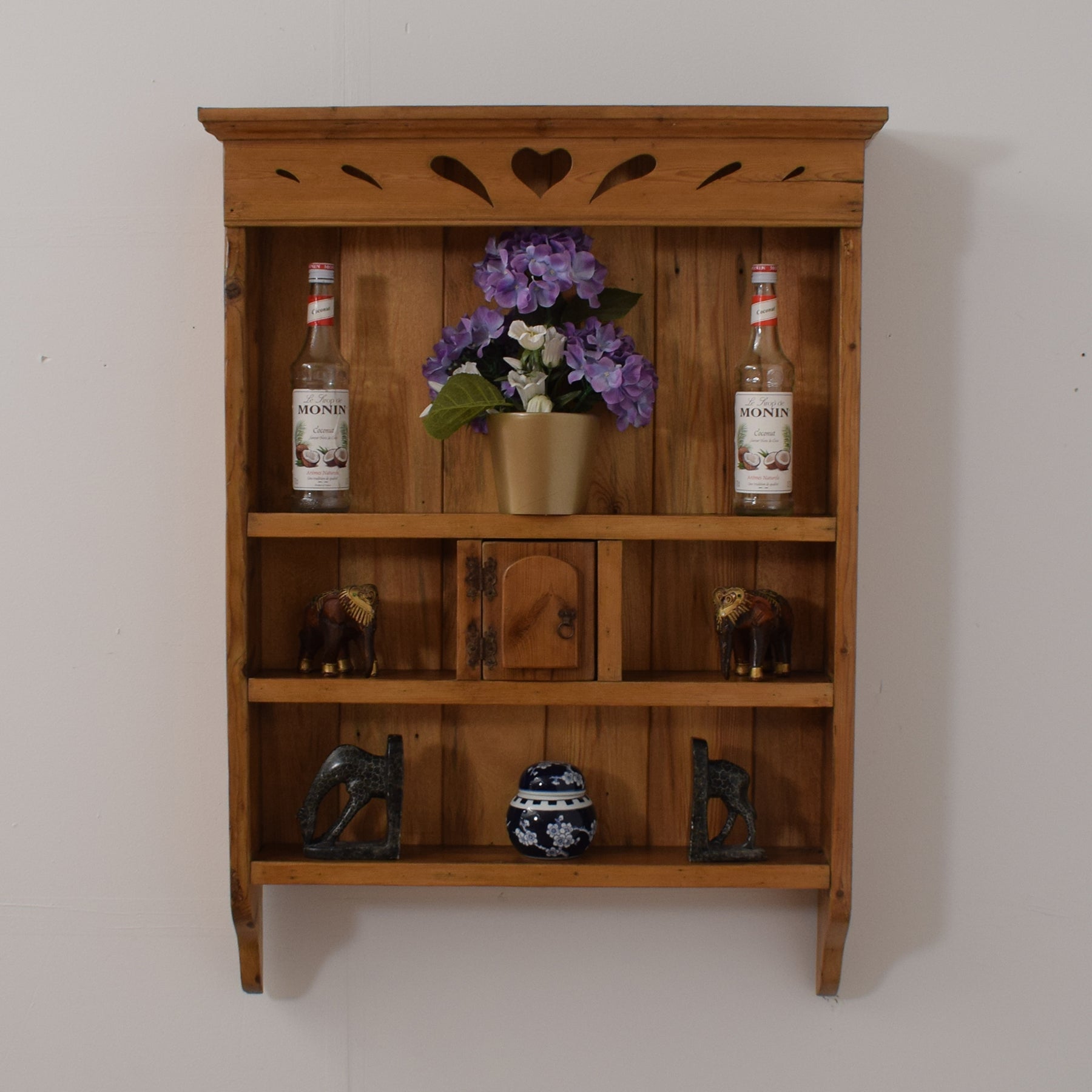 There are three shelves which can be used for displaying your favourite ornaments and family photos or for storing bottles, jars and spices. There is a small central cupboard which can be used for keys or other personal effects. The bottom shelf has a display height of 19.5cm. The next shelf up, with the small cupboard has a height of 17cm and the top shelf has a height of 35.5cm. This unit is attached to the wall with two screws.