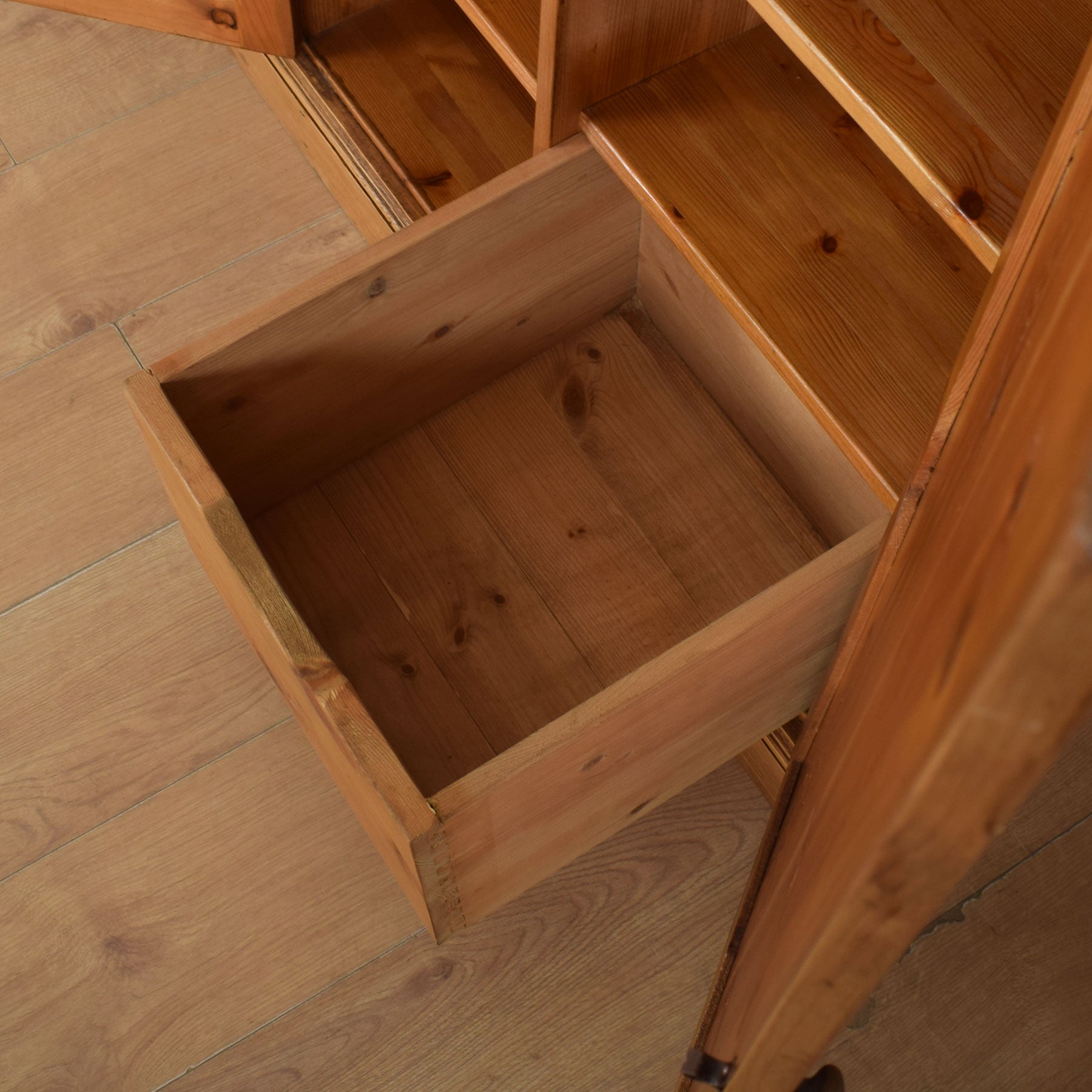 The generous top surface has space for treasured ornaments and photographs, as well as a lamp or vase of fresh flowers. Below are three separate full-height cuboards with varied storage options. The left-hand cupboard features full-height storage and a hanging rail, ideal for hanging your clothes. The central cupboard has three fixed shelves plus the base, while the right-hand cupboard has three shelves plus a usefully deep lower drawer. This cupboard is made of solid pine throughout.