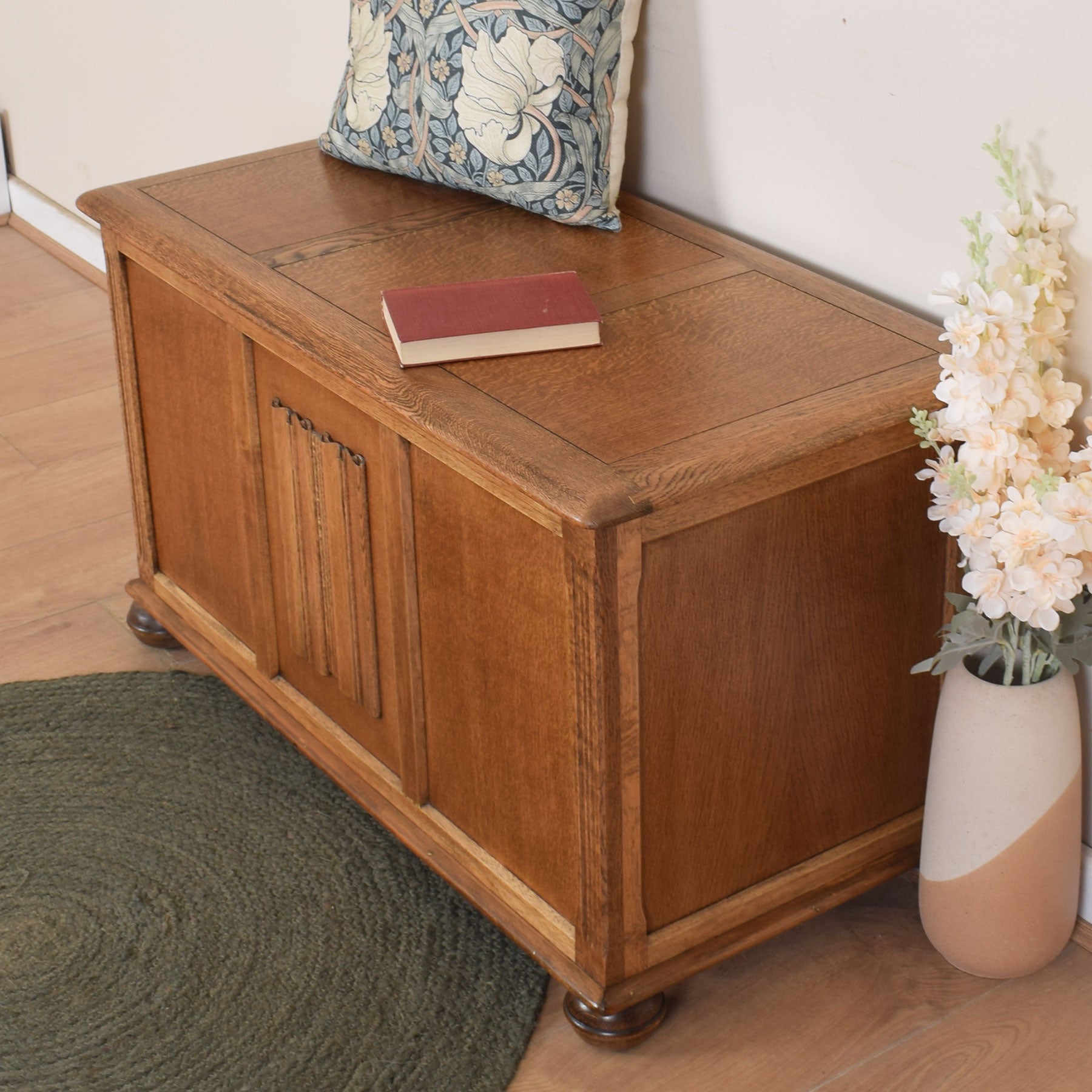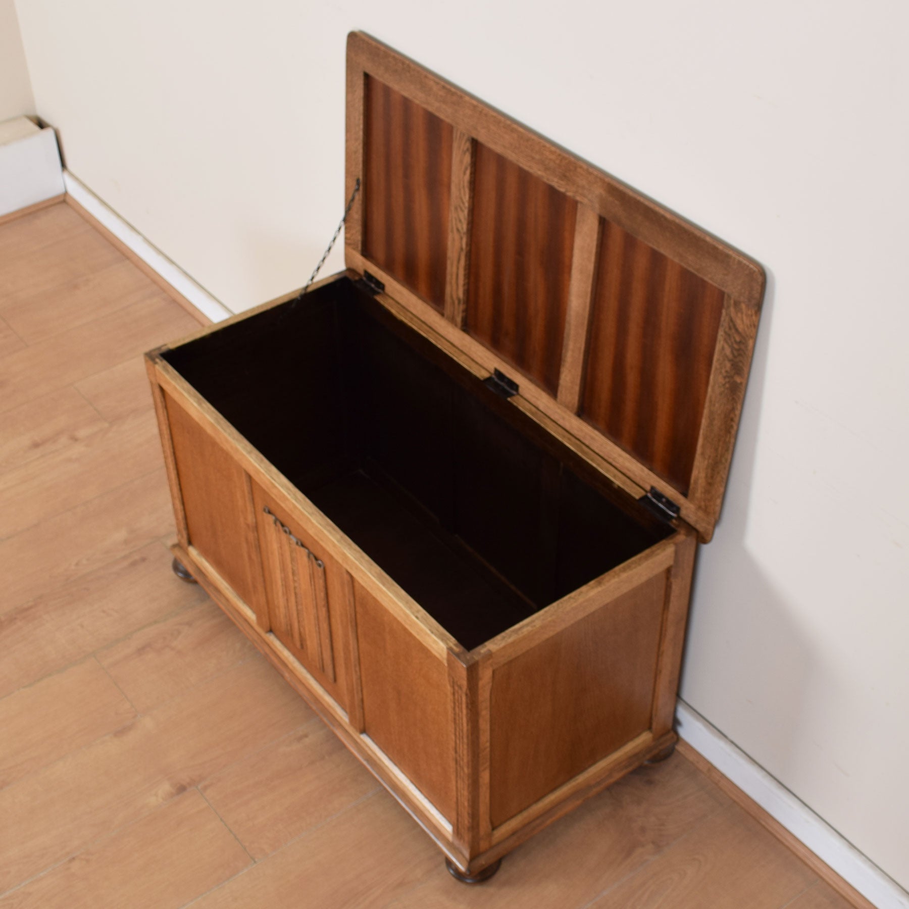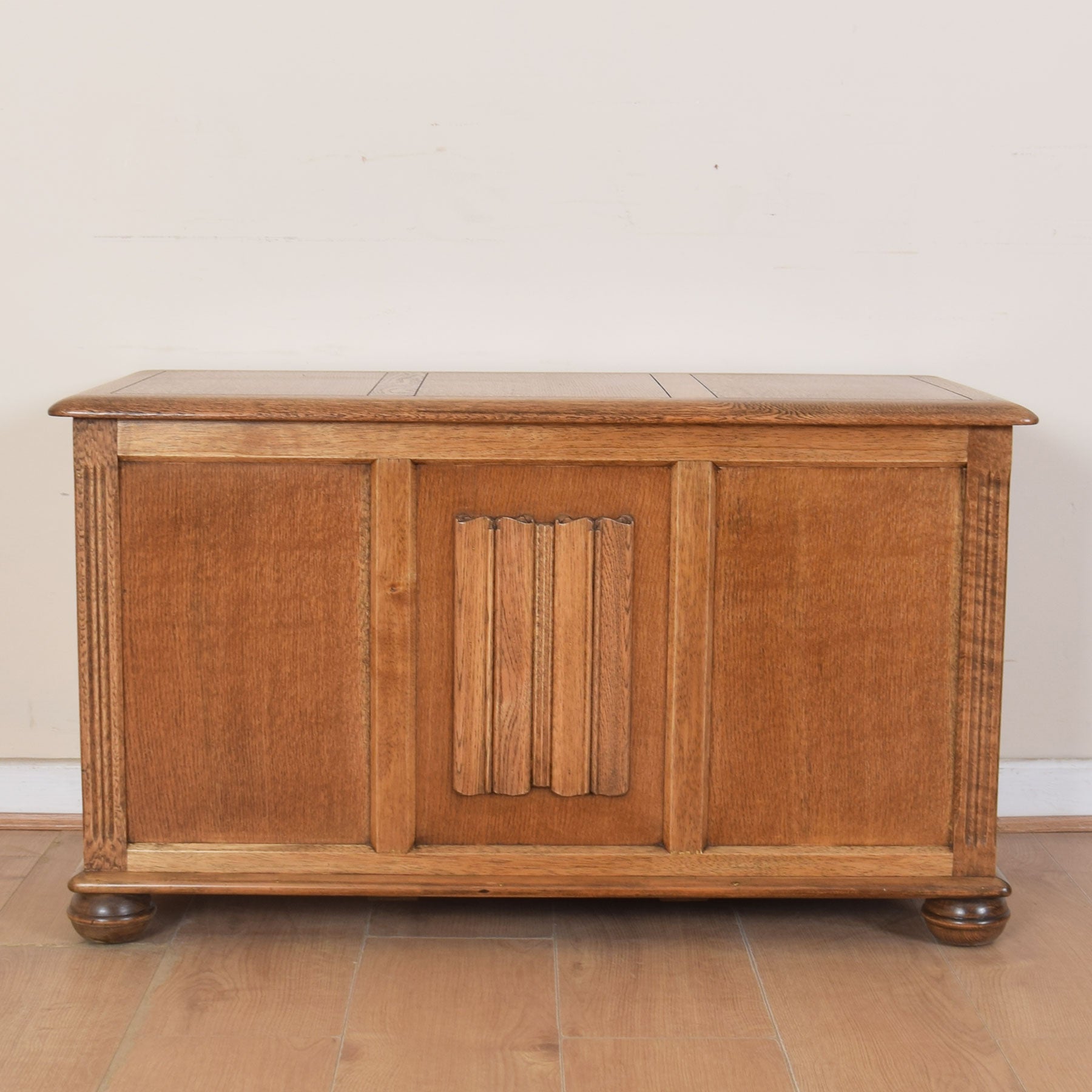 This Priory blanket box showcases a traditional panelled front adorned with exquisitely carved linenfold details in the central area, bordered by softly bevelled edges that emphasise its craftsmanship. Resting on rounded bun feet, the box offers a robust yet graceful silhouette, ideal for storing bedding, throws, or seasonal items while also serving as a bench at the foot of a bed or under a window.