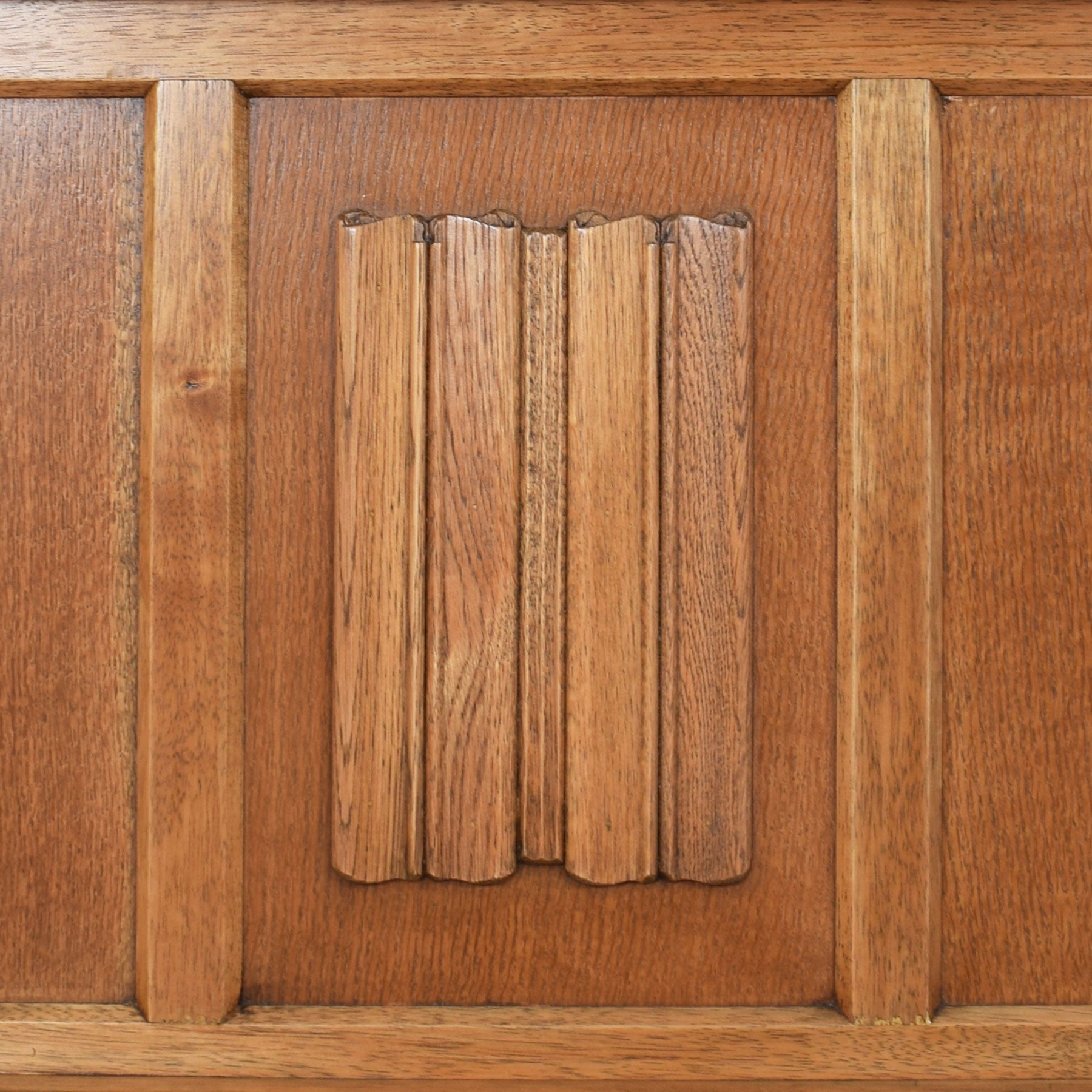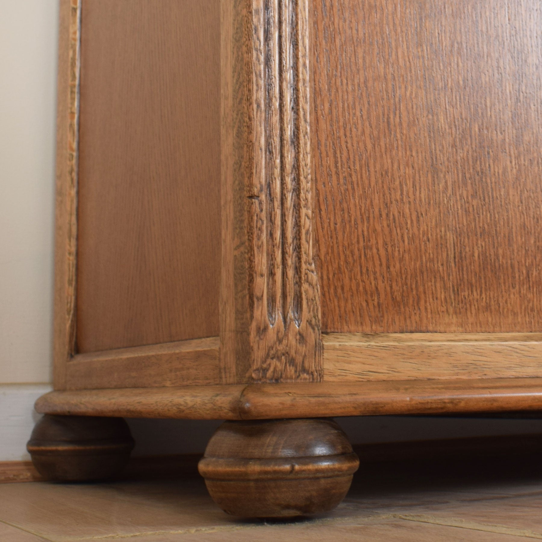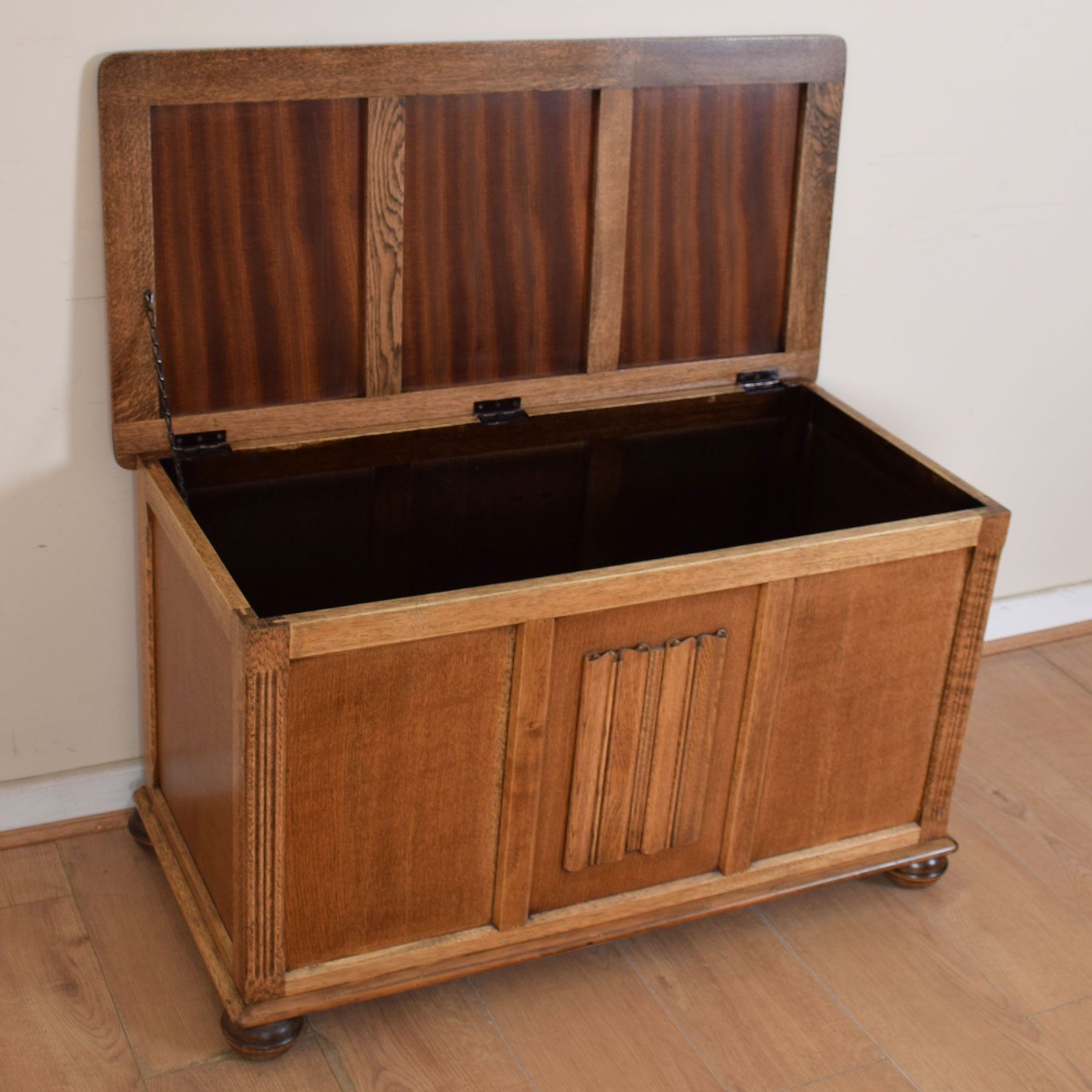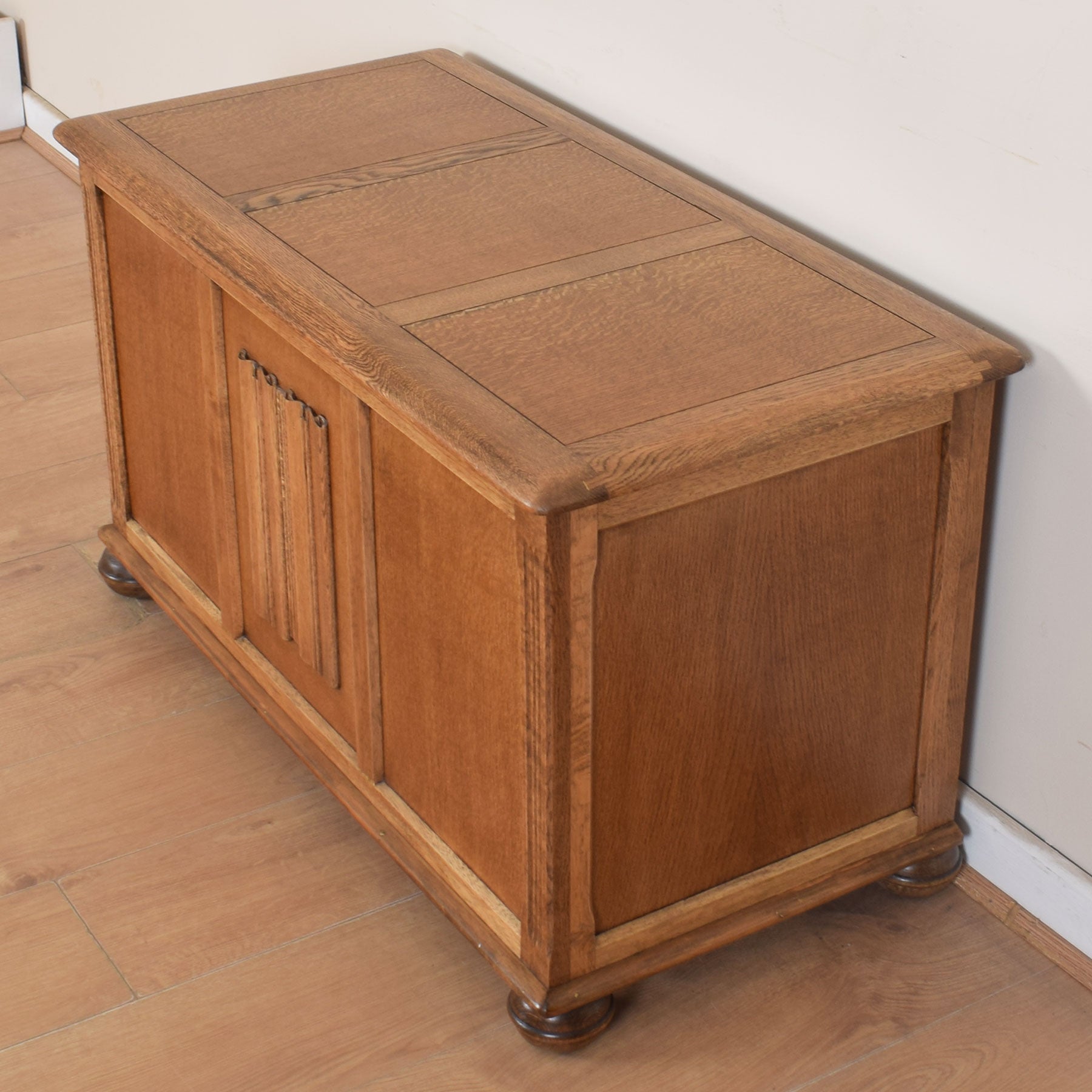 This Priory blanket box showcases a traditional panelled front adorned with exquisitely carved linenfold details in the central area, bordered by softly bevelled edges that emphasise its craftsmanship. Resting on rounded bun feet, the box offers a robust yet graceful silhouette, ideal for storing bedding, throws, or seasonal items while also serving as a bench at the foot of a bed or under a window.