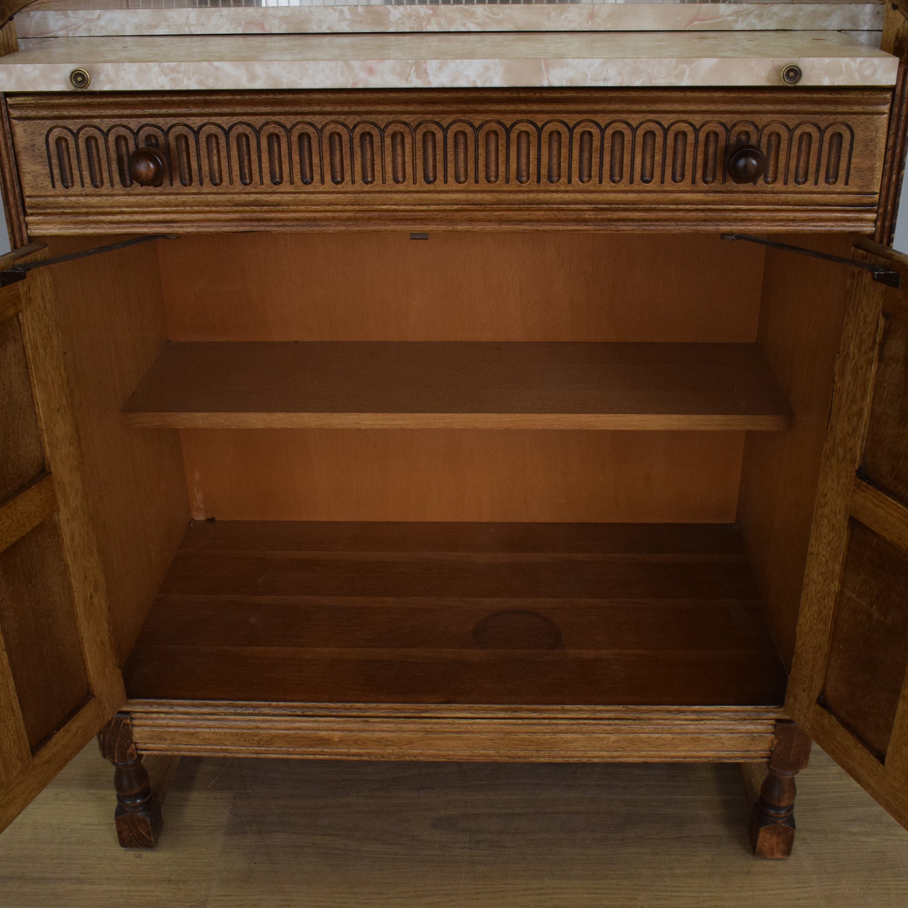 The previous finish has been stripped back, and then multiple coats of hard-wearing matte lacquer have been applied, providing a durable long-lasting finish while accentuating the oak grain. There is a ring mark to the top, and another ring mark inside the cupboard. This item is made from a mixture of oak and oak veneer, with a plywood back and drawer base.