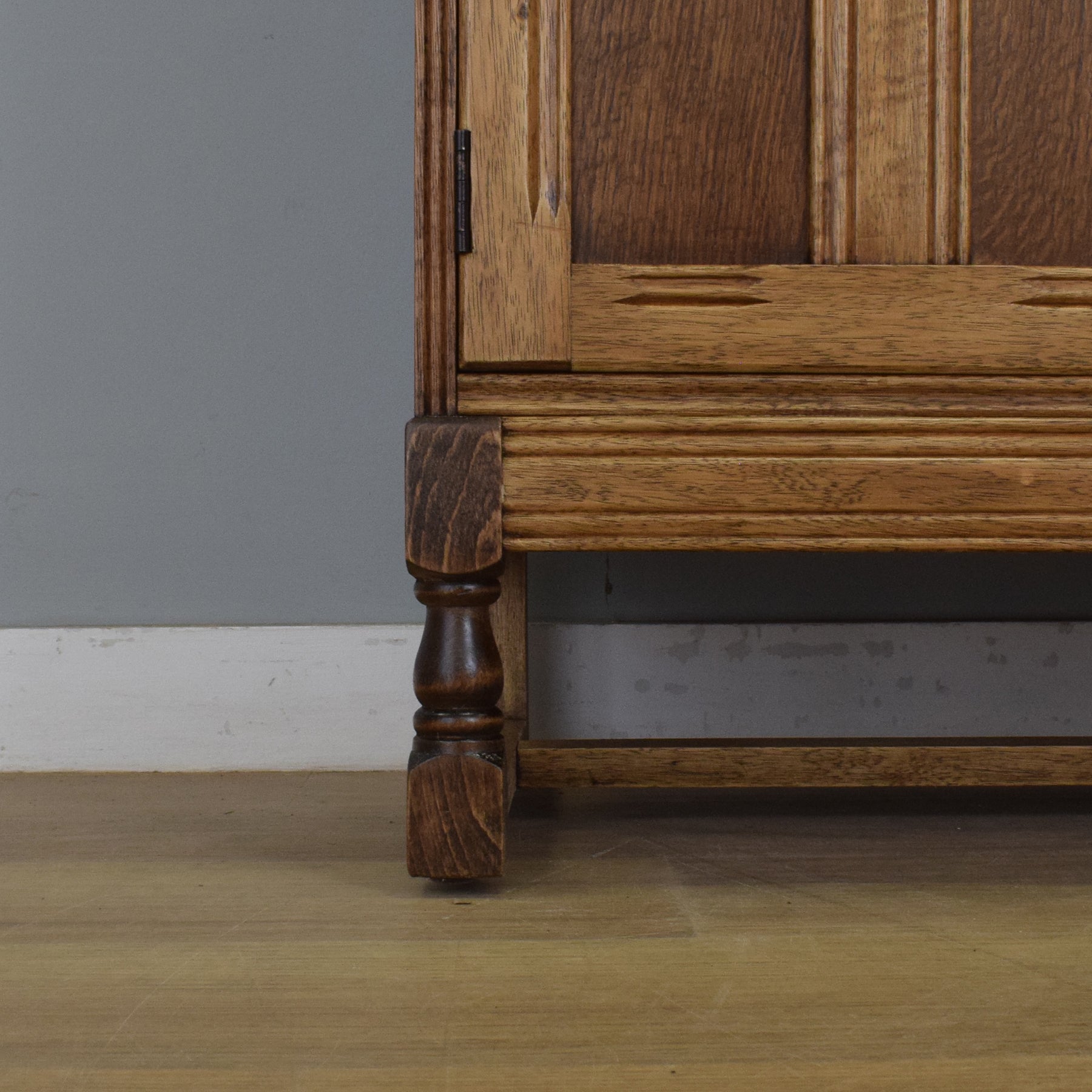 This Priory oak drinks cabinet offers a practical, well-planned layout, with a double cupboard at the top, a central drawer, and a larger cupboard below. The upper section opens to reveal a mirrored back with useful storage fitted to the inside of the doors, ideal for keeping smaller bottles and bar items in order. Beneath, the long drawer includes internal dividers for tools and accessories, and the lower cupboard provides generous space with a fixed shelf for bottles and larger items.