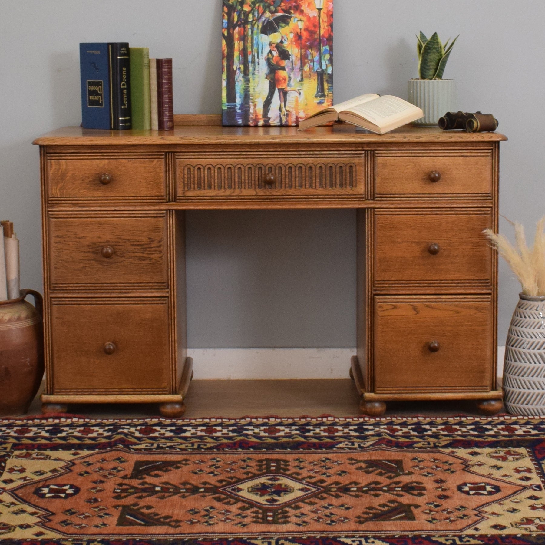 Built in a traditional twin pedestal style, the table features a central kneehole flanked by seven drawers, offering a practical mix of storage options. Each drawer is framed with subtle reeded detailing and fitted with classic round wooden knobs, while the central top drawer is adorned with an carved motif that adds a decorative flourish. The top surface showcases a striking wood grain that reflects the quality of materials used. Rounded front corners and traditional bun feet lend the piece a soft, timeless character.