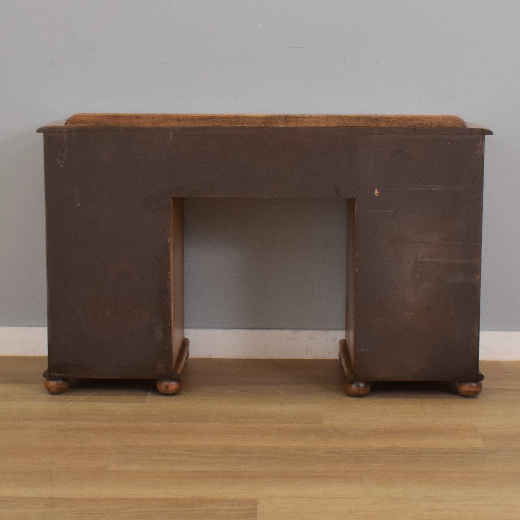 The previous darker stain has been stripped, and then multiple coats of hard-wearing matte lacquer have been applied, providing a durable long-lasting finish, while also accentuating the natural oak grain. This item is made from a combination of oak and oak veneer, with plywood used for the drawer bases. The kneehole is 49cm wide and 56cm high.