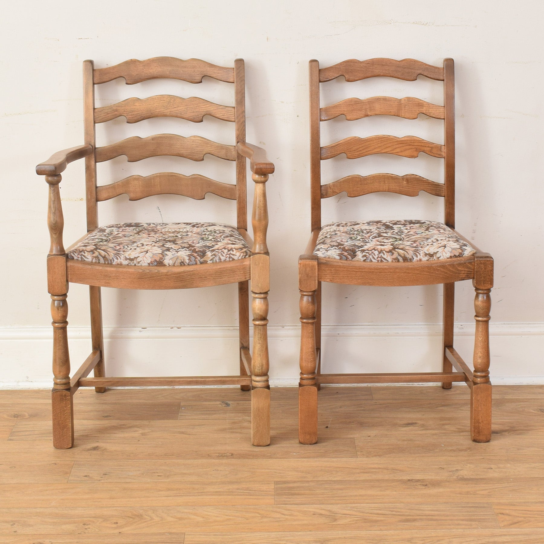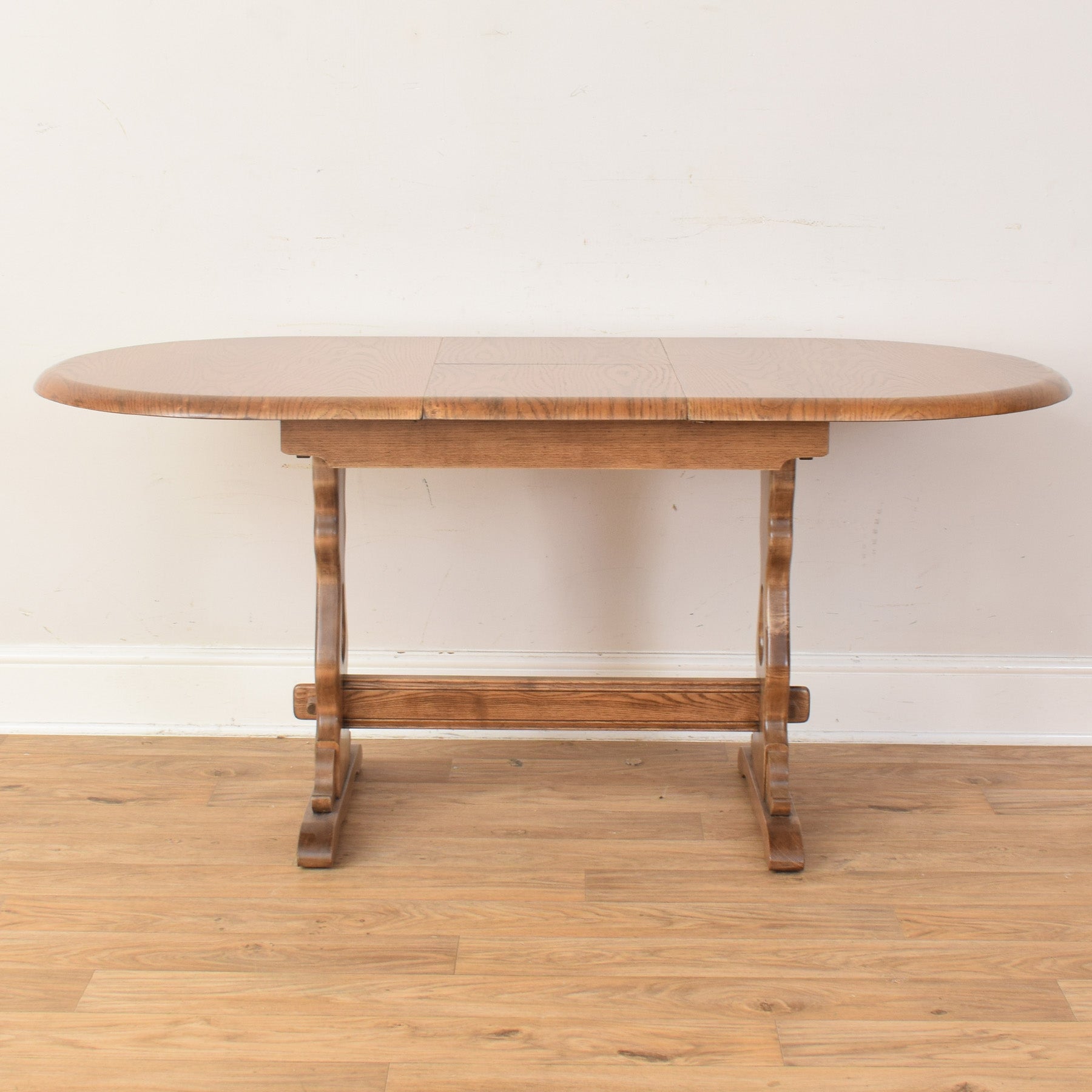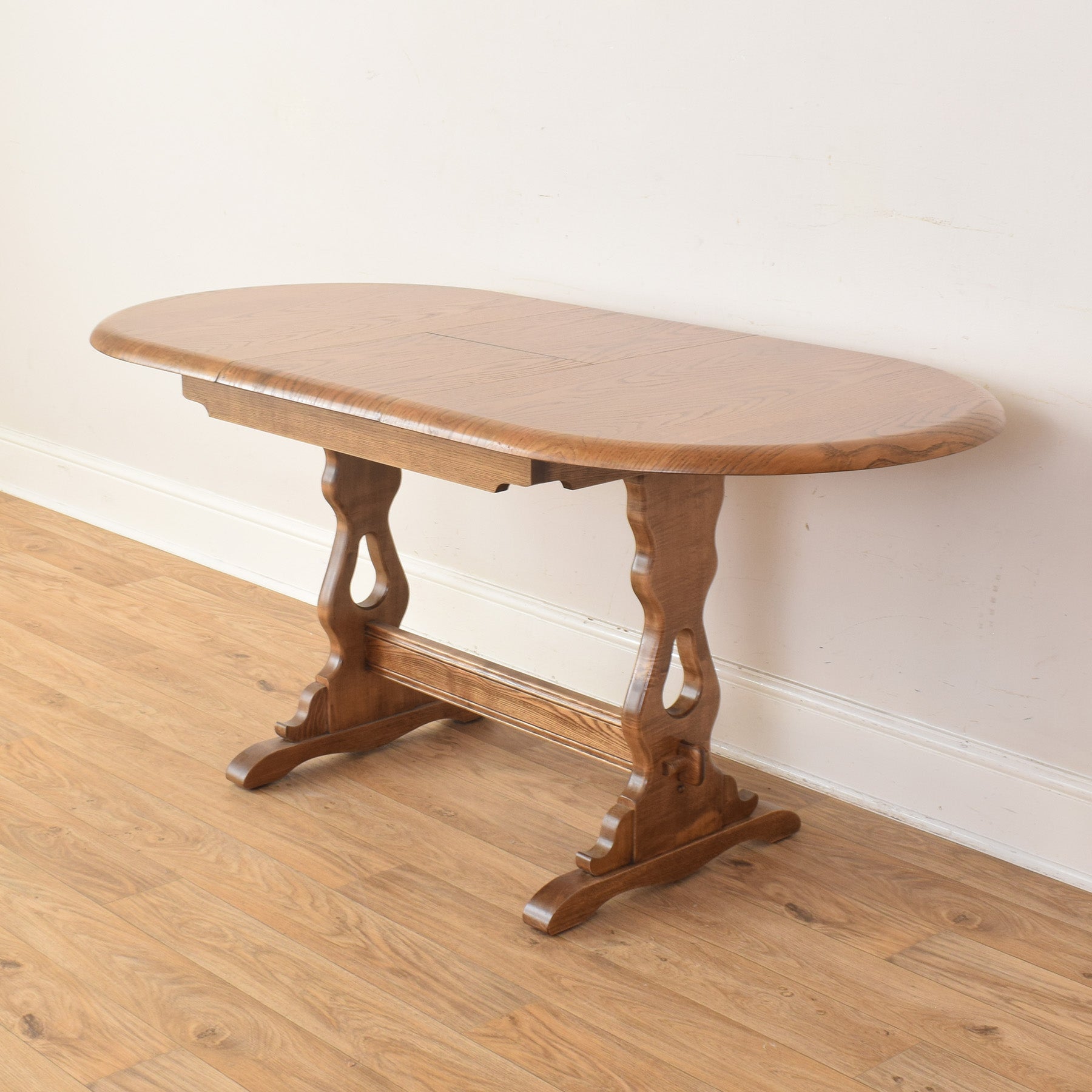 This Priory dining set features a solid oak extendable table paired with six matching ladder-back chairs. The table has a classic oval top and sits on a sturdy central base, and it can be extended when additional space is needed, making it ideal for accommodating extra guests. The chairs display the characteristic shaped ladder backs associated with Priory furniture, with turned front legs.