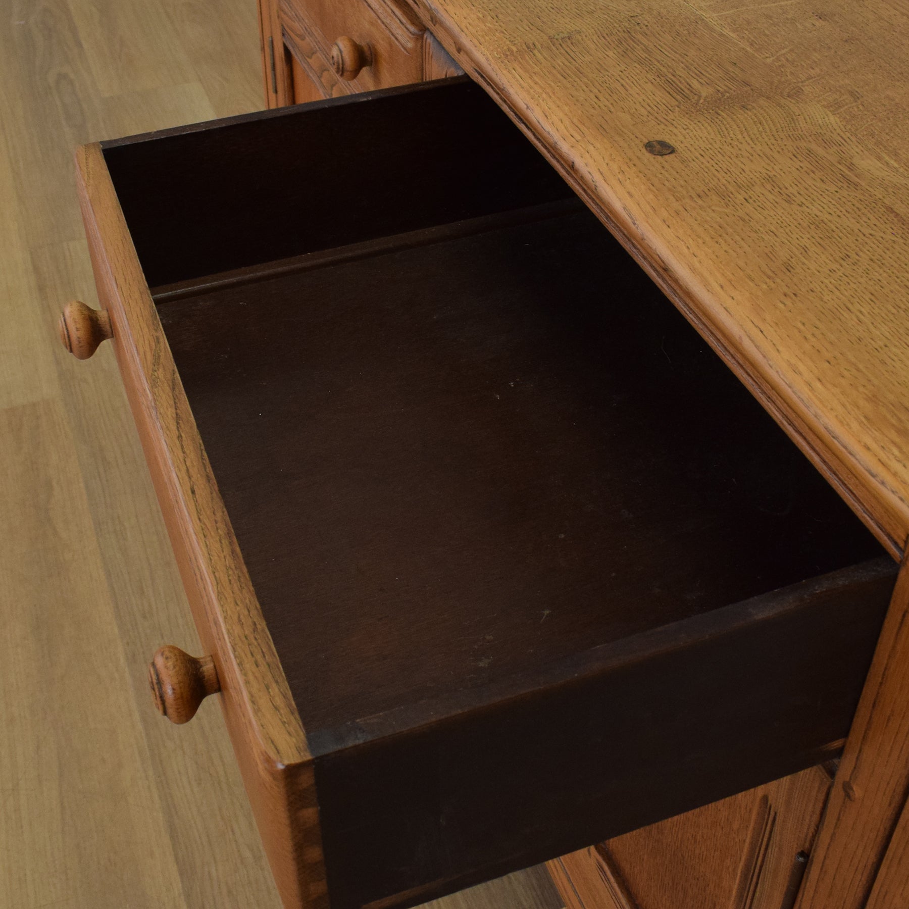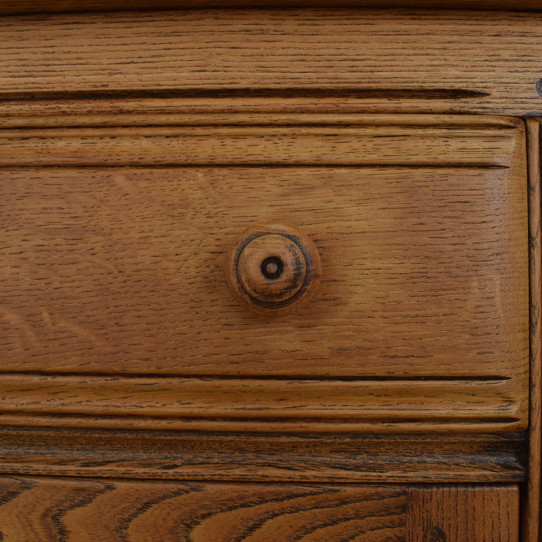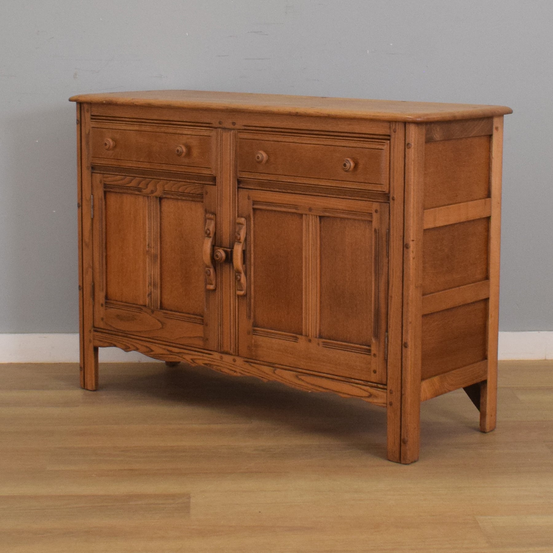 Crafted in elm, this sideboard showcases the beautiful natural grain that Ercol furniture is known for. The piece includes two upper drawers with turned wooden knobs, sitting above a two-door cupboard fitted with the brand's distinctive wooden latches. The gently curved edges and inset panel detailing lend it a soft yet structured appearance. Inside, a full-width shelf provides flexible storage, ideal for crockery, linens, or general household items.