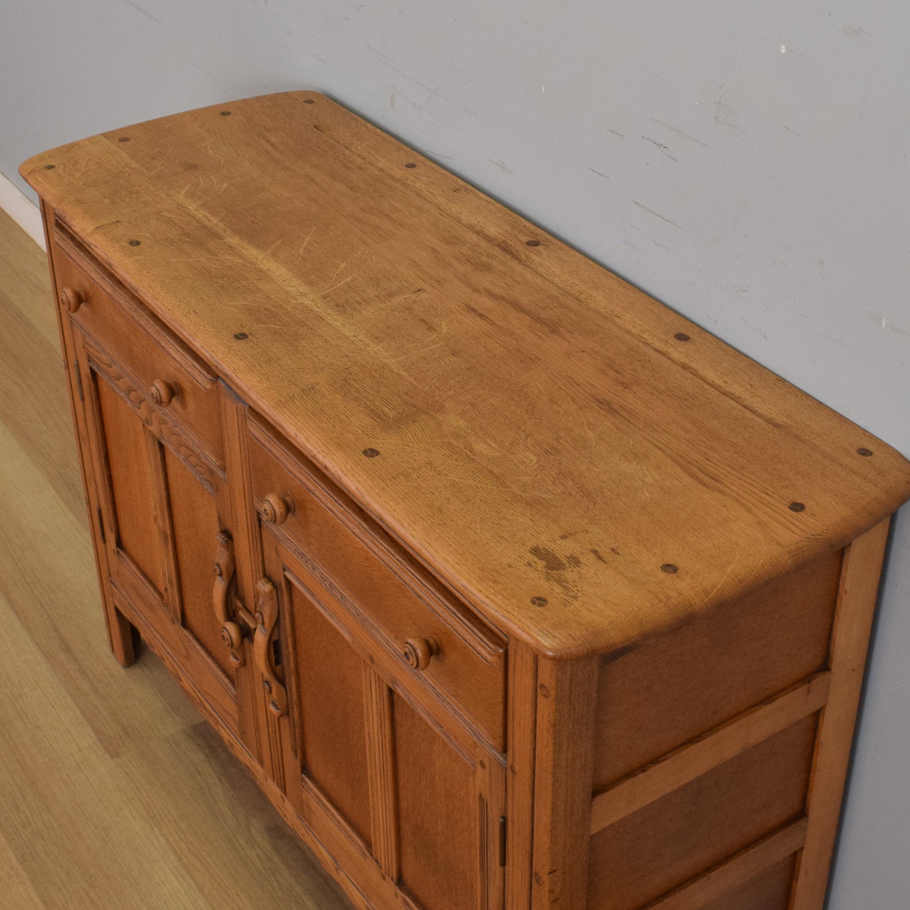 The previous finish has been fully stripped back, and multiple coats of clear matte lacquer have been applied to enhance the warmth and depth of the elm grain while offering durable protection. A small area of staining is visible on the top surface, as shown in the photograph. This sideboard is made mostly from elm, with plywood used for the back and drawer bases.