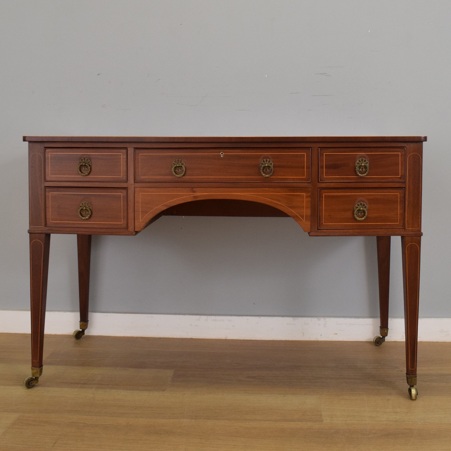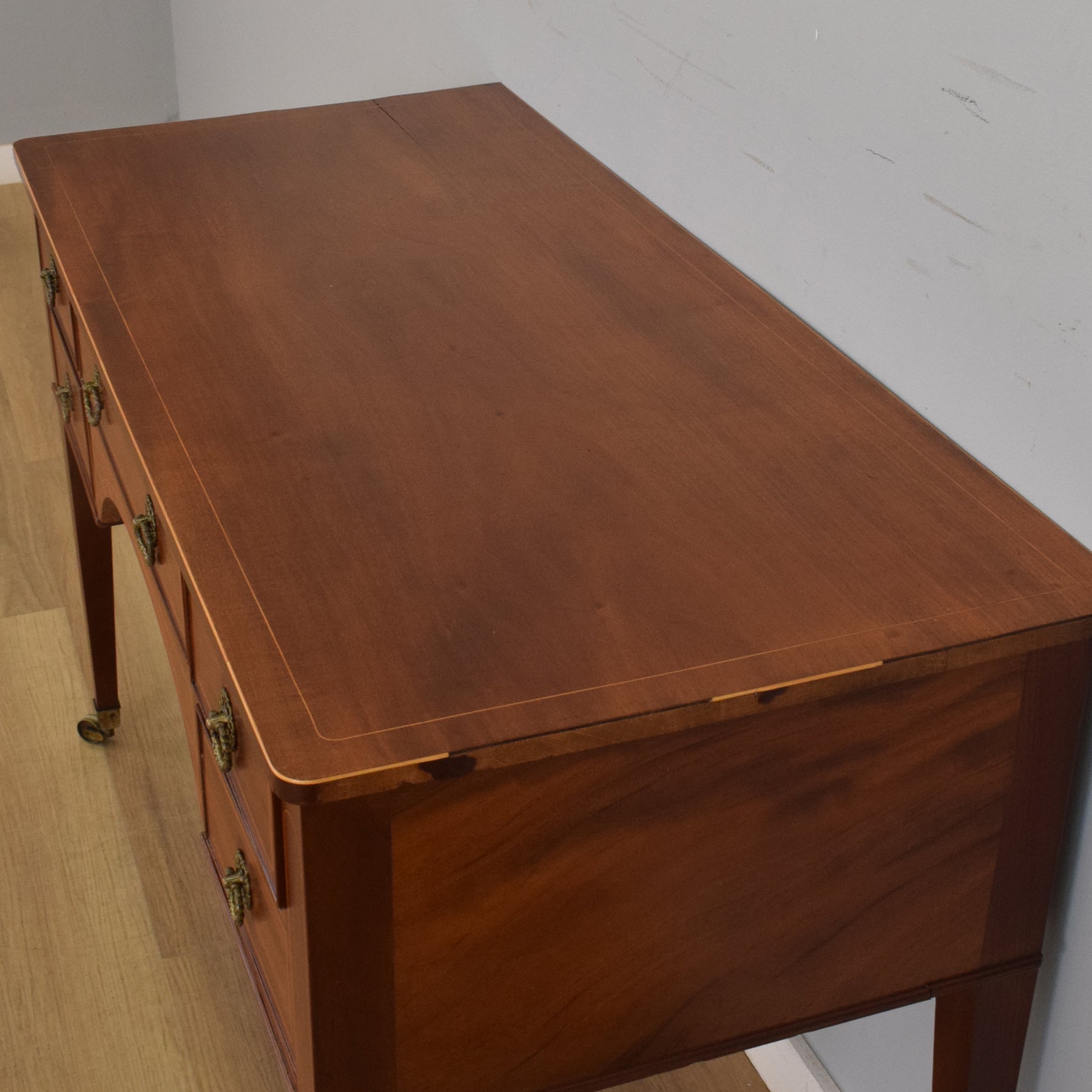 The previous darker finish has been stripped, and multiple coats of hard-wearing matte lacquer have been applied, giving the piece a more natural look while also protecting the wood and bringing out the grain. There is a small crack to the rear corner of the work surface, and the centre drawer base has an old ink stain. Additionally, a section of inlay is missing on the right-hand side. This desk is primarily made from solid mahogany, with some veneer sections, and features a plywood back and plywood drawer bases.