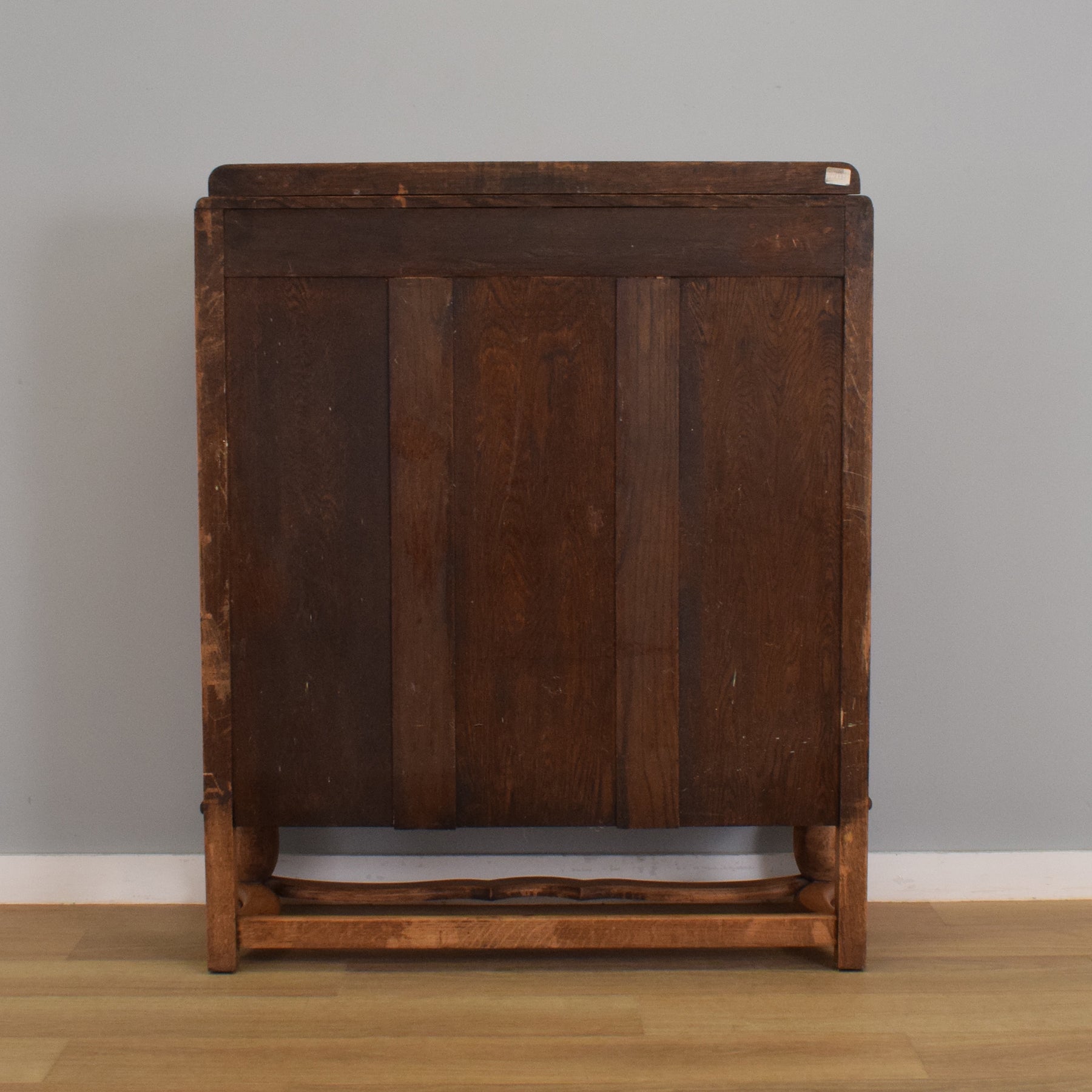 The previous darker finish has been stripped, and several coats of hard-wearing matte lacquer have been applied, resulting in a long-lasting and practical finish that enhances the natural oak grain. This item is made entirely from oak.