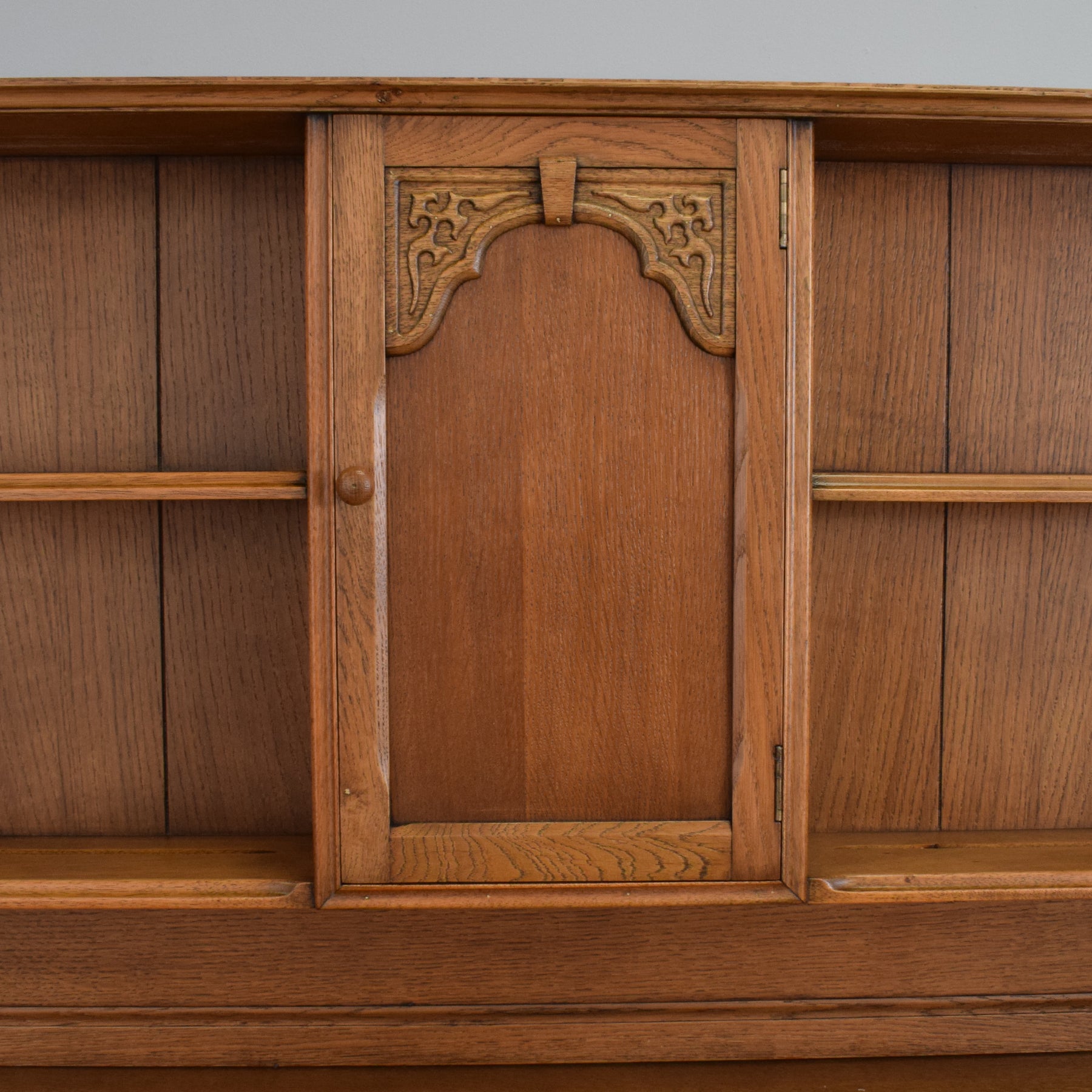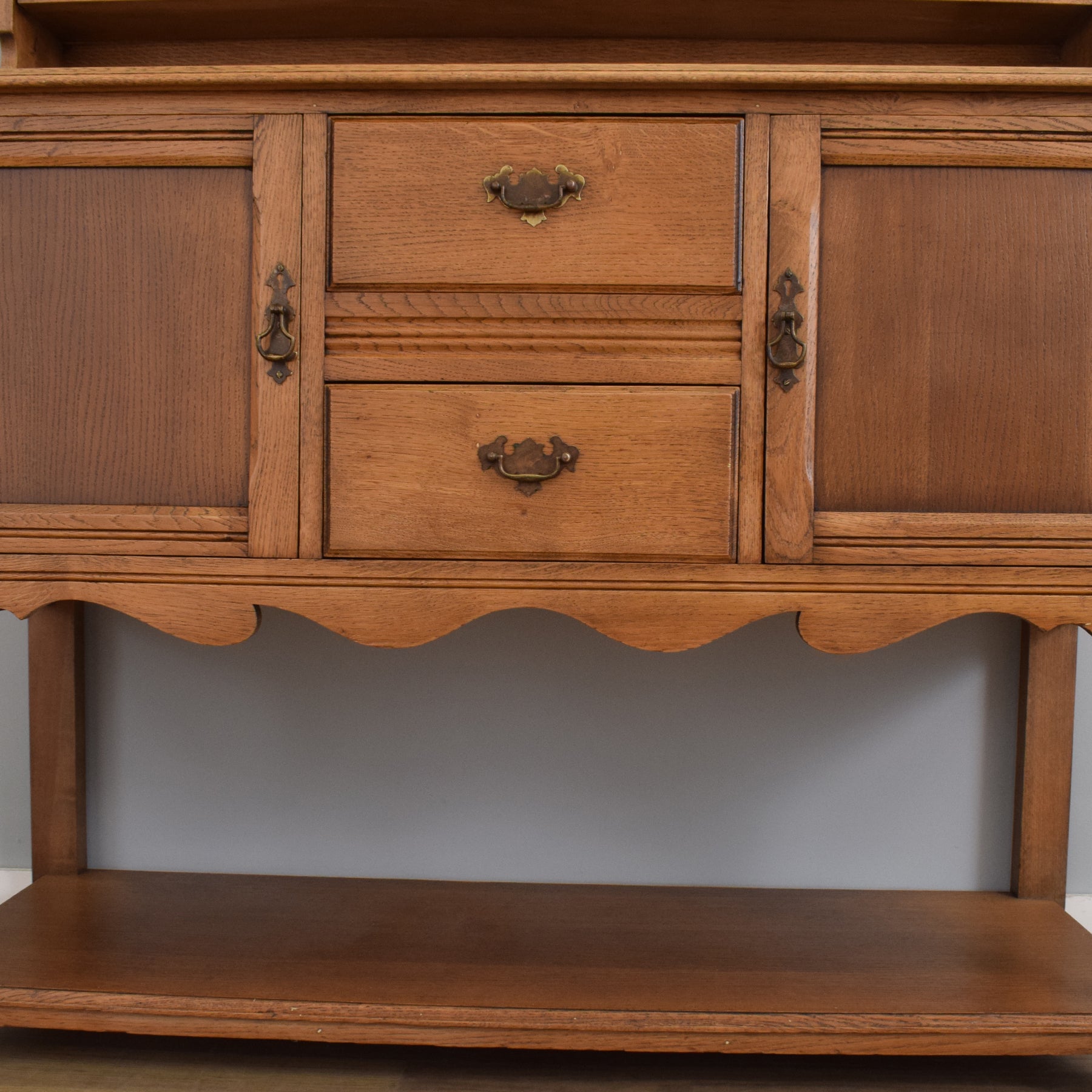 This dresser features an open upper section with fixed shelves, scalloped side supports, and a central cupboard with decorative moulding. Below, the base is fitted with two drawers and two cupboards, offering versatile storage for tableware, linens, or household items. The shaped apron and turned front legs add character, while the wide lower shelf provides additional space for baskets or display.