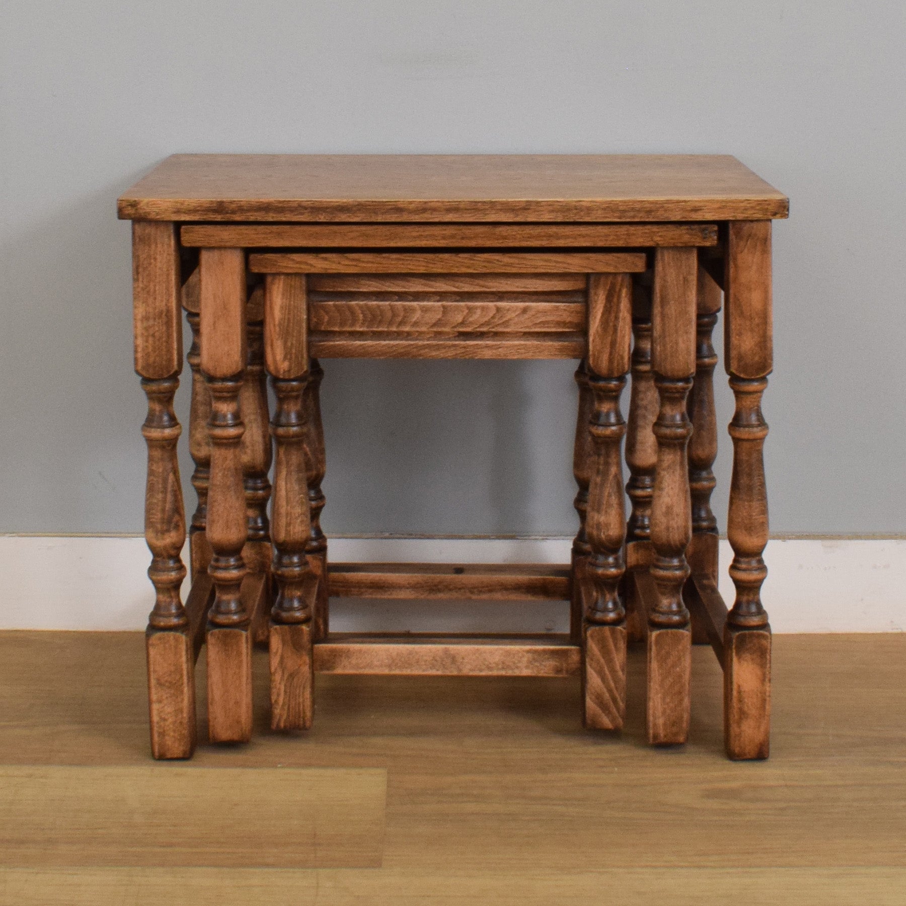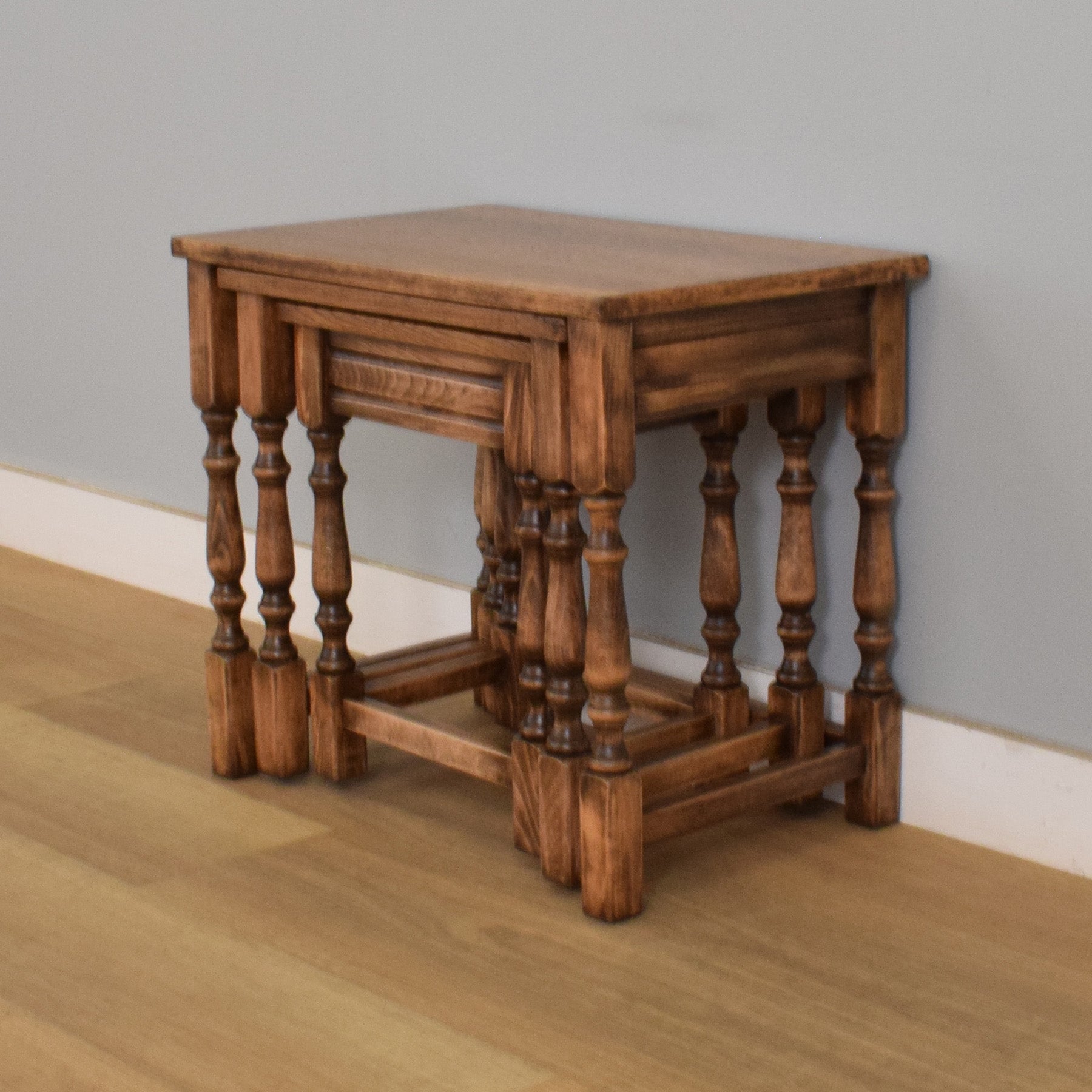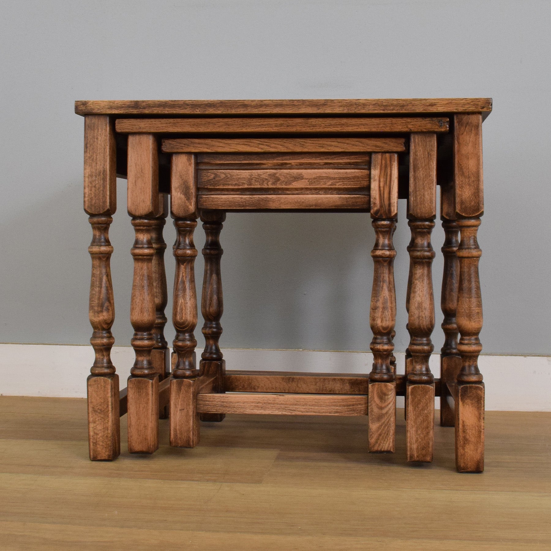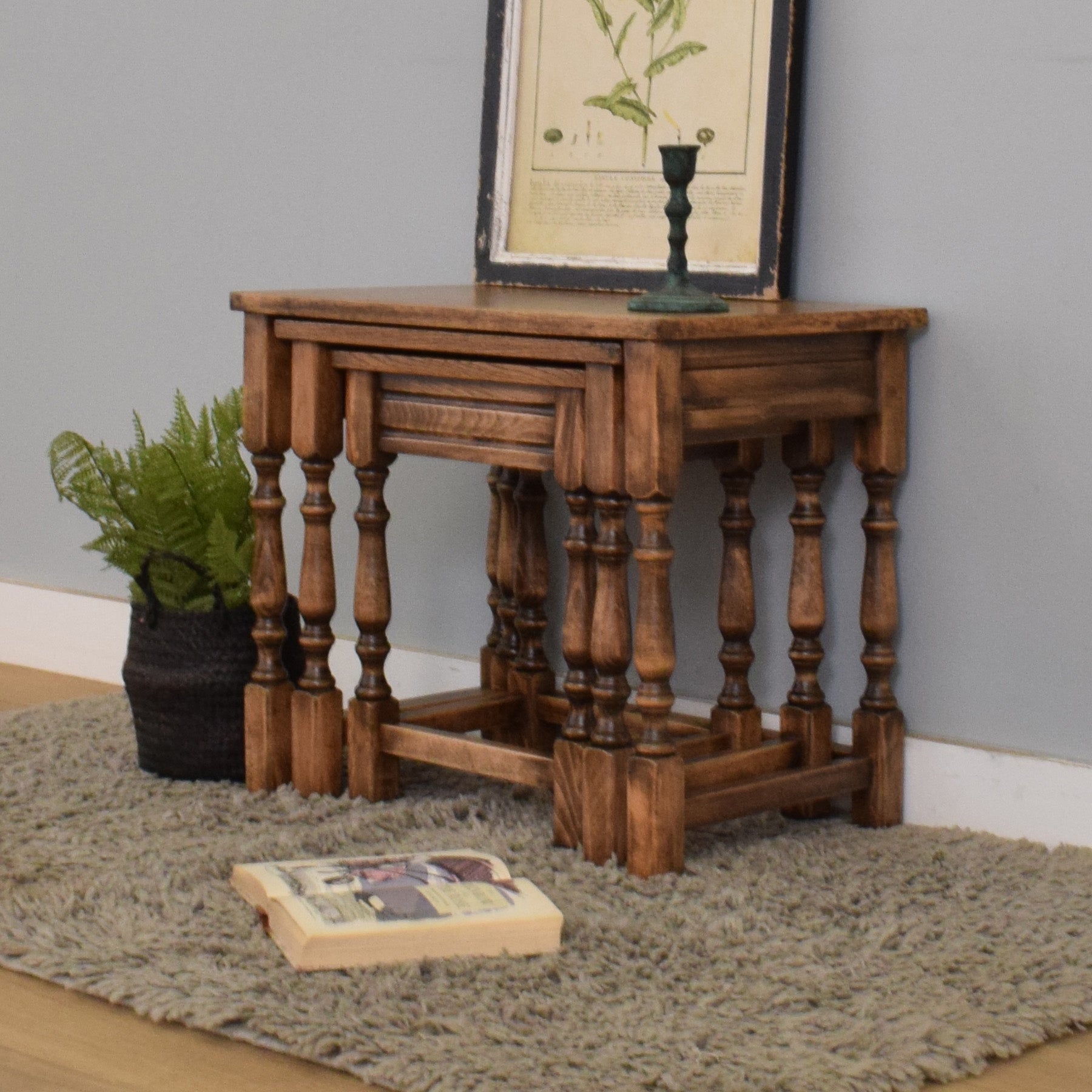 This charming set consists of three solid oak tables that neatly nest together, each featuring turned legs and a rich grain pattern on the surface. The traditional design, combined with the sturdy oak construction, ensures durability and classic appeal. When needed, the smaller tables slide out easily, providing extra surface space for drinks, books, or decorative items.