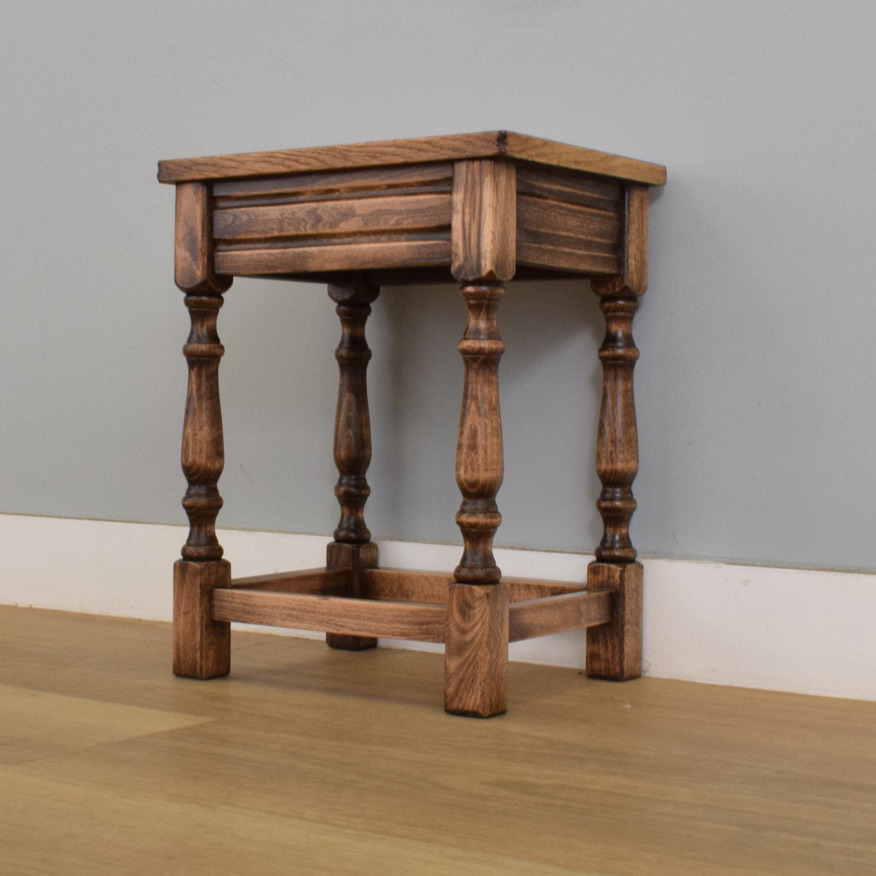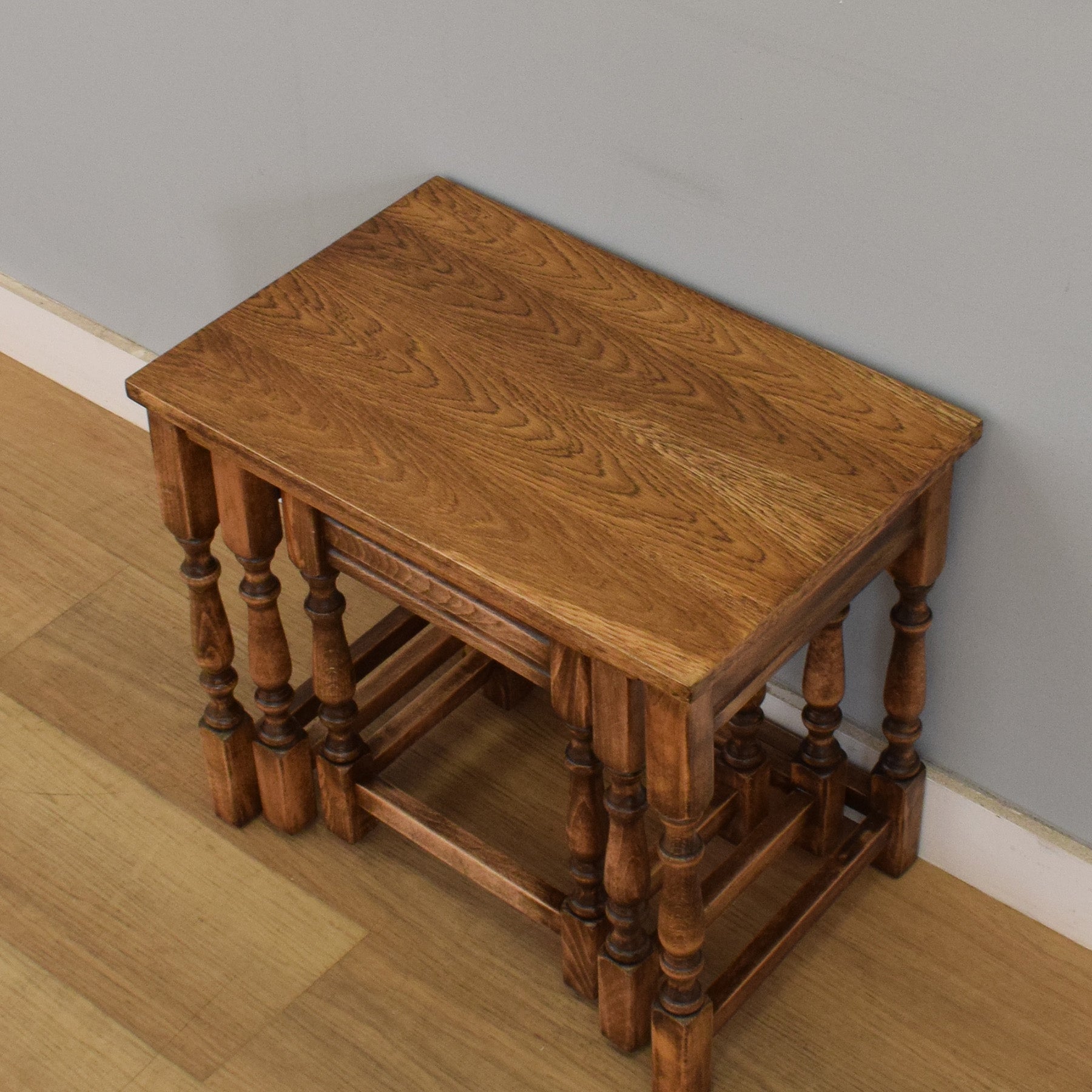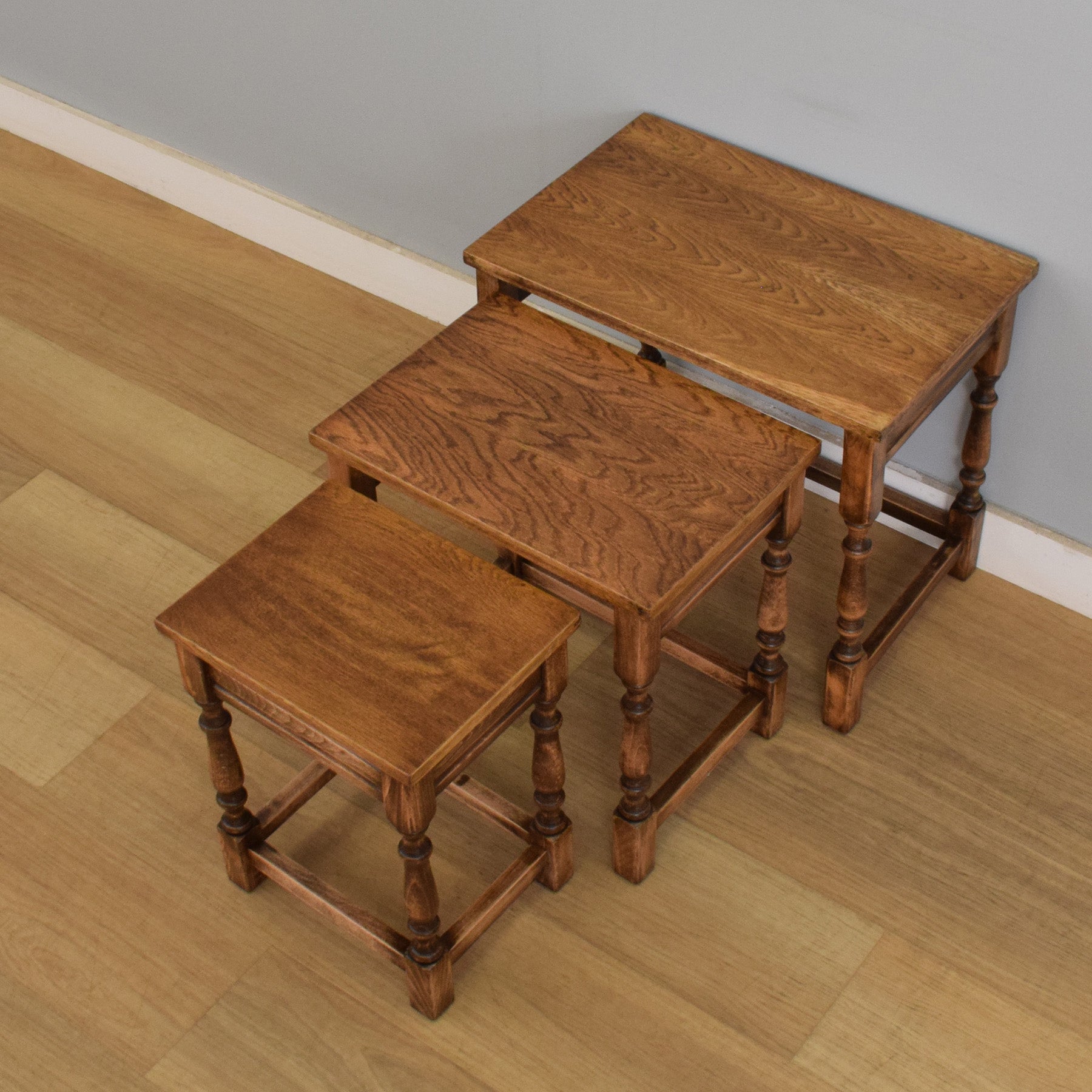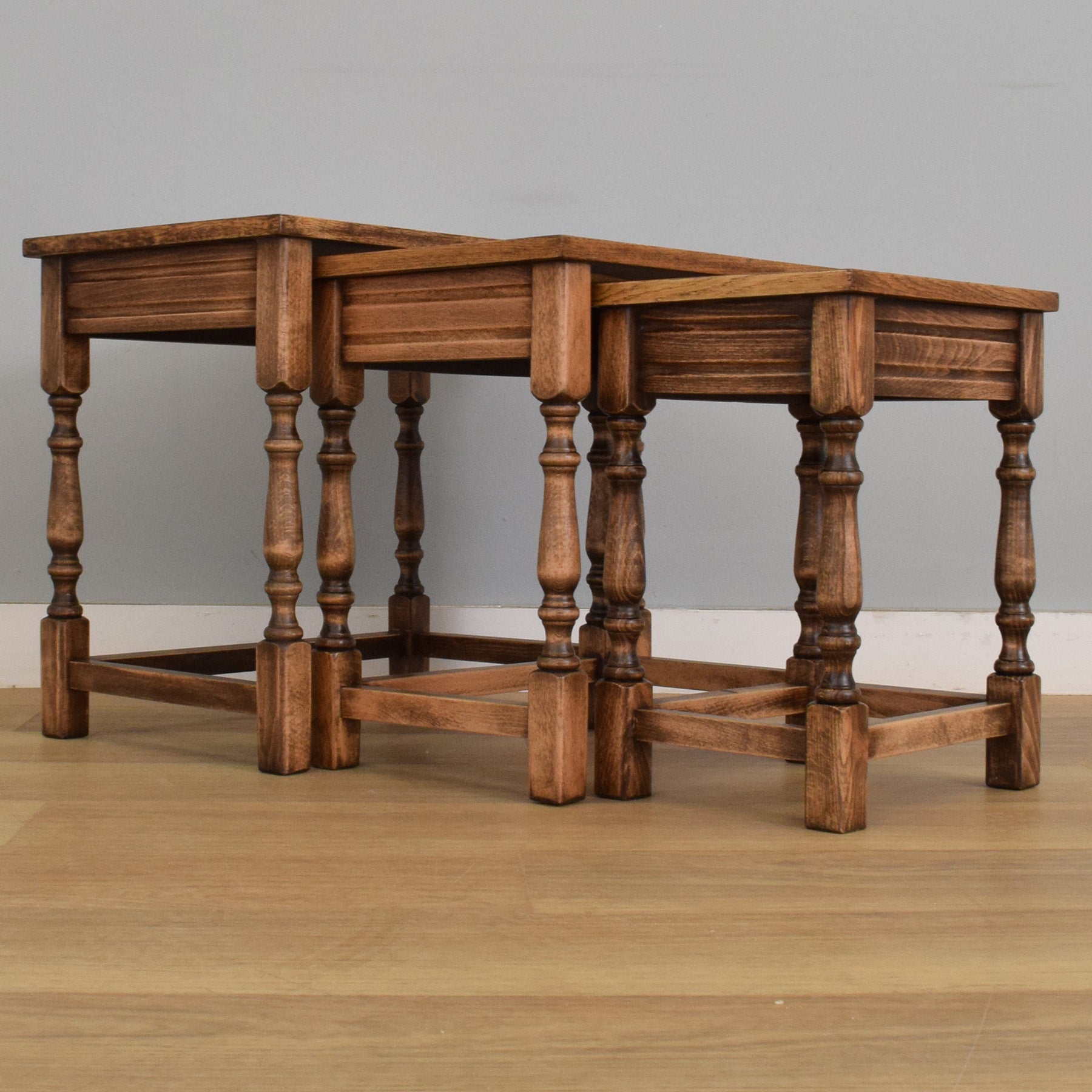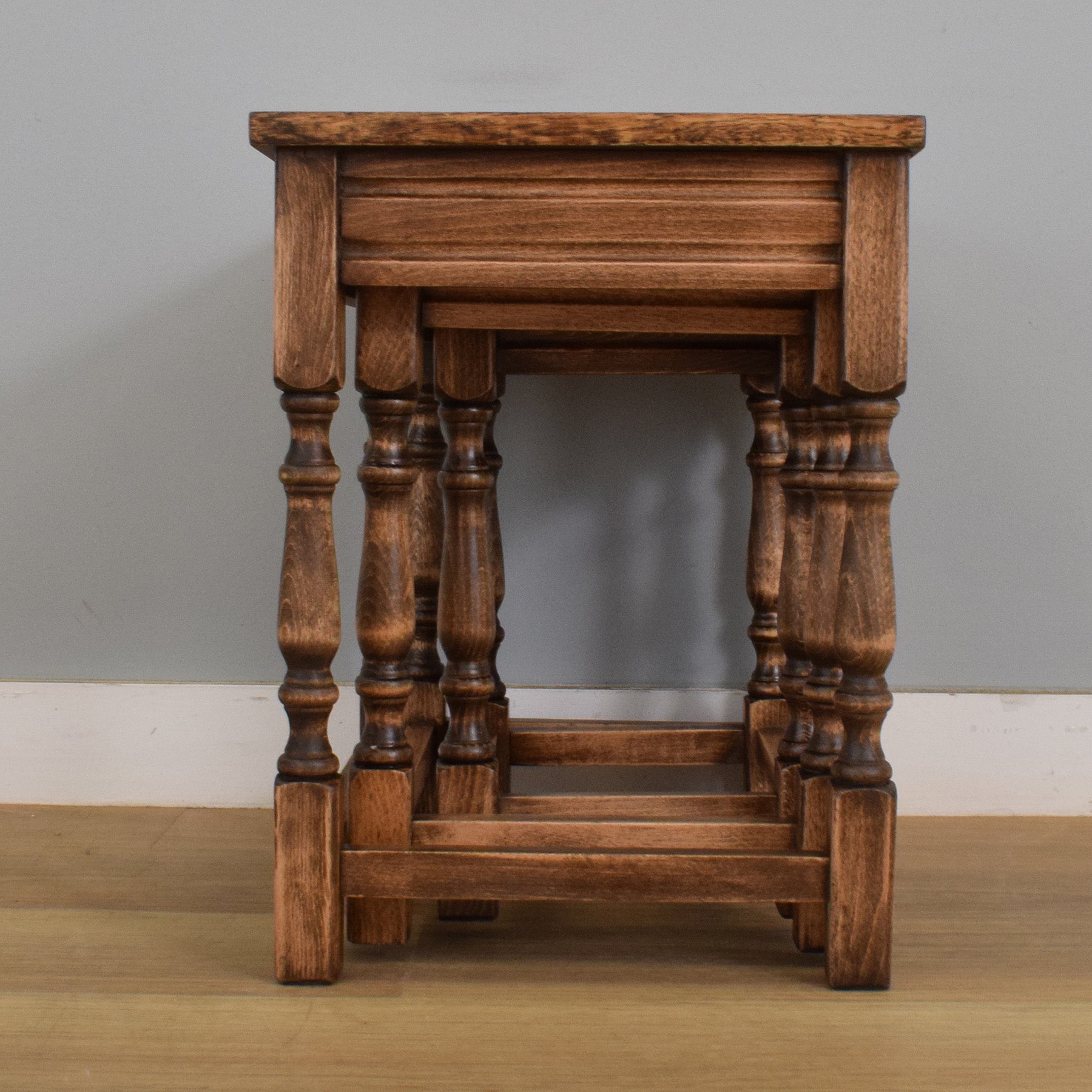 This charming set consists of three solid oak tables that neatly nest together, each featuring turned legs and a rich grain pattern on the surface. The traditional design, combined with the sturdy oak construction, ensures durability and classic appeal. When needed, the smaller tables slide out easily, providing extra surface space for drinks, books, or decorative items.