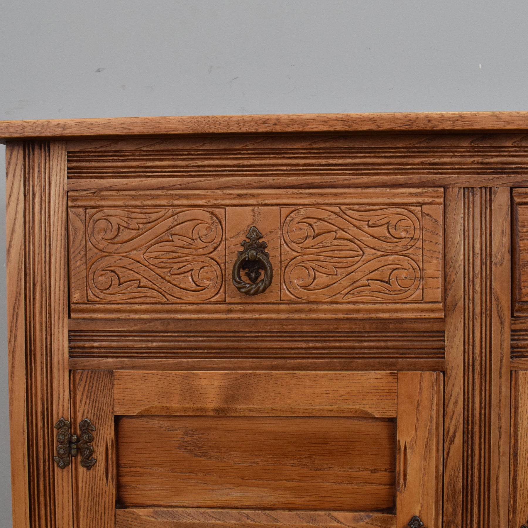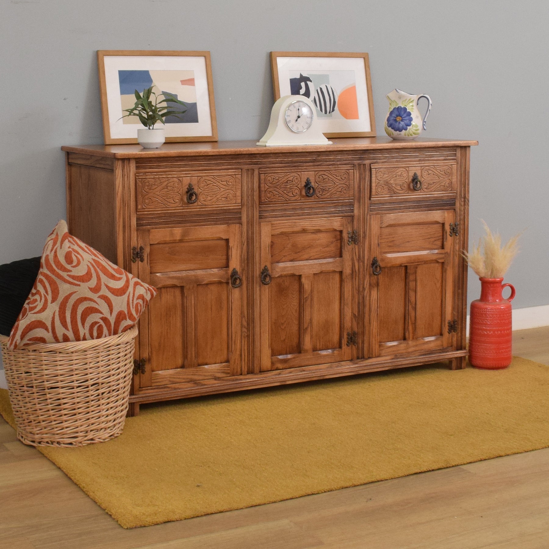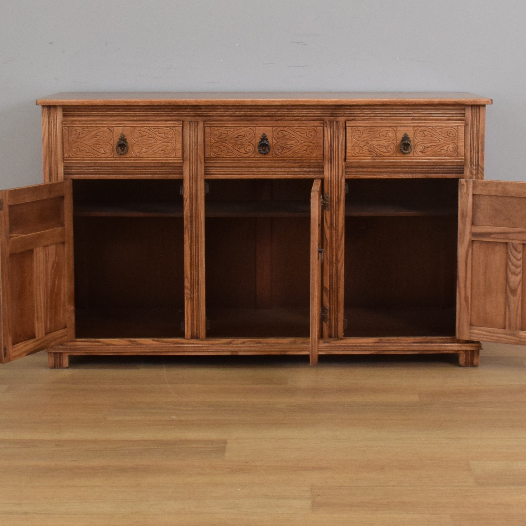 This traditionally styled sideboard features three spacious drawers over three cupboard doors, all set within a solid, well-proportioned frame. The upper drawers are fronted with beautifully carved scrolling detail, adding a touch of craftsmanship to the design. Brass drop handles and decorative hinges complete the classic aesthetic. Internally, the cupboards offer ample space for storing tableware, linens, or other household items.
