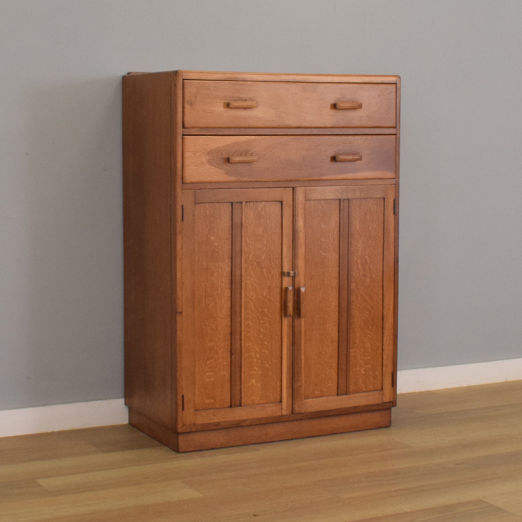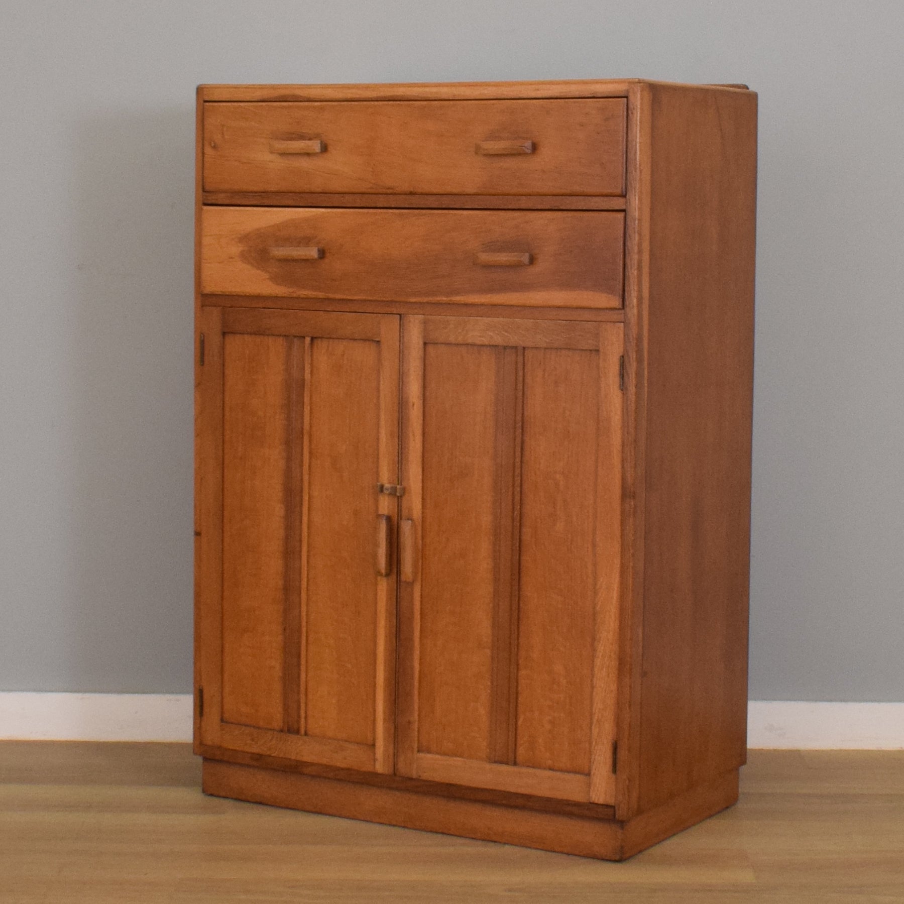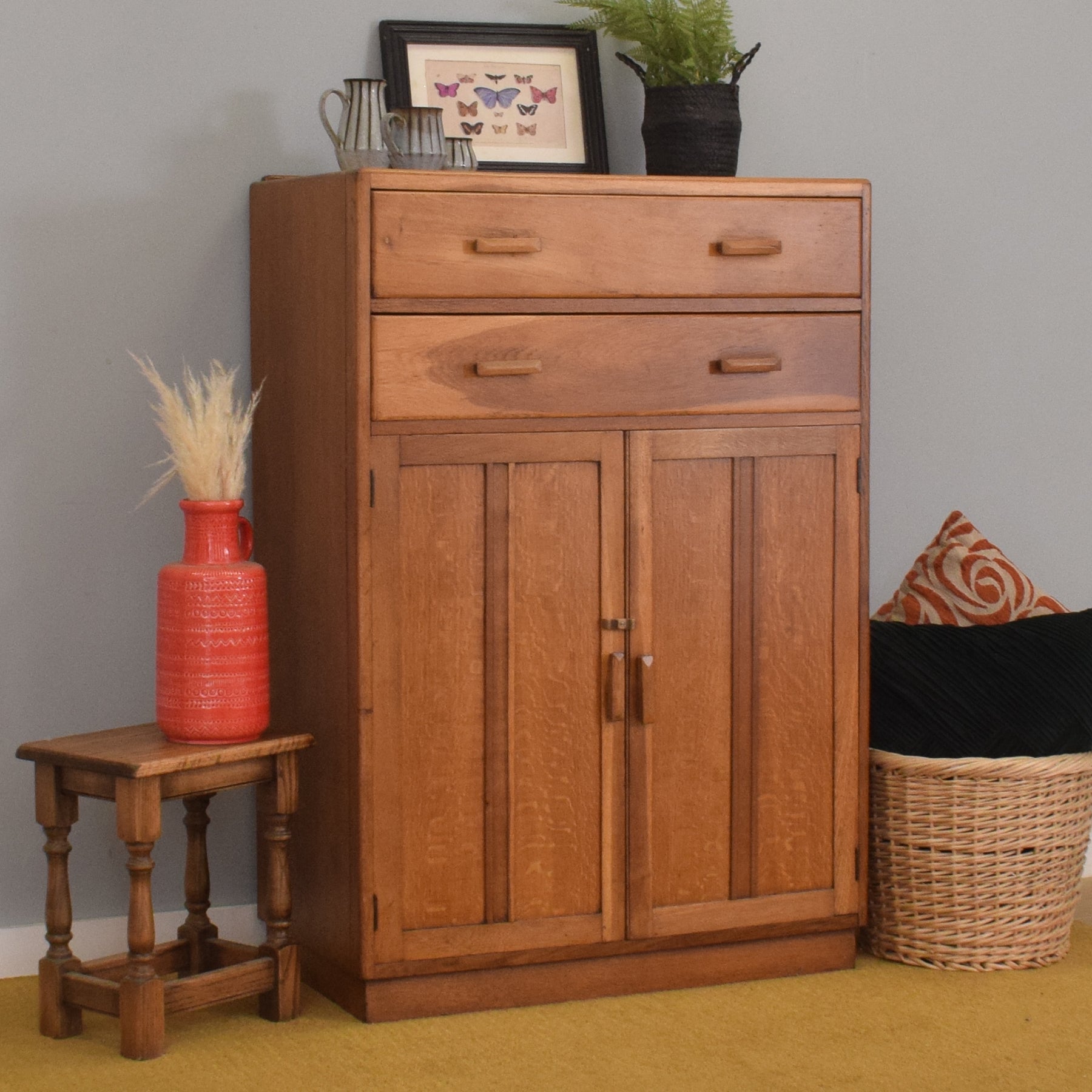 This mid-century tallboy features a clean-lined design with two wide drawers above a double-door cupboard fitted with a fixed internal shelf. The simple wooden handles, gently rounded edges, and warm tone give the piece a classic and understated appearance, suitable for both traditional and contemporary interiors. A small wooden catch secures the cupboard doors, maintaining the piece’s original charm and functionality.