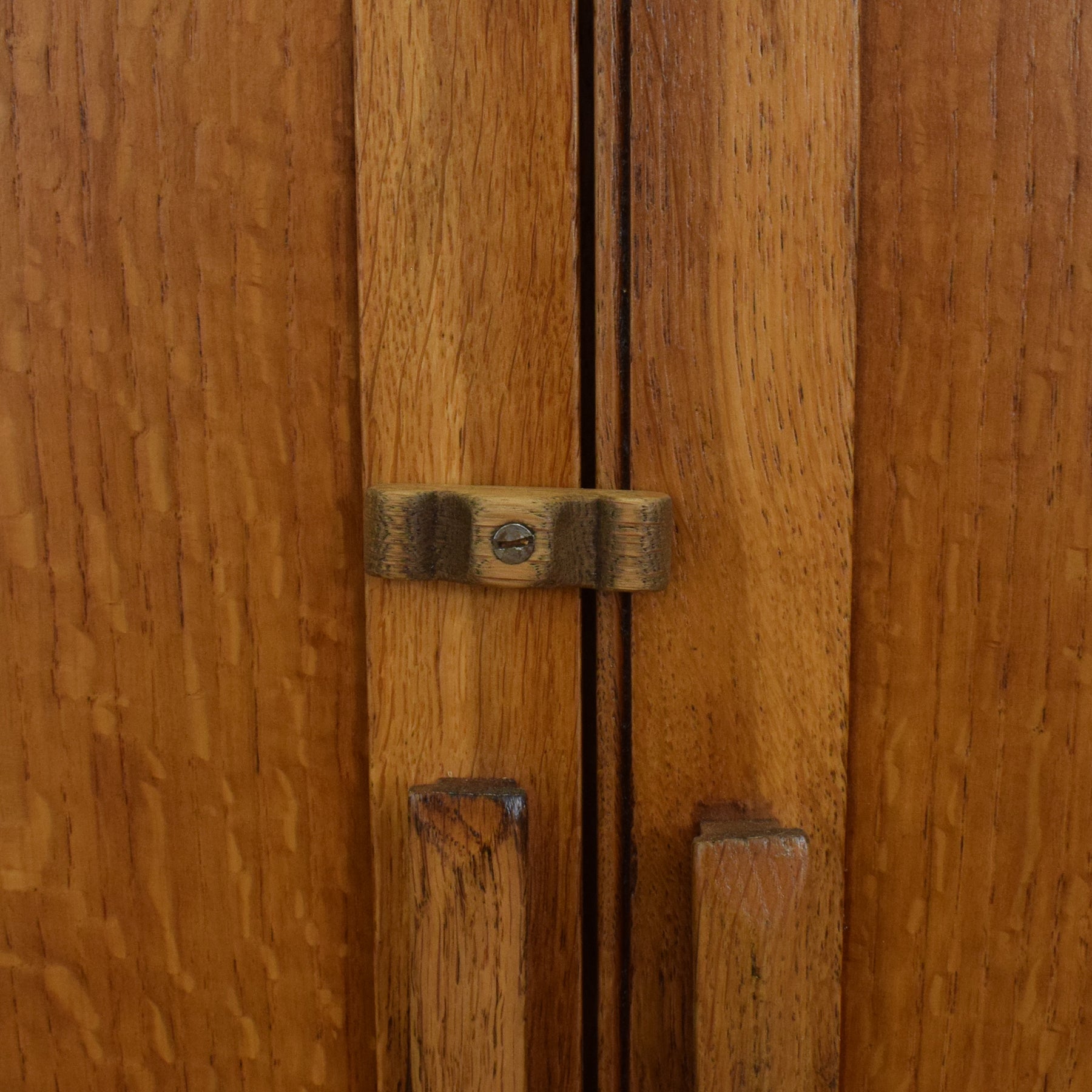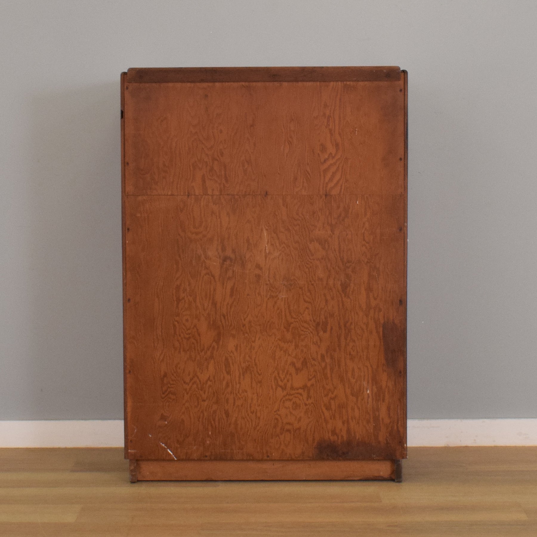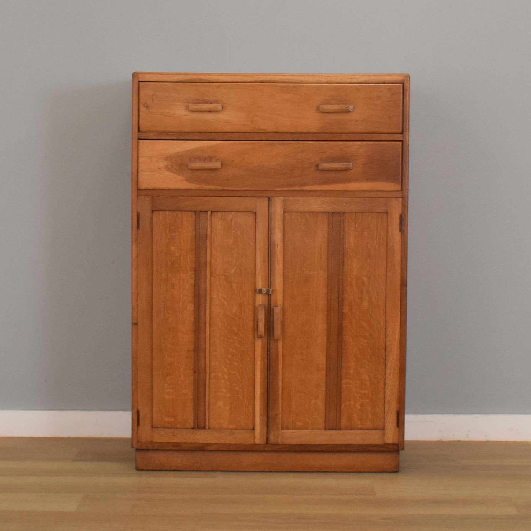 This mid-century tallboy features a clean-lined design with two wide drawers above a double-door cupboard fitted with a fixed internal shelf. The simple wooden handles, gently rounded edges, and warm tone give the piece a classic and understated appearance, suitable for both traditional and contemporary interiors. A small wooden catch secures the cupboard doors, maintaining the piece’s original charm and functionality.