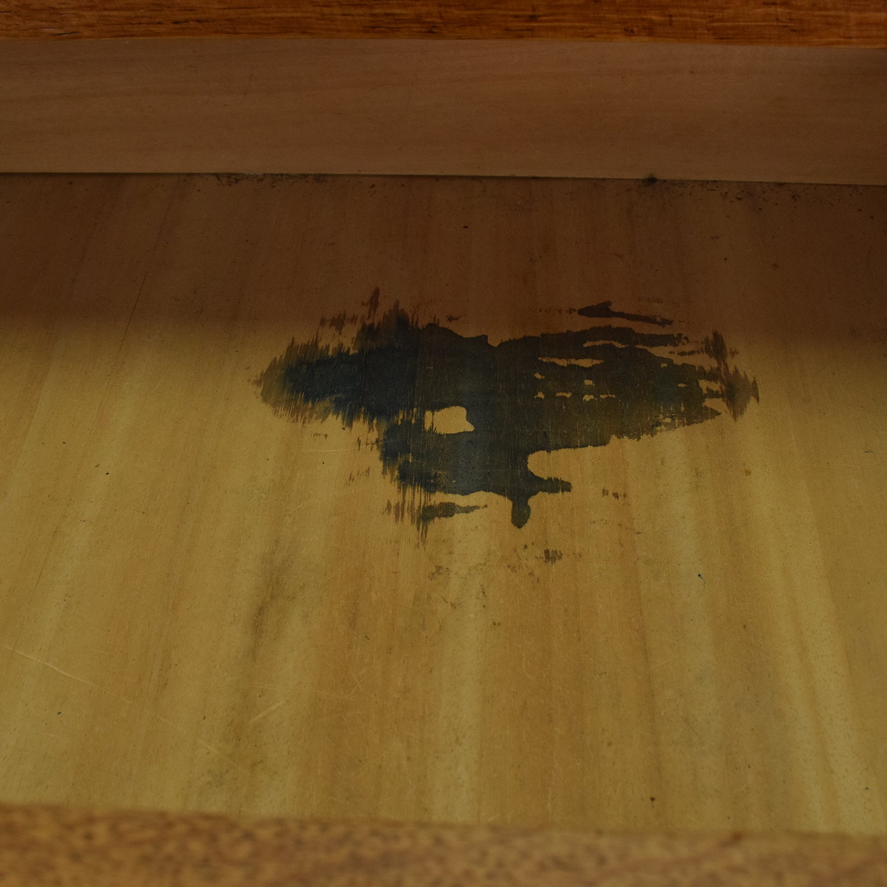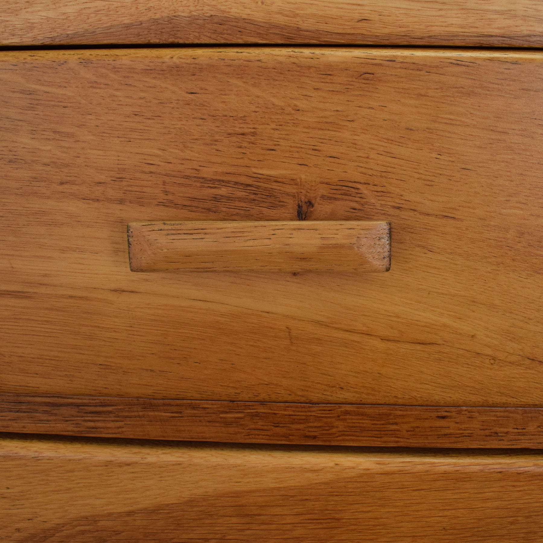The previous finish has been stripped, and multiple coats of hard-wearing matte lacquer have been applied, providing a durable and long-lasting finish while highlighting the natural grain of the oak. There is a dark ink stain to the base of one of the drawers, which remains visible. This item is made primarily from oak veneer with some solid oak elements, while the back and drawer bases are constructed from plywood.
