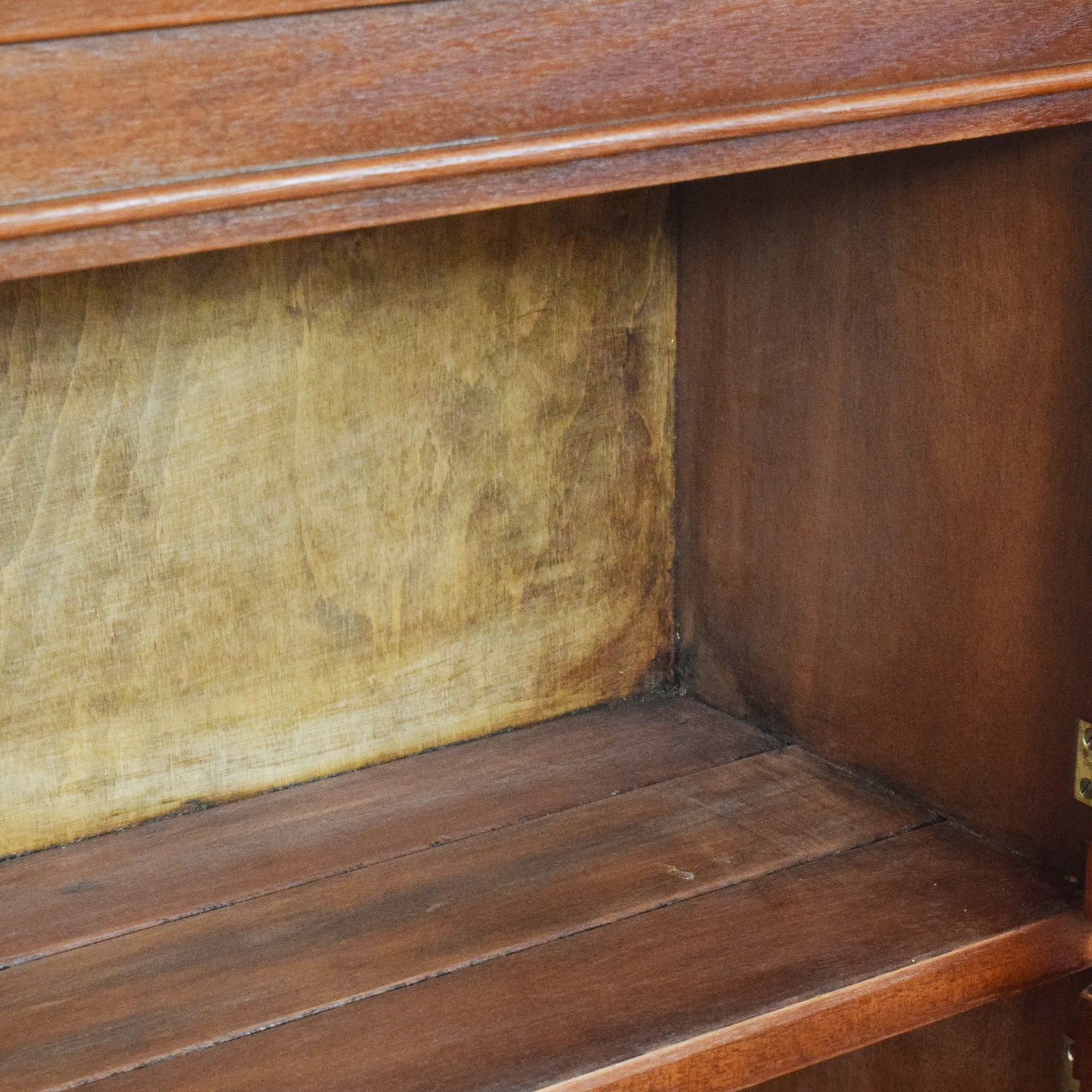 The previous finish has been carefully stripped, and multiple coats of hard-wearing matte lacquer have been applied. This process has revived the natural tones of the mahogany while ensuring a durable and lasting surface. A filler repair is visible to the left of the glazed doors, as shown in the photographs, but this does not detract from the overall appeal. The back panel of the bookcase is constructed from plywood. All three sections have been secured together, making one piece.