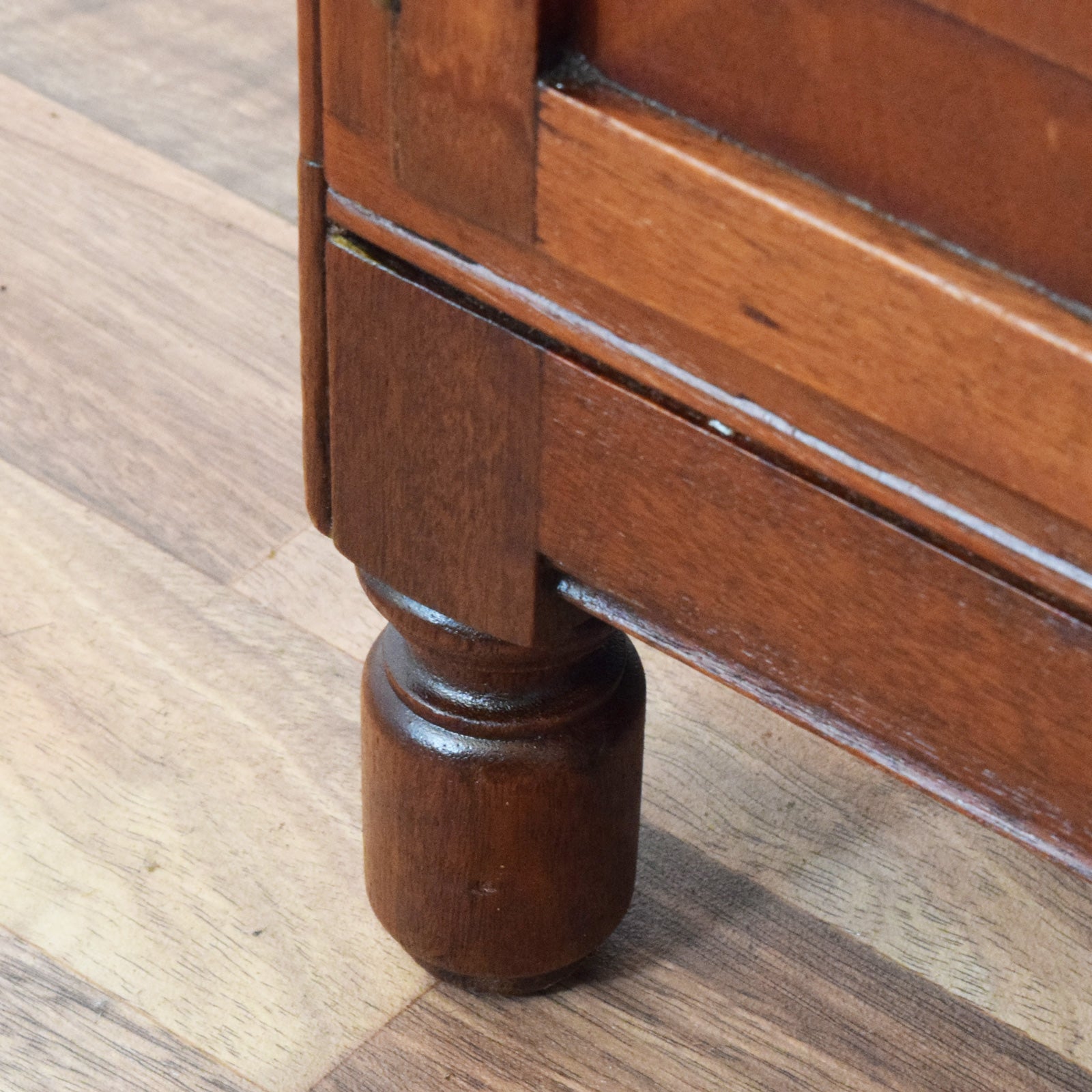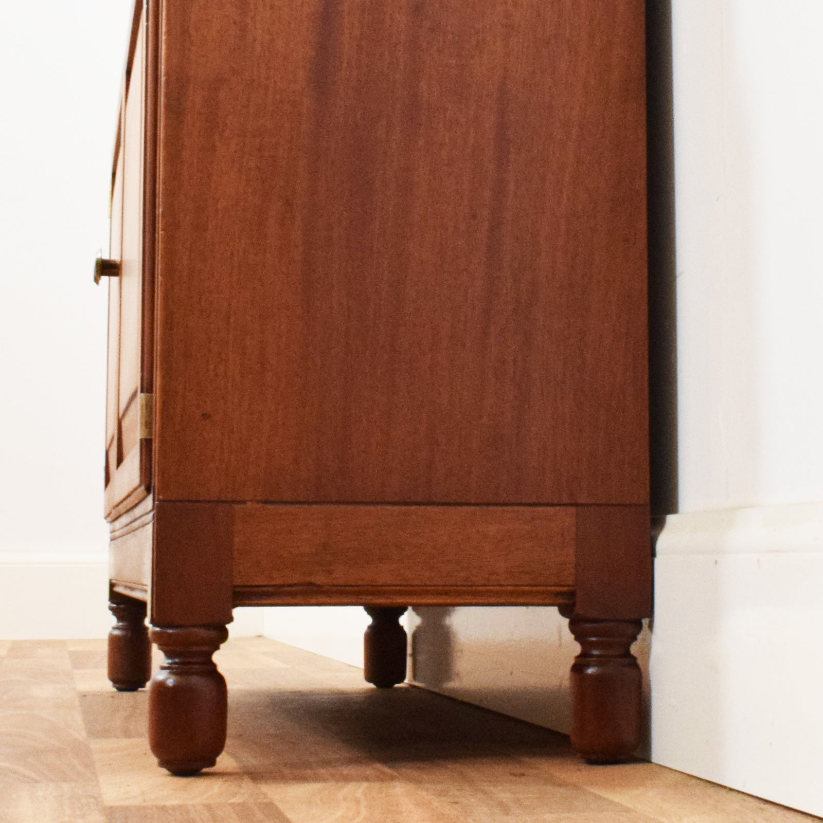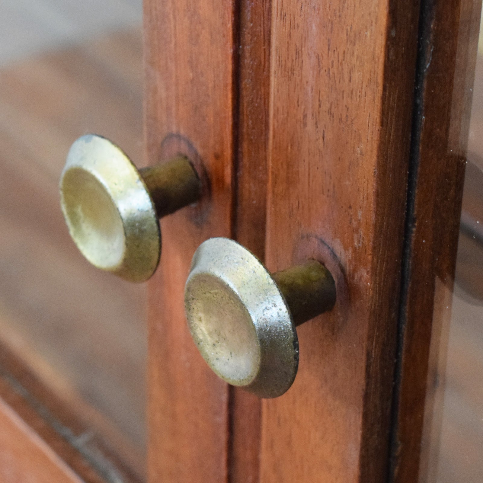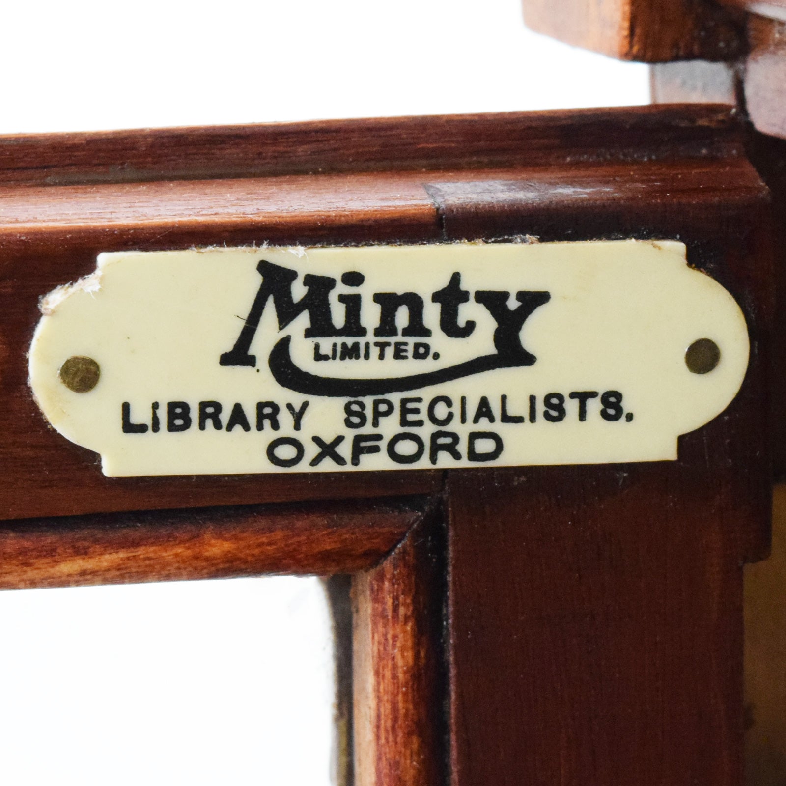 This bookcase is crafted in mahogany with a rich, warm finish and features three sections: glazed doors to the upper and middle tiers, and panelled wooden doors to the lower section. Each opens to reveal adjustable shelving, allowing for flexible storage options. Brass knob handles add a simple yet traditional touch, while turned feet provide stability and a subtle decorative detail. Inside the top door sits the original maker’s plaque from Minty Ltd., Library Specialists of Oxford, giving the piece an appealing provenance.