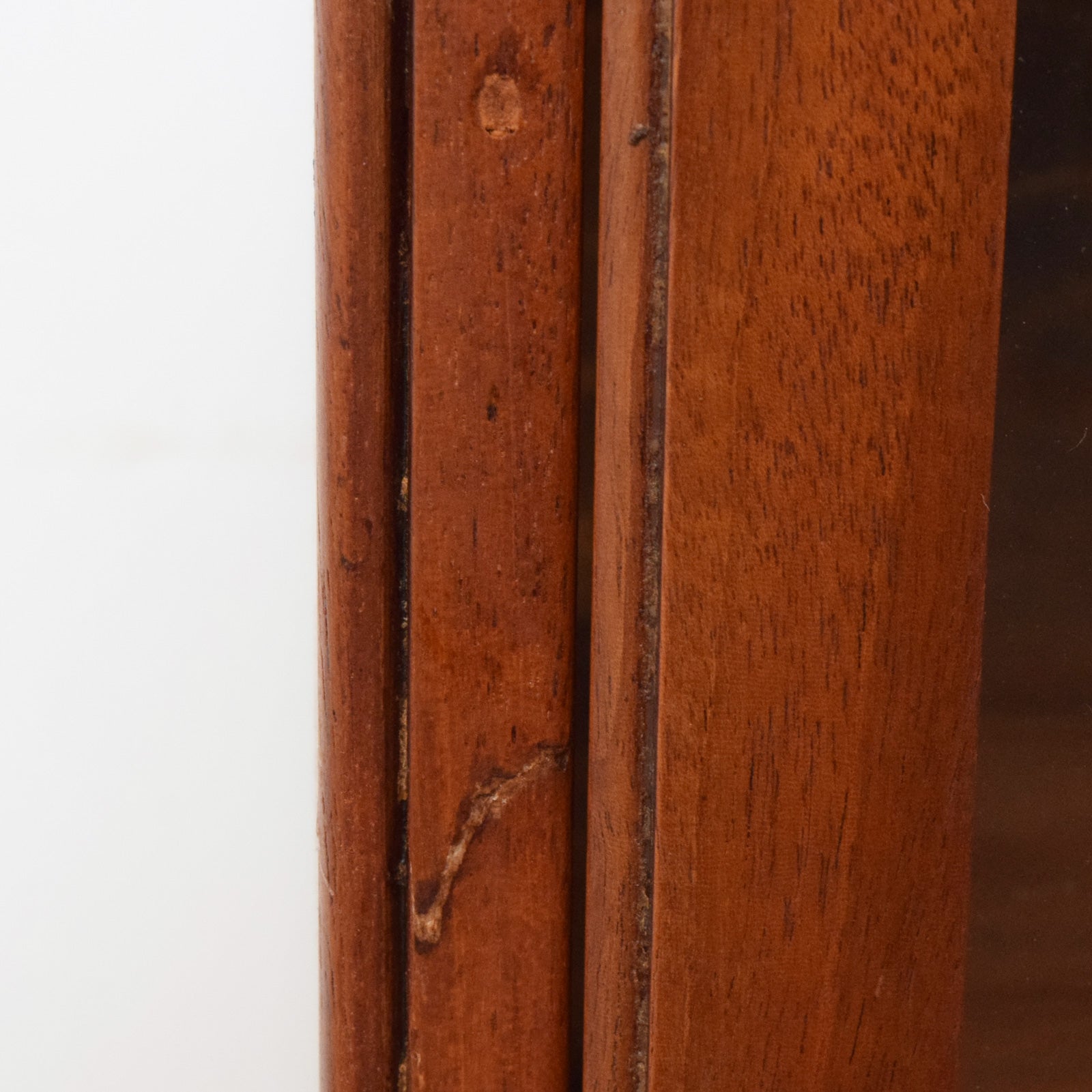 The previous finish has been carefully stripped, and multiple coats of hard-wearing matte lacquer have been applied. This process has revived the natural tones of the mahogany while ensuring a durable and lasting surface. A filler repair is visible to the left of the glazed doors, as shown in the photographs, but this does not detract from the overall appeal. The back panel of the bookcase is constructed from plywood. All three sections have been secured together, making one piece.