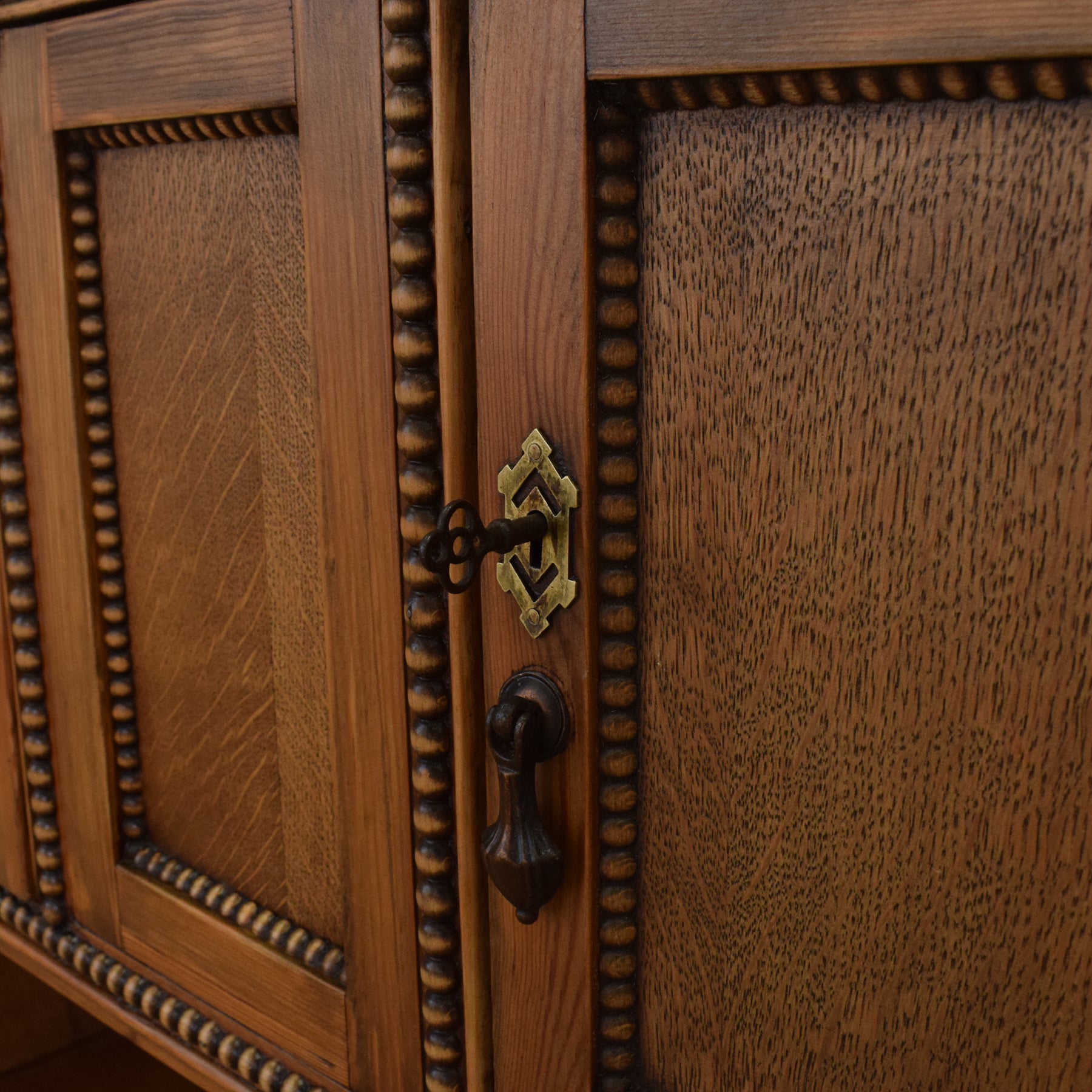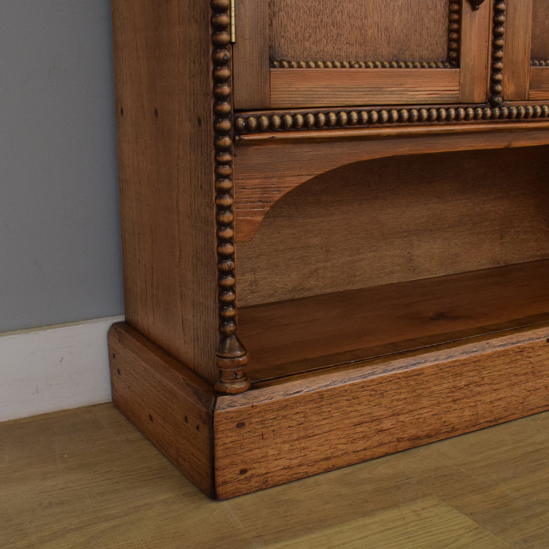 This oak bookcase has a traditional look with attractive bobbin-style detailing around the edges and shelves. The layout offers two generous open shelves above, a two-door cupboard for tidier storage, and a useful open section at the bottom. The top two shelves each provide 20cm of clearance, with 18cm on the lower open shelf—ideal for paperbacks, smaller hardbacks, ornaments, and storage baskets. Brass escutcheons and drop handles complete the period feel.