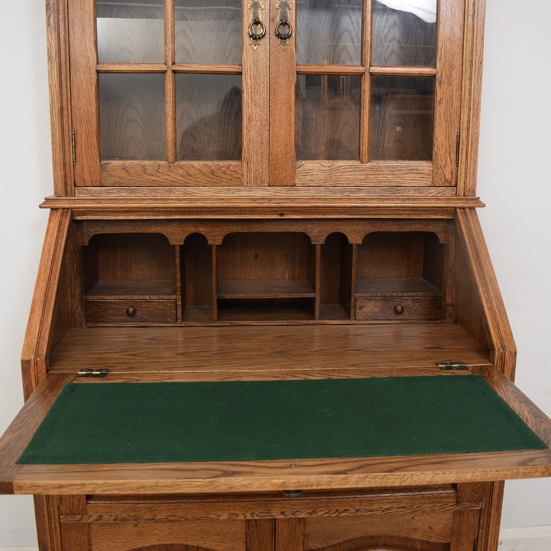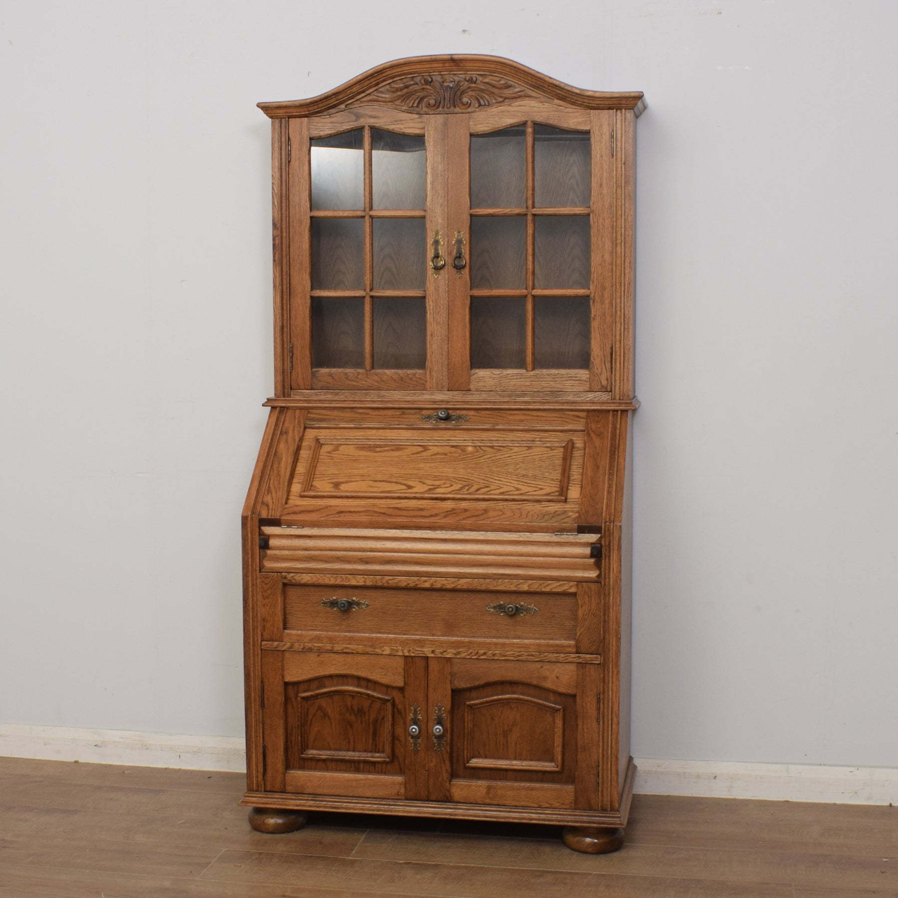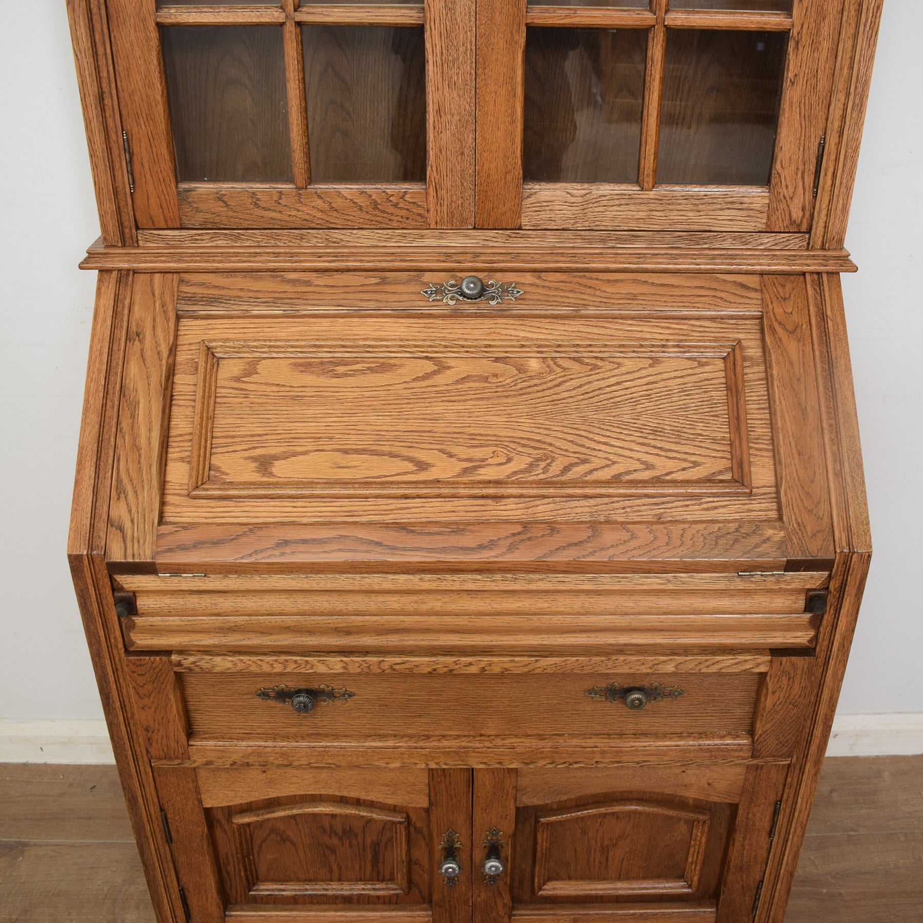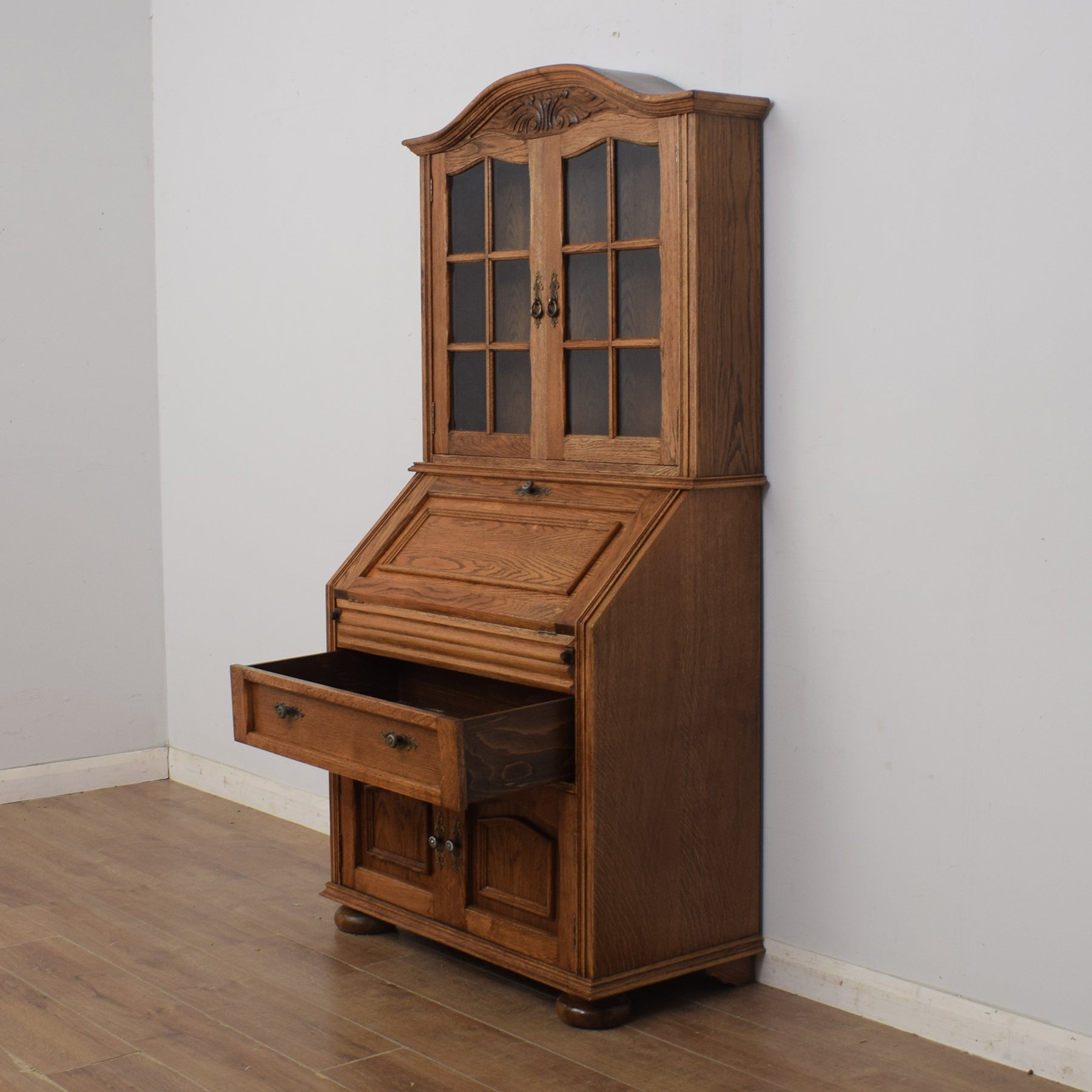 The upper section boasts a glazed bookcase with two adjustable shelves, along with a spacious bottom shelf, catering to various book sizes and cherished ornaments. This seamlessly integrates with the traditional bureau beneath it.