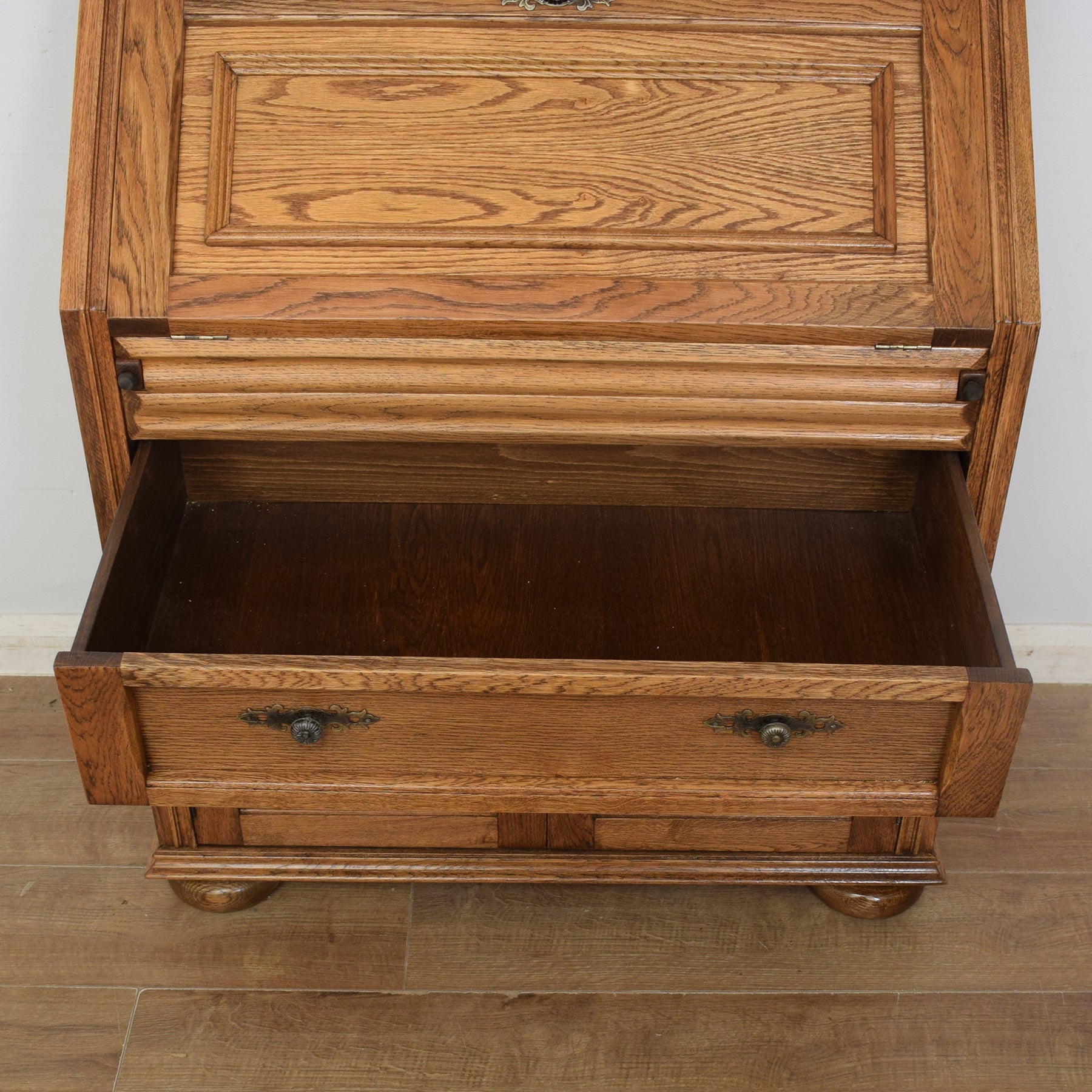 The previous darker stain has been stripped, and multiple coats of hard-wearing matte lacquer have been applied, providing a durable, long-lasting finish while also accentuating the natural oak grain. This bureau bookcase is constructed predominantly from compressed wood covered in an attractive oak veneer. Plywood has been used for the back panels and drawer base.